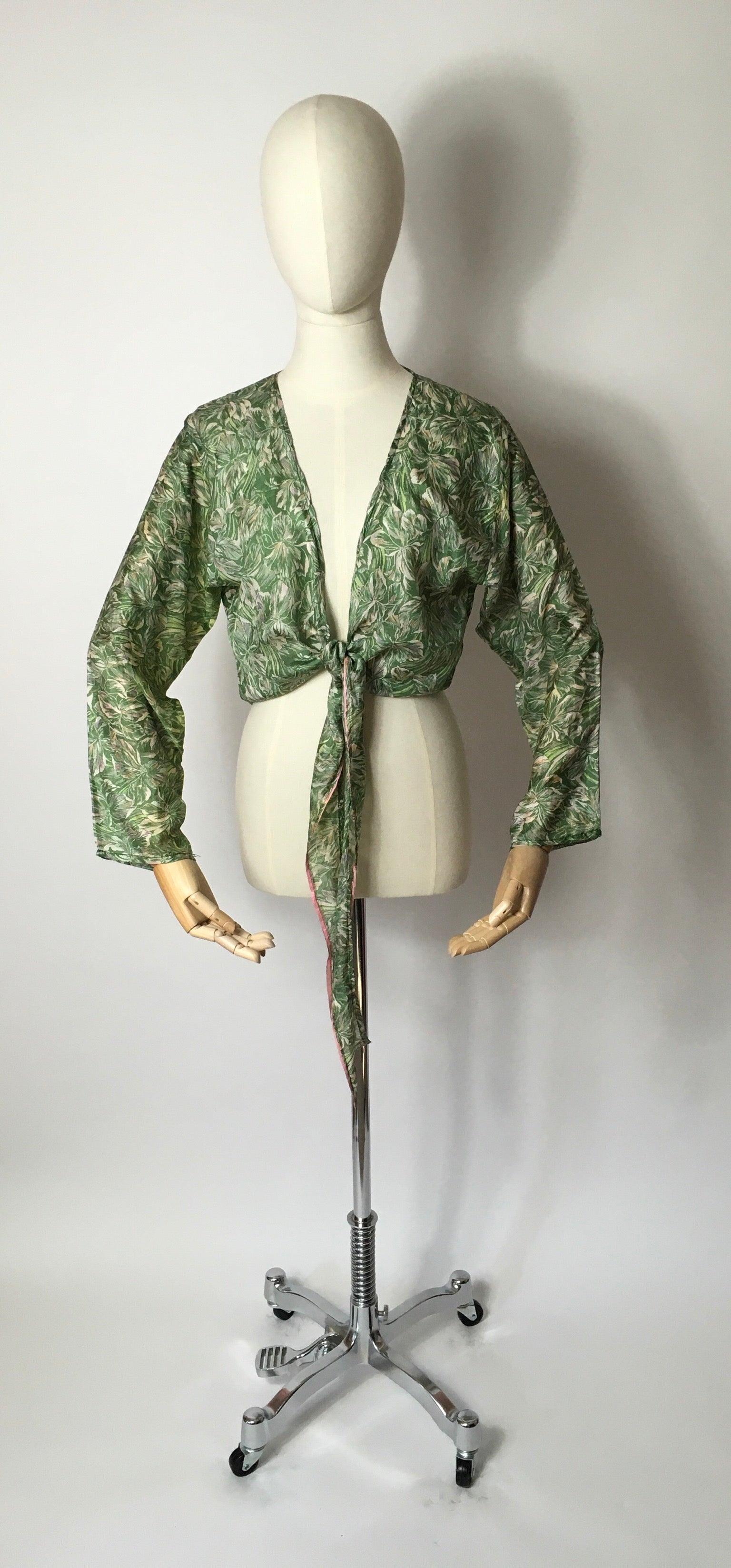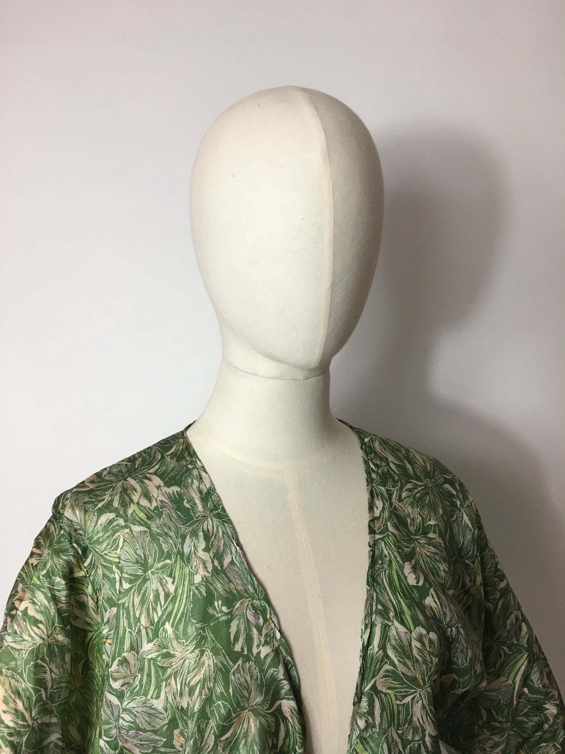 Vintage 1930’s floral silk wrap / bolero in the most beautiful angelic colour palette of soft greens , pinks and icy ivories. The tie section is edged with a brighter pink binding. The garment features long sleeves.