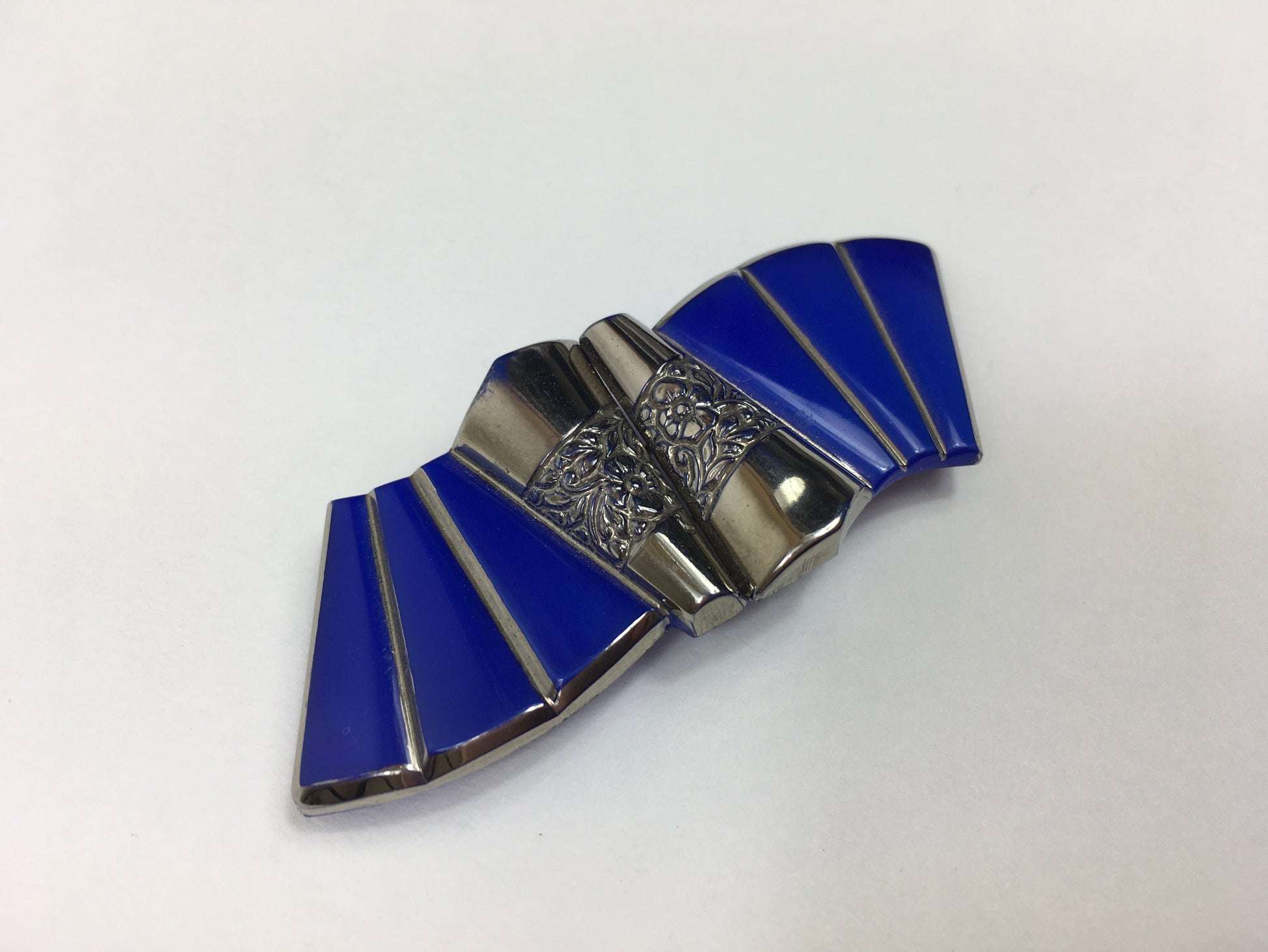 Vintage 1930’s glass and enamel buckle With deco detailing. In such a beautiful rich blue with silver details. A beautiful piece to add to a belt fastening on a piece of 30’s eveningwear or even a suit. A lovely notion for your collection.