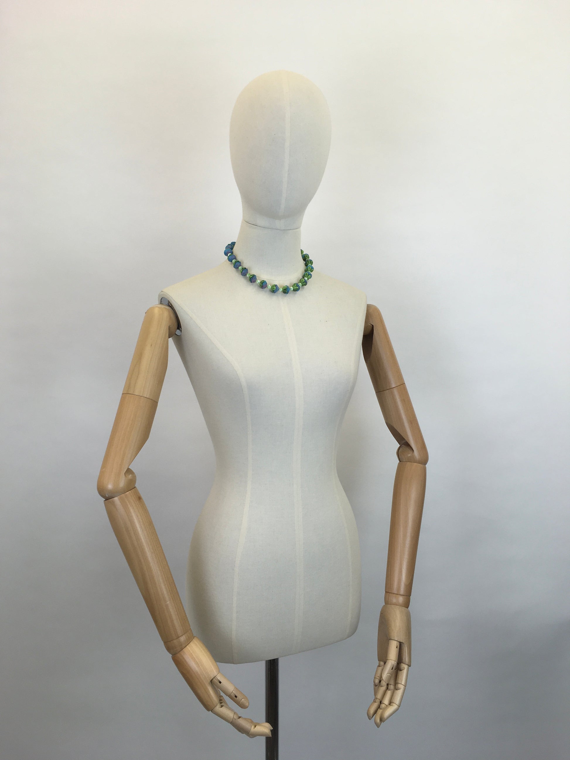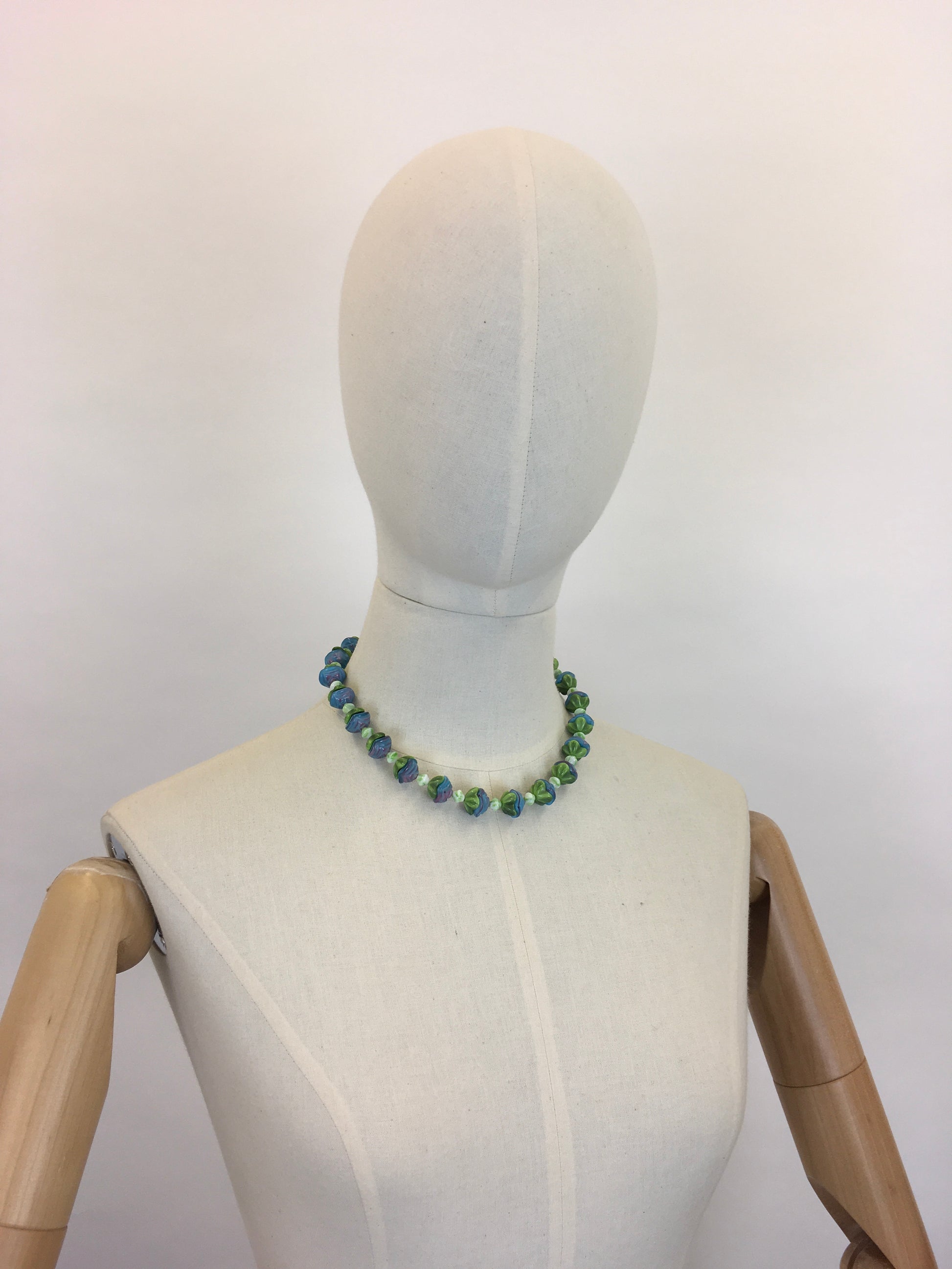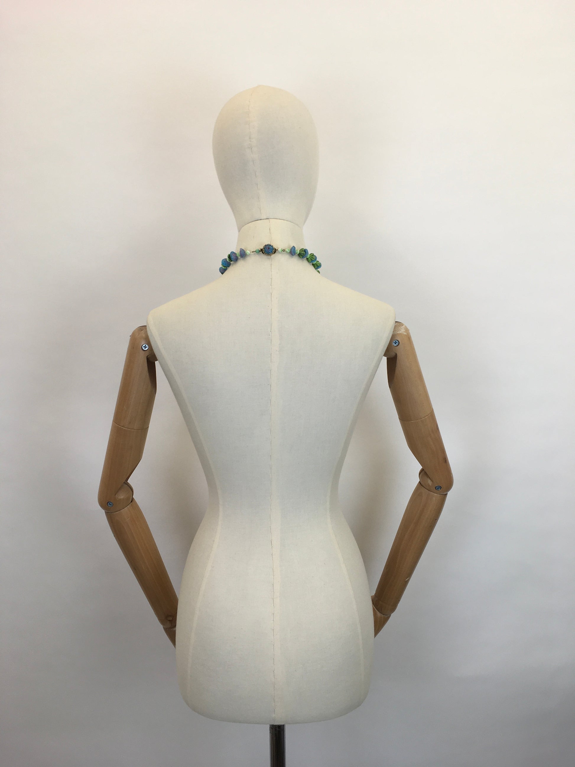 Vintage 1930’s glass petal necklace in the most beautiful soft purples and powder blues with grassy green leaves. The necklace fastens with a beautiful clasp. Measuring 17’ total length including the clasp this piece sits just below the neckline. A stunning piece to add to any collection for something completely unique to wear.