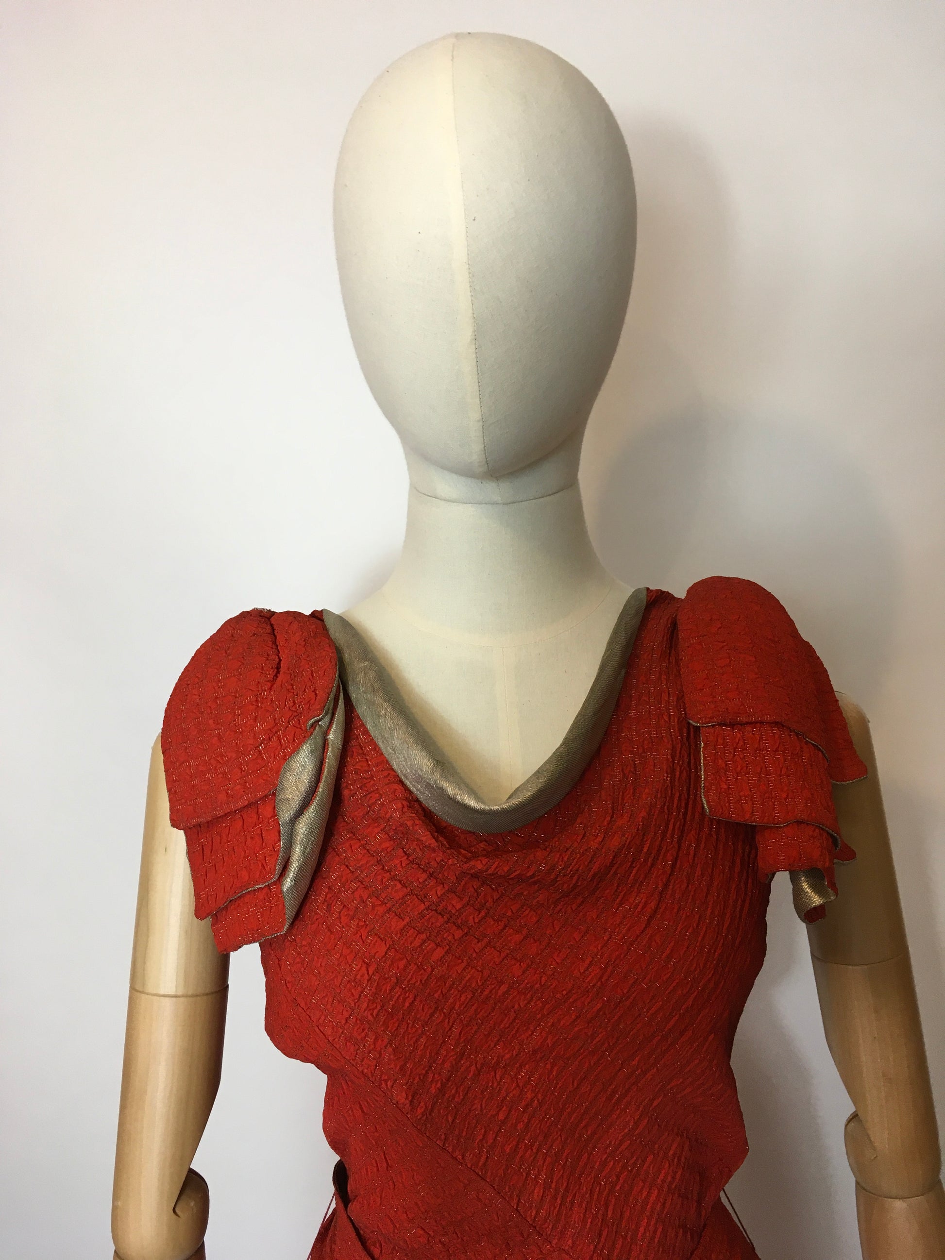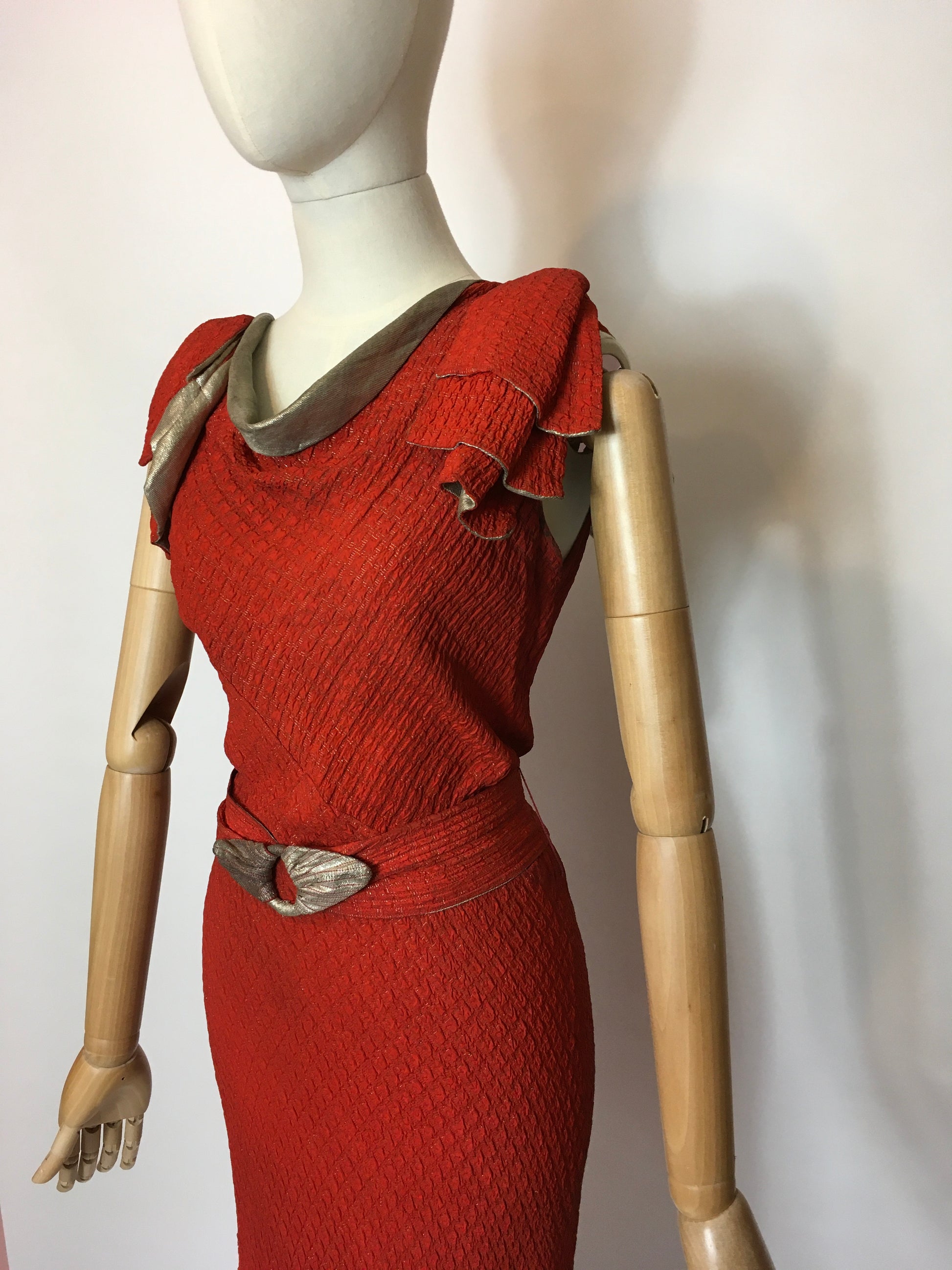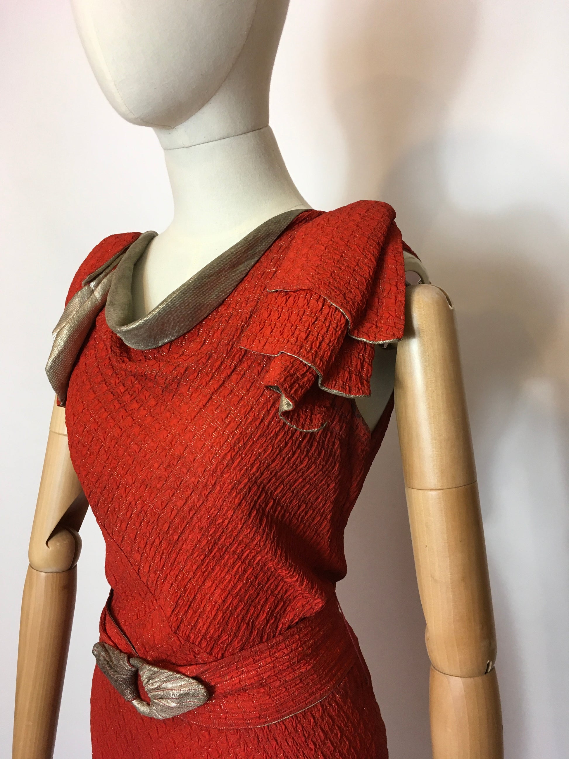 One of the pieces from our curated collection for the fashion show ‘ A look into 1930’s Fashions ‘ exclusive to the Festival of Vintage, York we present this phenomenal 1930’s lame gown in rust with gold threads. The epitome of its era and oozing Old Hollywood Glamour vibes this gown features a sweeping neckline to the bodice, fabulous innovative shaped shoulder detailing, a low v back shaping, an exquisite matching belt with amazing construction and all sweeping into a fabulous shaped skirt and train all cut on the bias. A dress you can imagine Ginger Rogers waiting for a dance with Fred Astaire in a Black and White film.