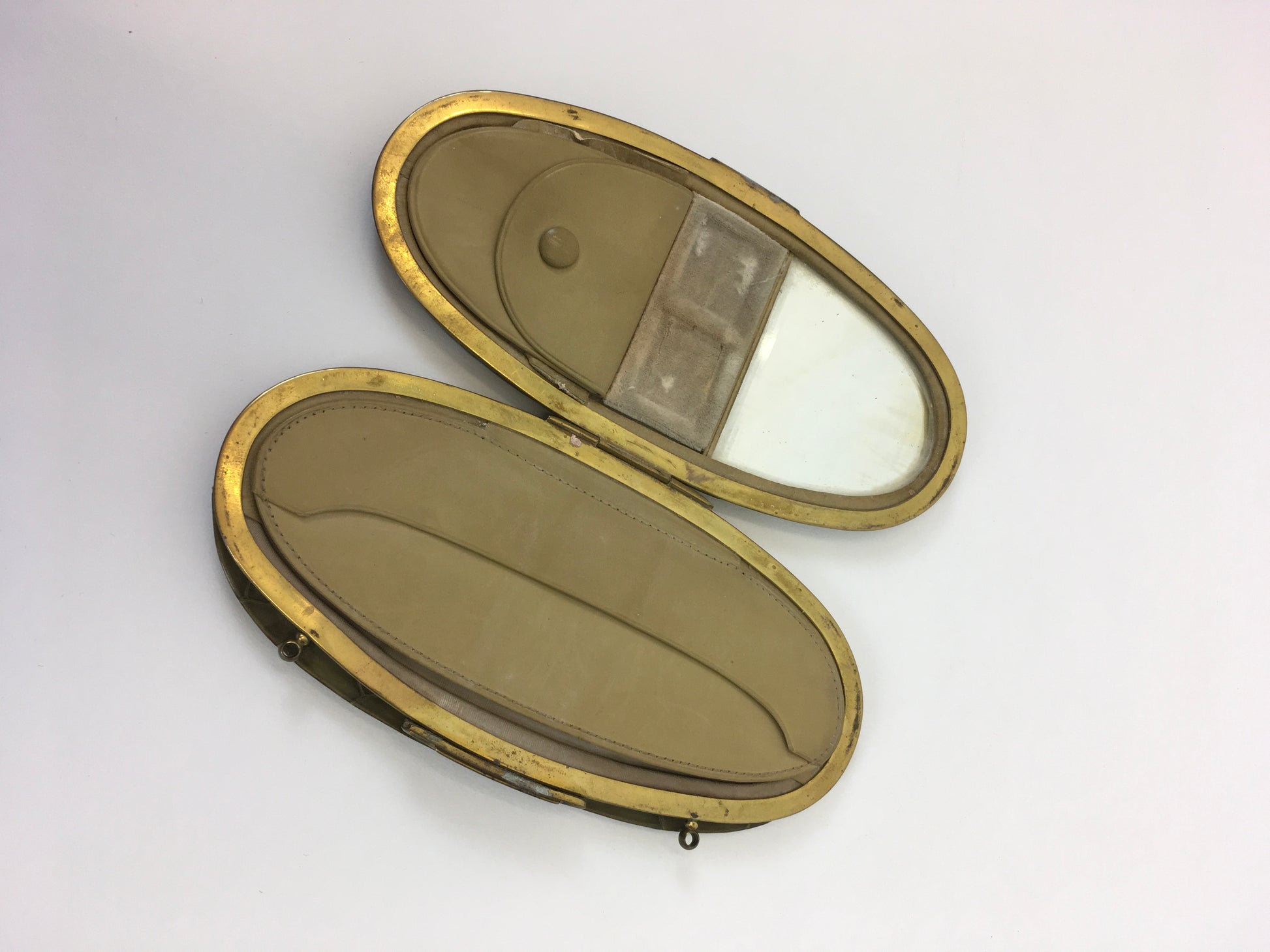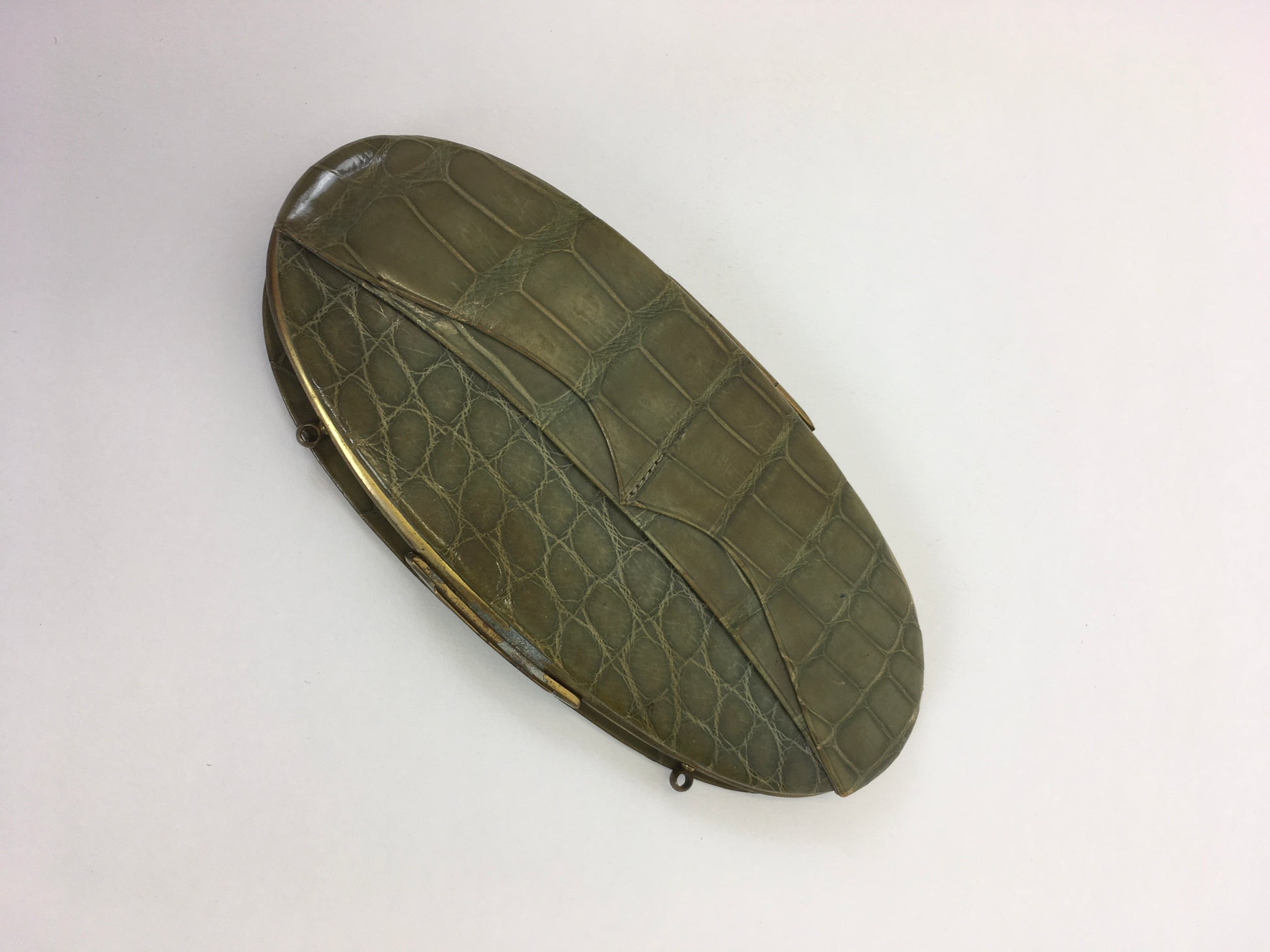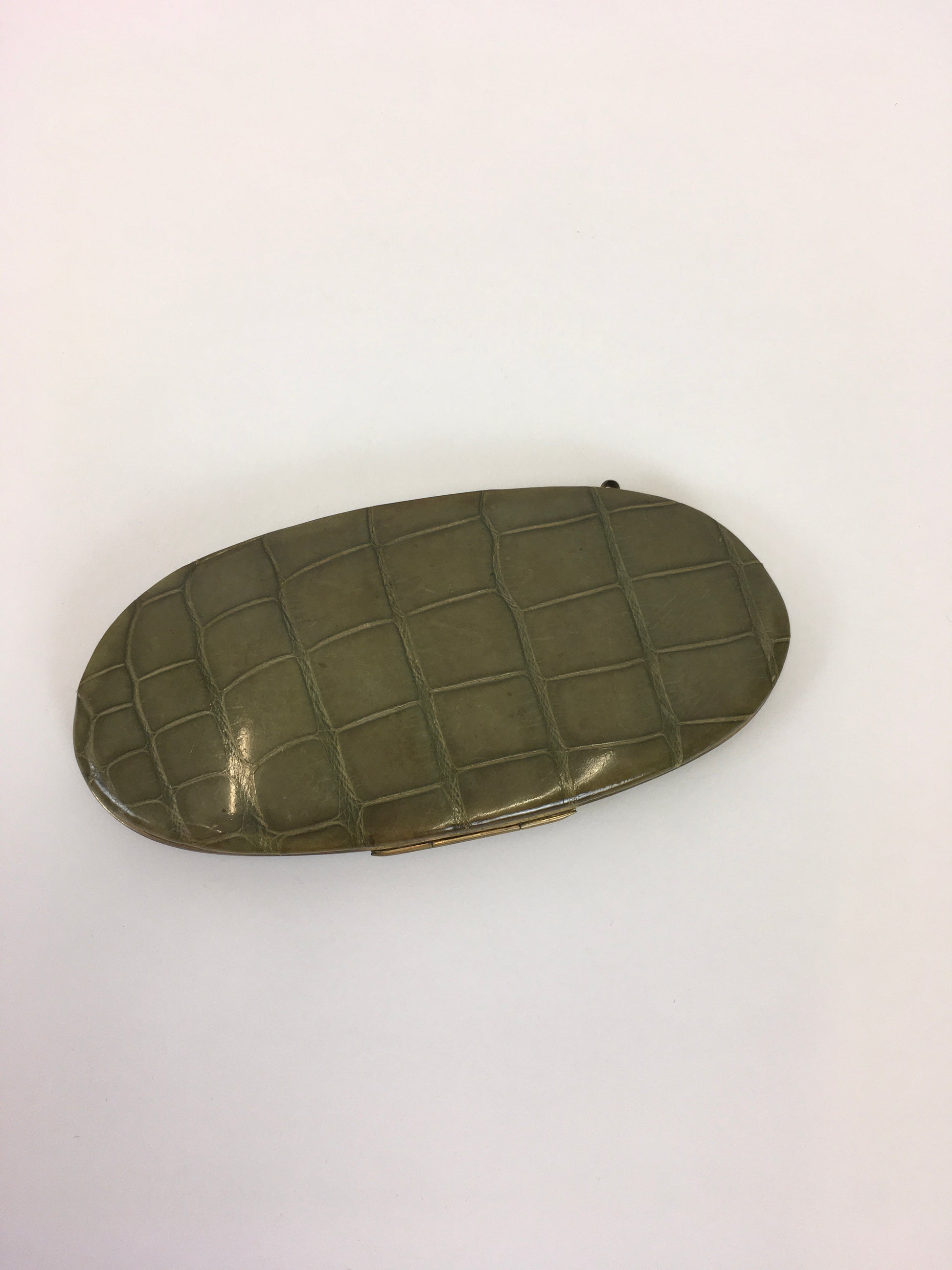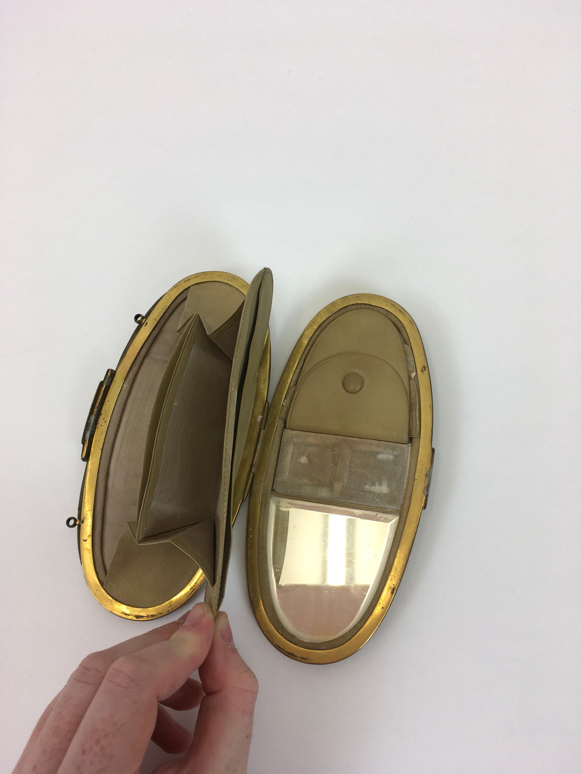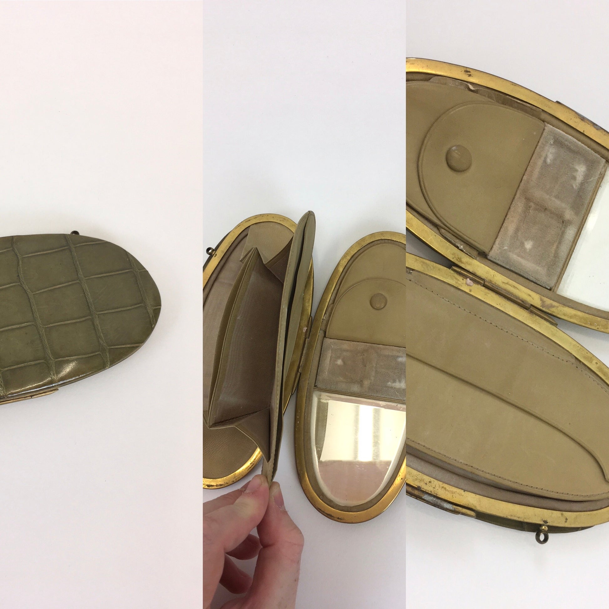 Vintage 1930s beautiful evening purse / compendium bag in a lovely soft olive green colour. Featuring a fabulous interior including mirror, coin purse with press stud fastening and compartments on a golden frame. A fabulous piece to add to any collection to use as a purse in a larger bag or for use as an evening bag if you don’t need a phone etc.