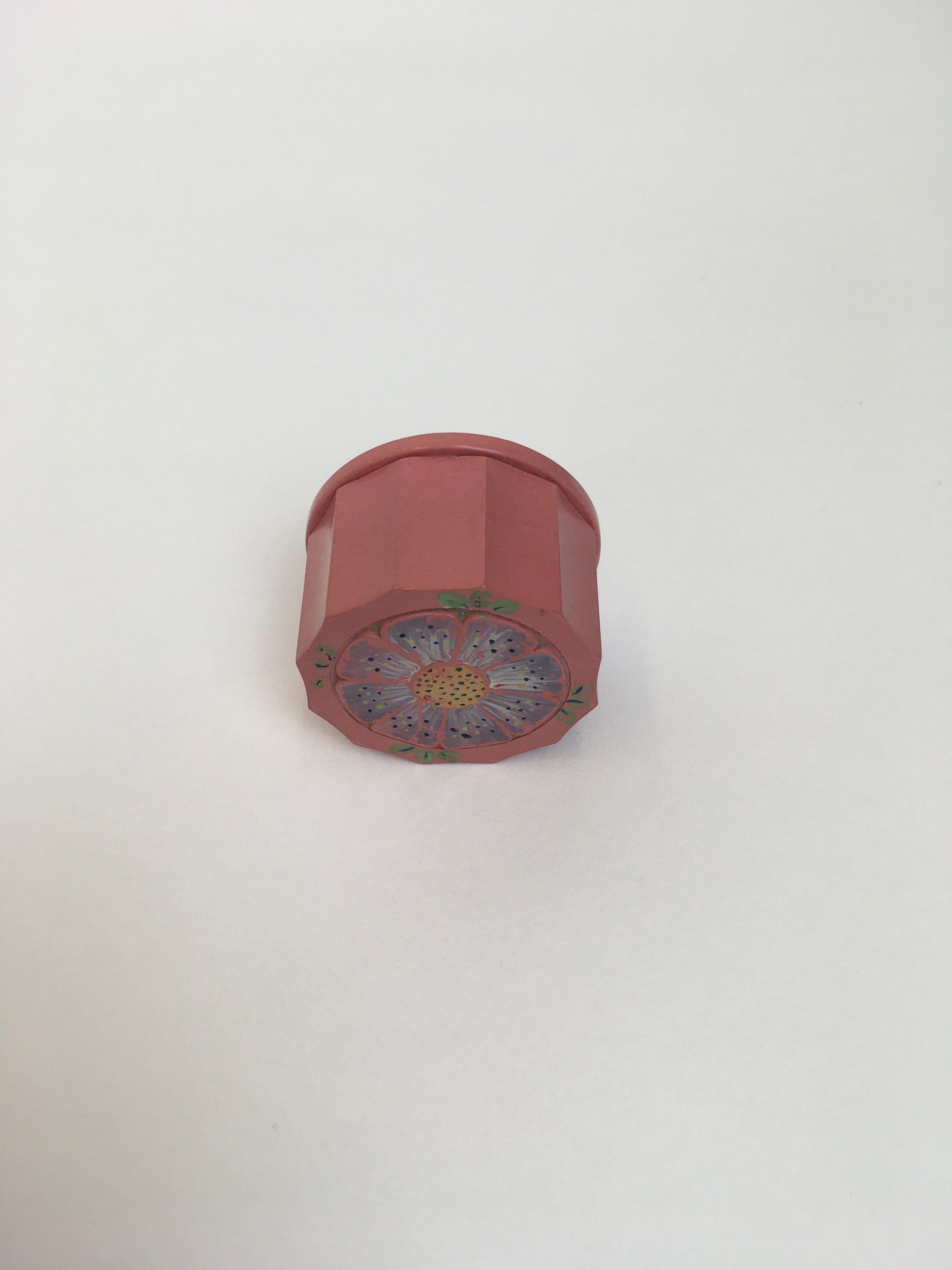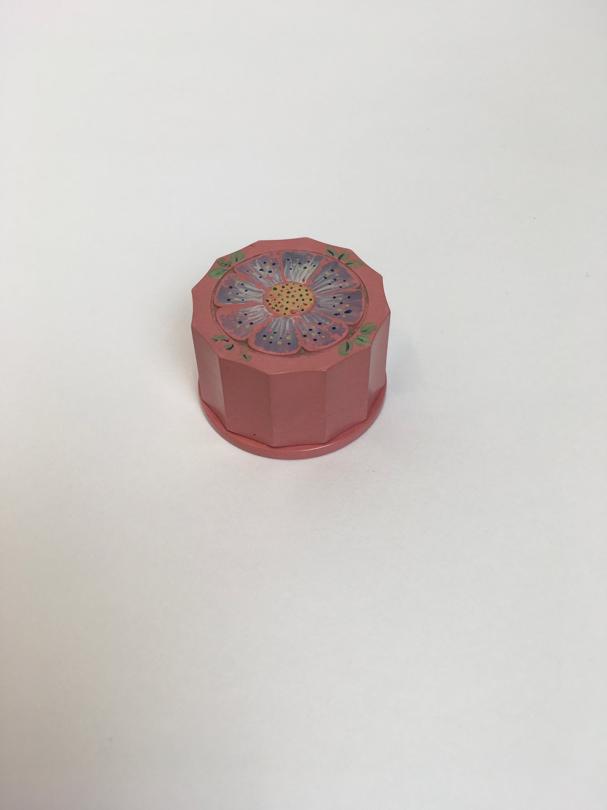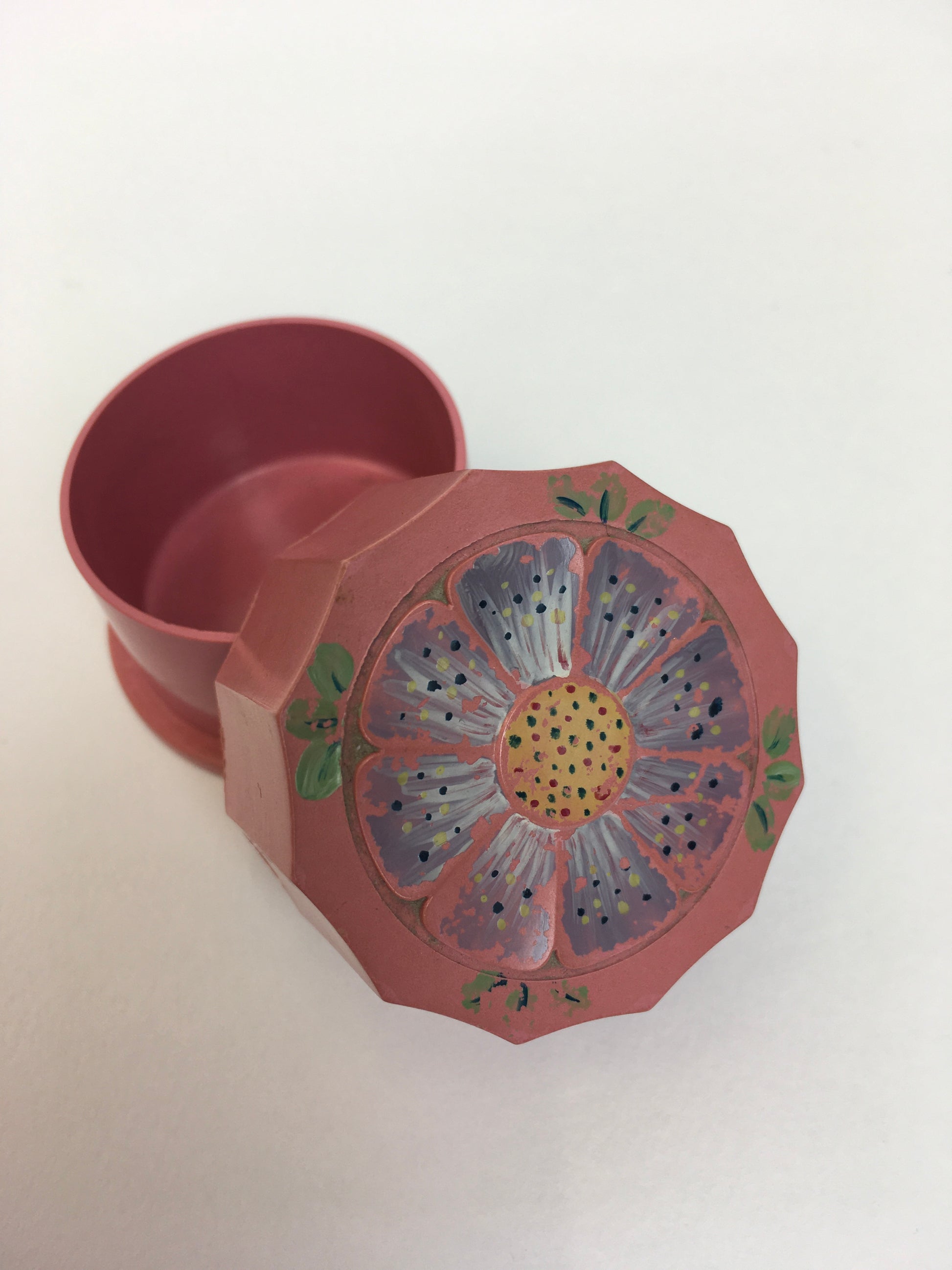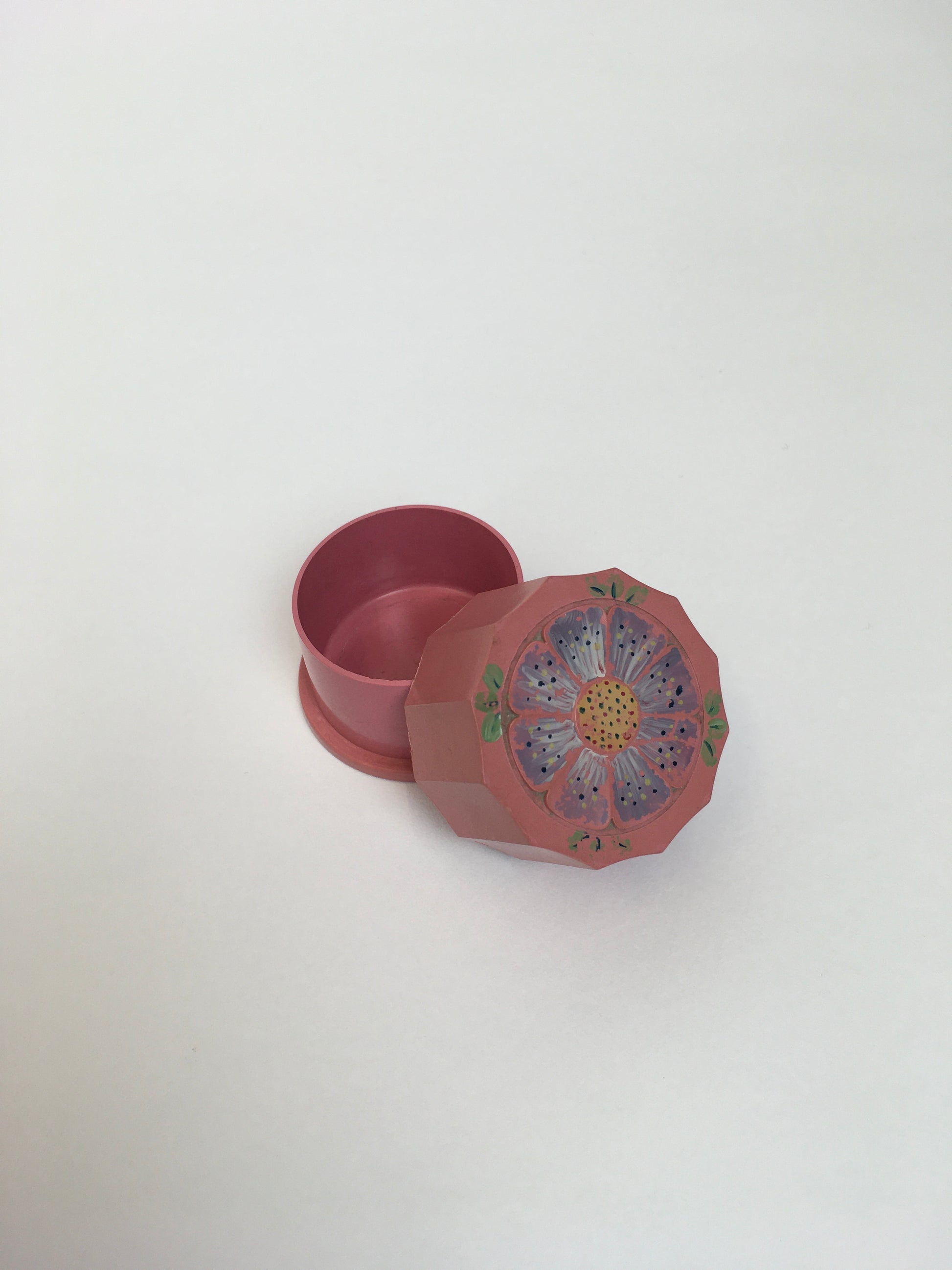 Vintage 1930s Celluloid pot in a beautiful powder pink with floral motif to the lid in soft lilacs, muted yellow and grassy greens. Measuring 1.75’ x 1’ this is a lovely trinket size for makeup or a dressing table extra for jewellery.
