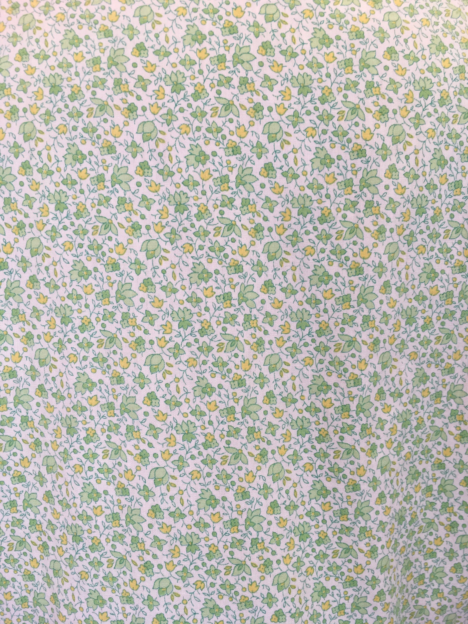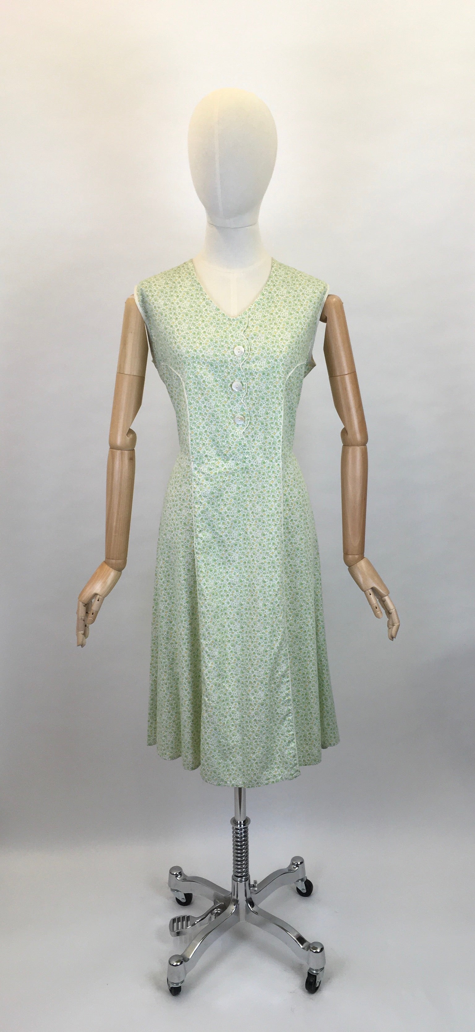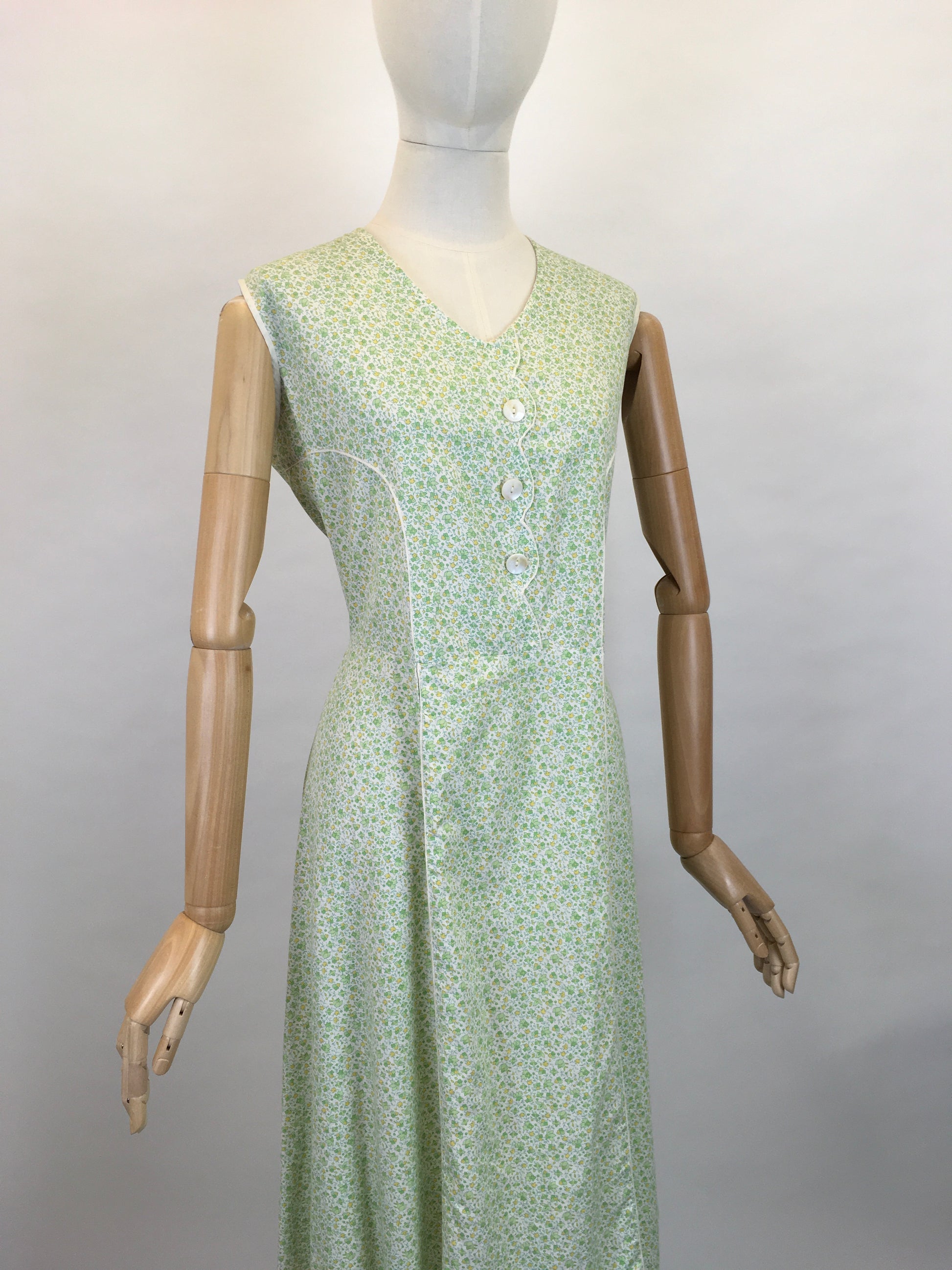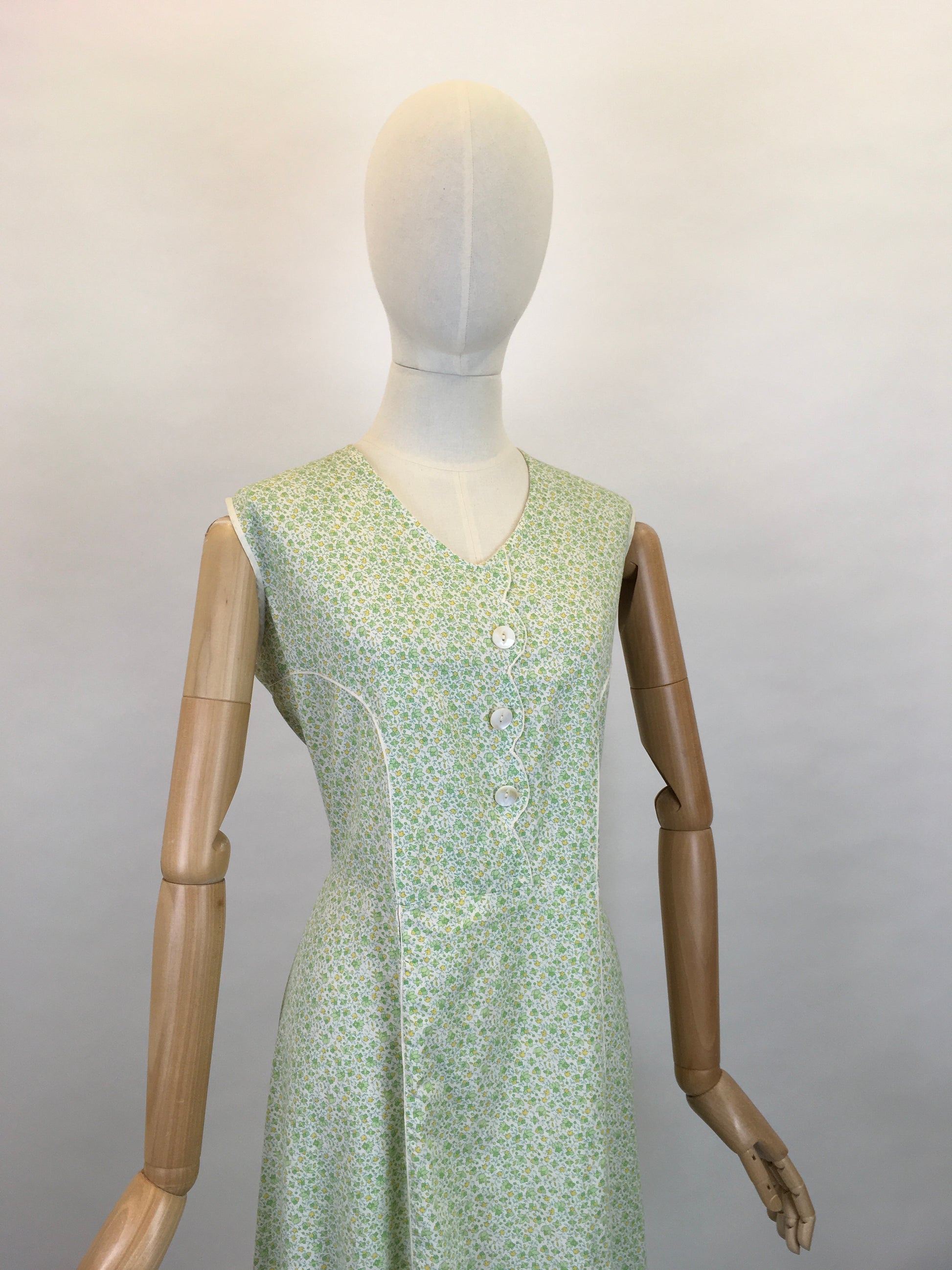 Vintage 1930s day dress in a beautiful delicate Ditsy print floral cotton in a lovely colour palette of soft greens and buttercup yellows with a contrast white binding. Created from a classic simple silhouette this dress is sleeveless, with a very straight shape, has a faux button detailing to the front with a scallop piping trim for detail. A lovely simple piece for everyday wear, great with a contrast colour cardigan to layer.