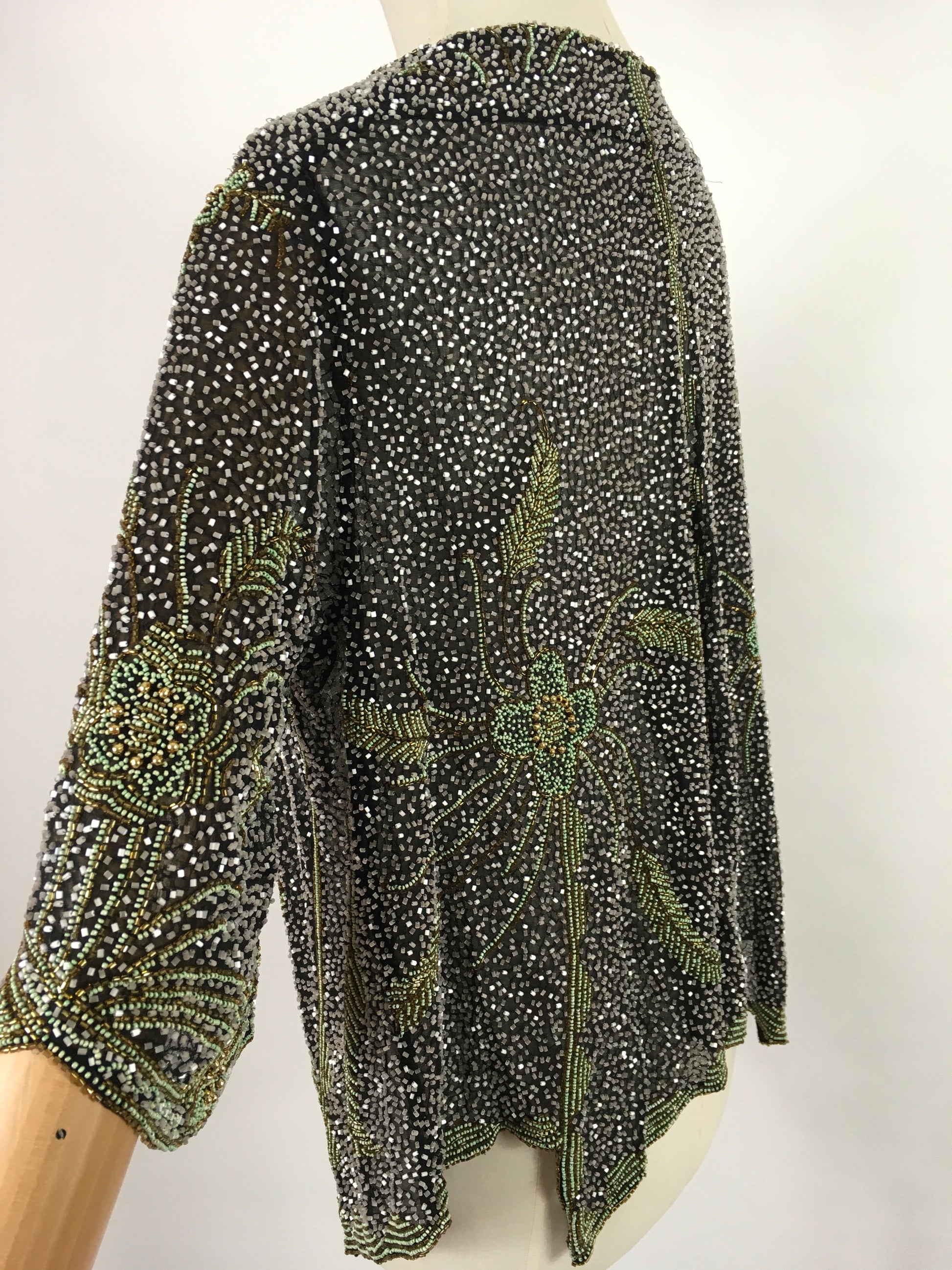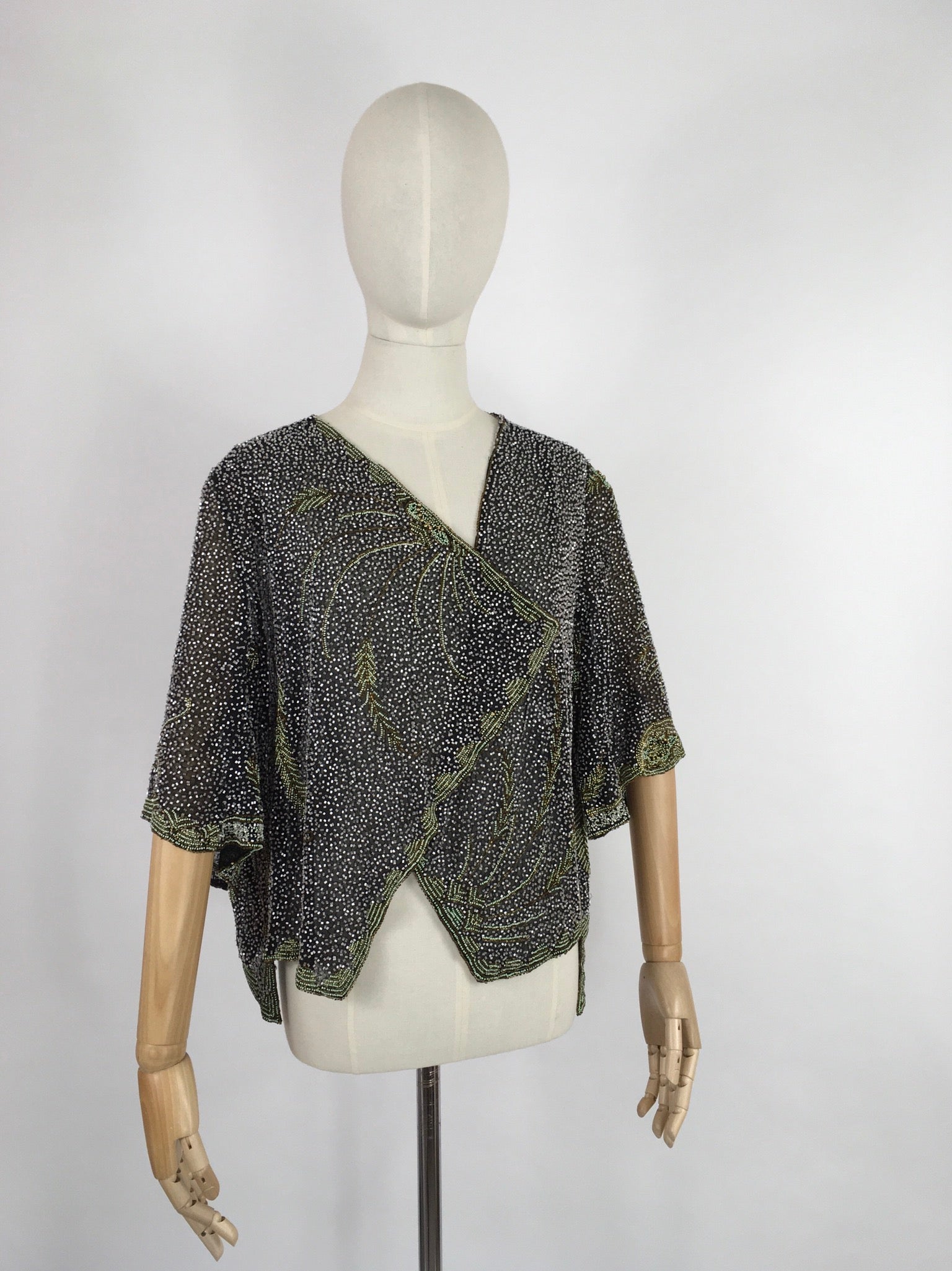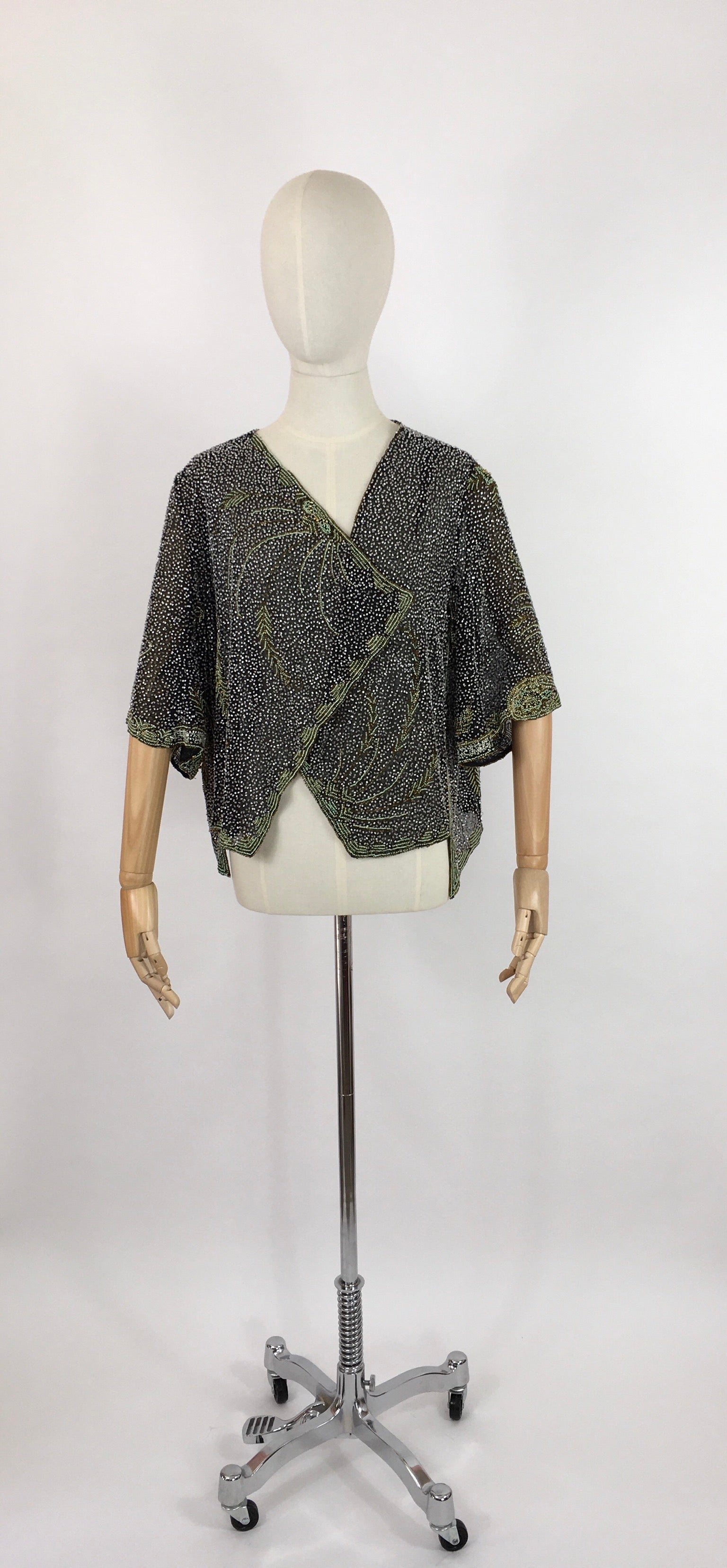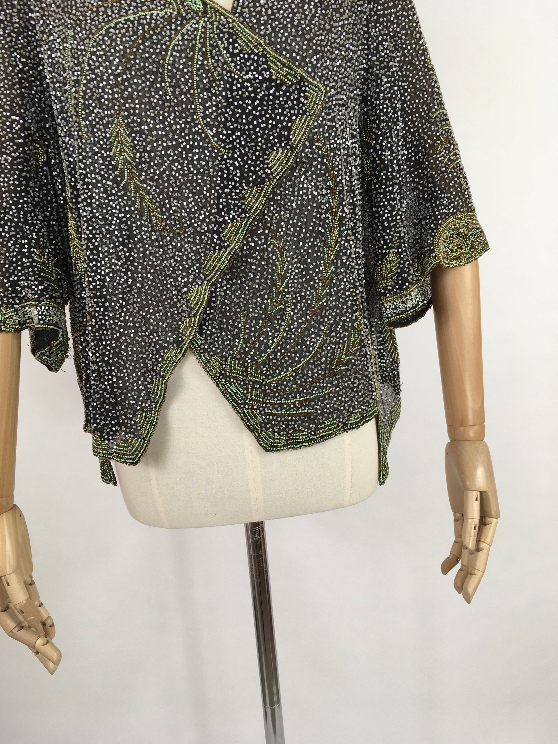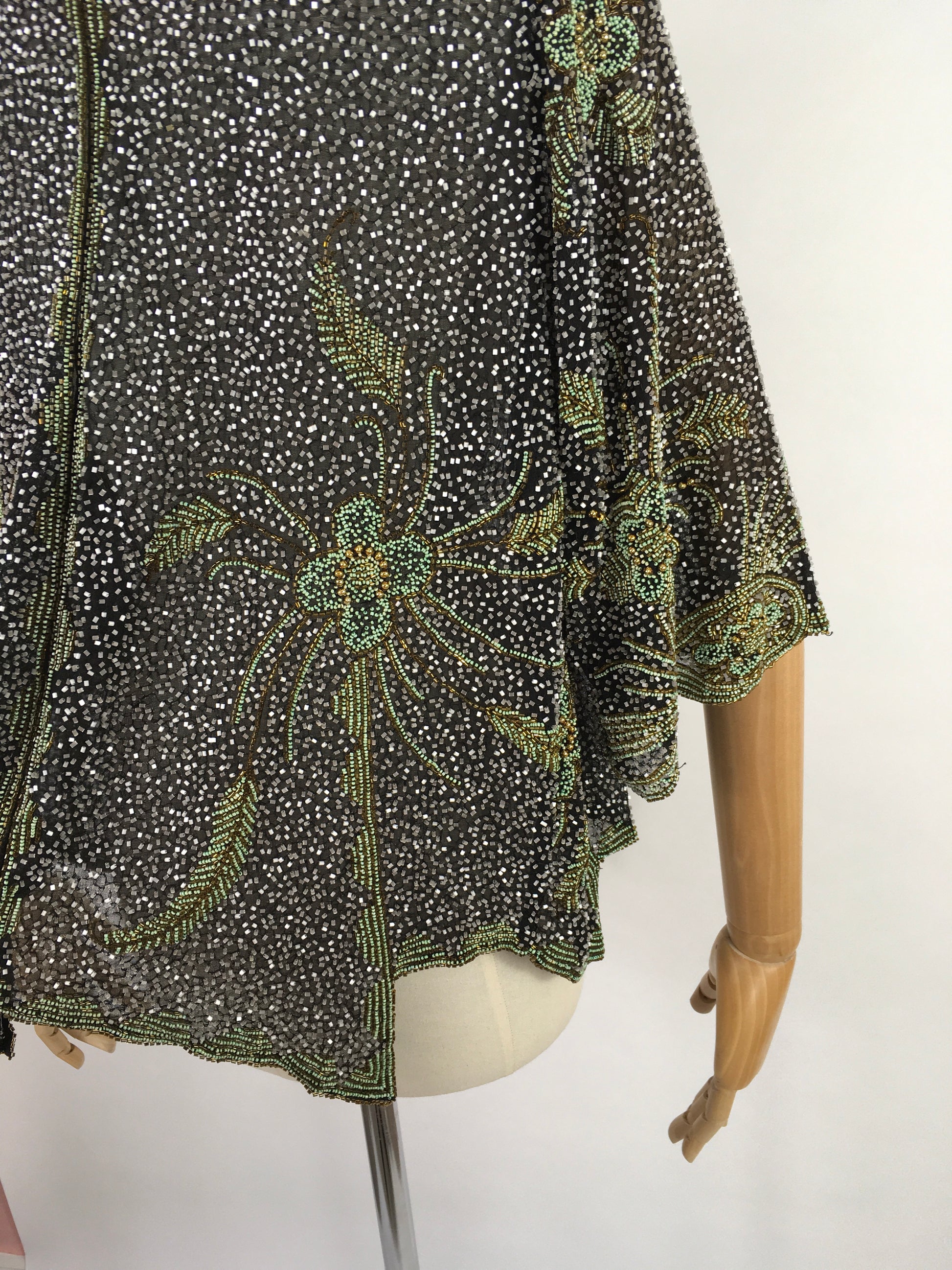 Original exquisite early 1930s beaded capelet, one of our greatest finds and a piece that has stolen our hearts. Museum worthy in all its beauty. This piece has the most amazing shape and features asymmetric detailing throughout. This piece would have been painstakingly handbeaded throughout. The beadwork is simply magical and features flowers throughout in the most amazing contrast of black, Golds and mint green beads. Typical to the period these colours are the epitome of its period. The capelet has lovely shaped sleeves which are again fully beaded.