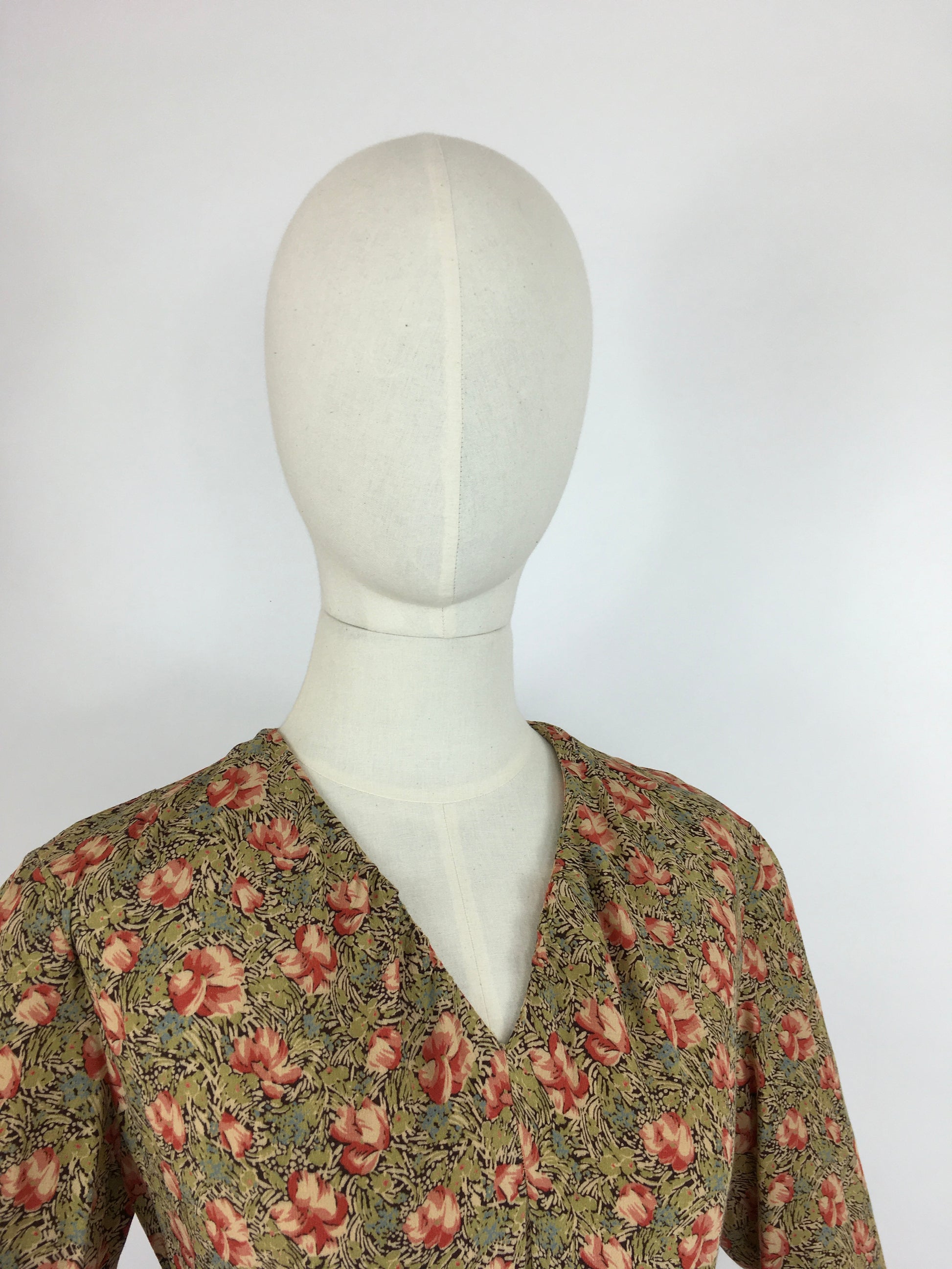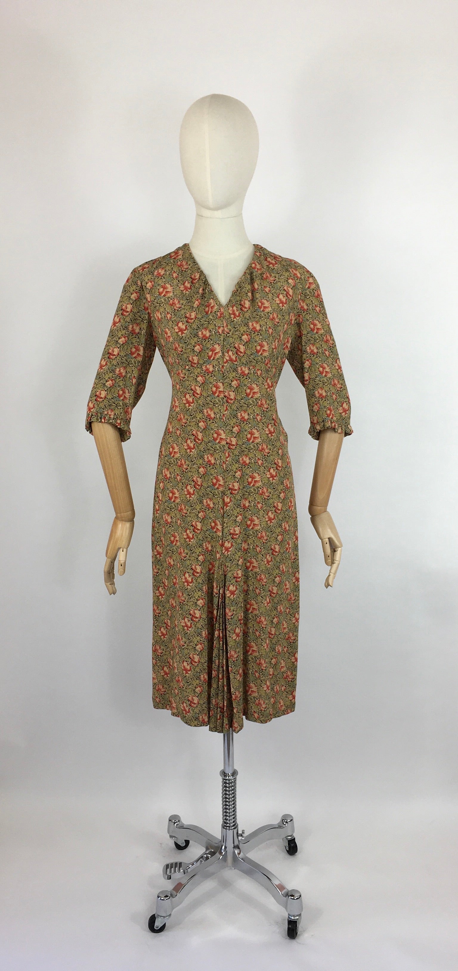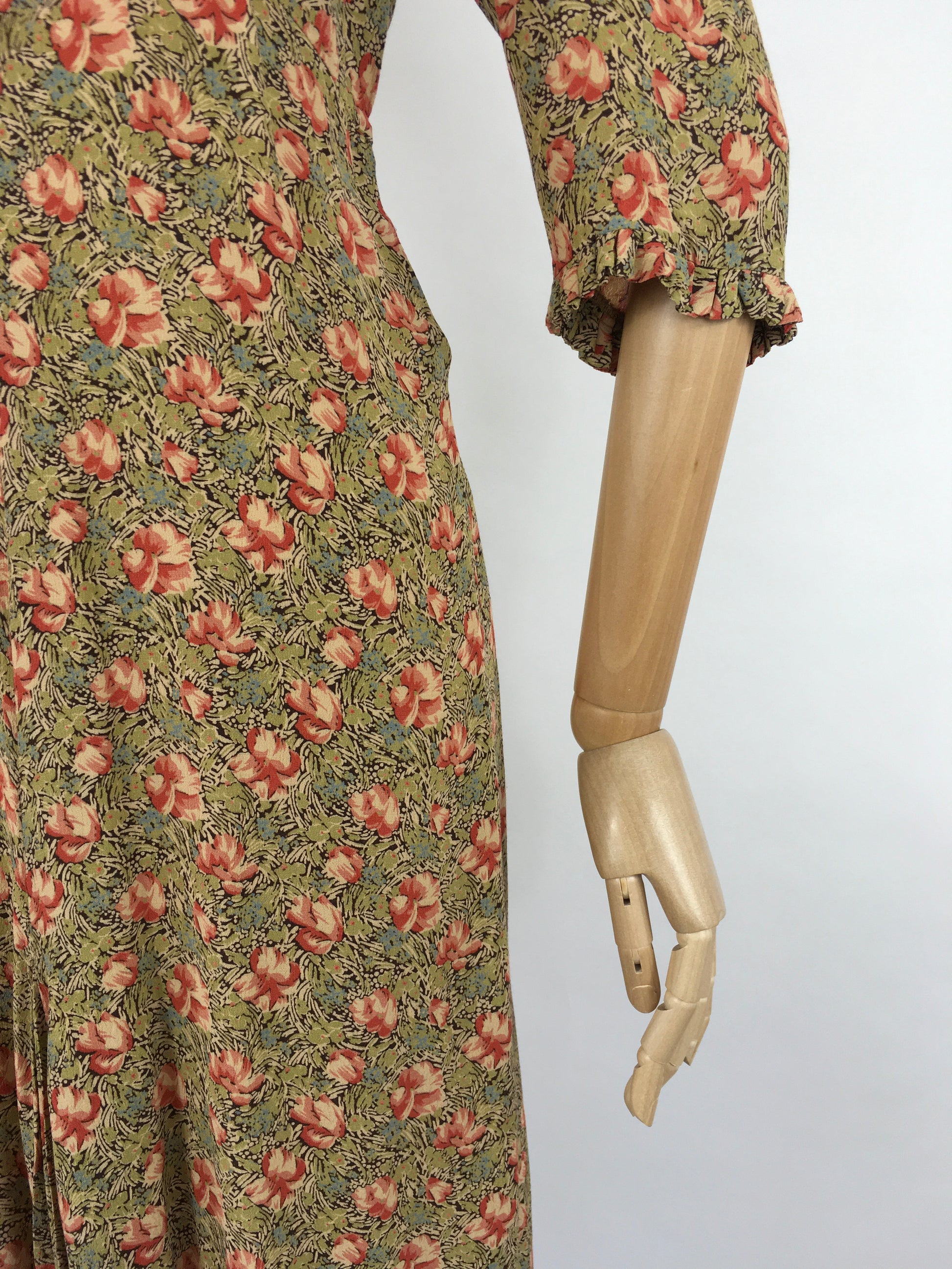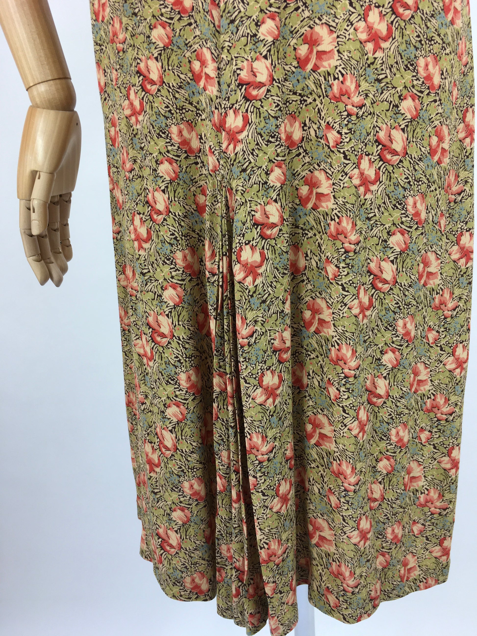 Vintage 1930s simply exquisite floral day dress in the most beautiful colour pallet of warm rose pinks and reds, grassy greens, pale greens and powder blue. The fabric is full of beautiful florals similar to that of Liberty prints and has a beautifully drape to it being a lightweight crepe. The dress has a typical 30’s silhouette featuring simple v neck bodice with 3/4 sleeve edged in a pleated trim, bias waist seam, simple skirt shape with dropped pleated Detailing to the front.