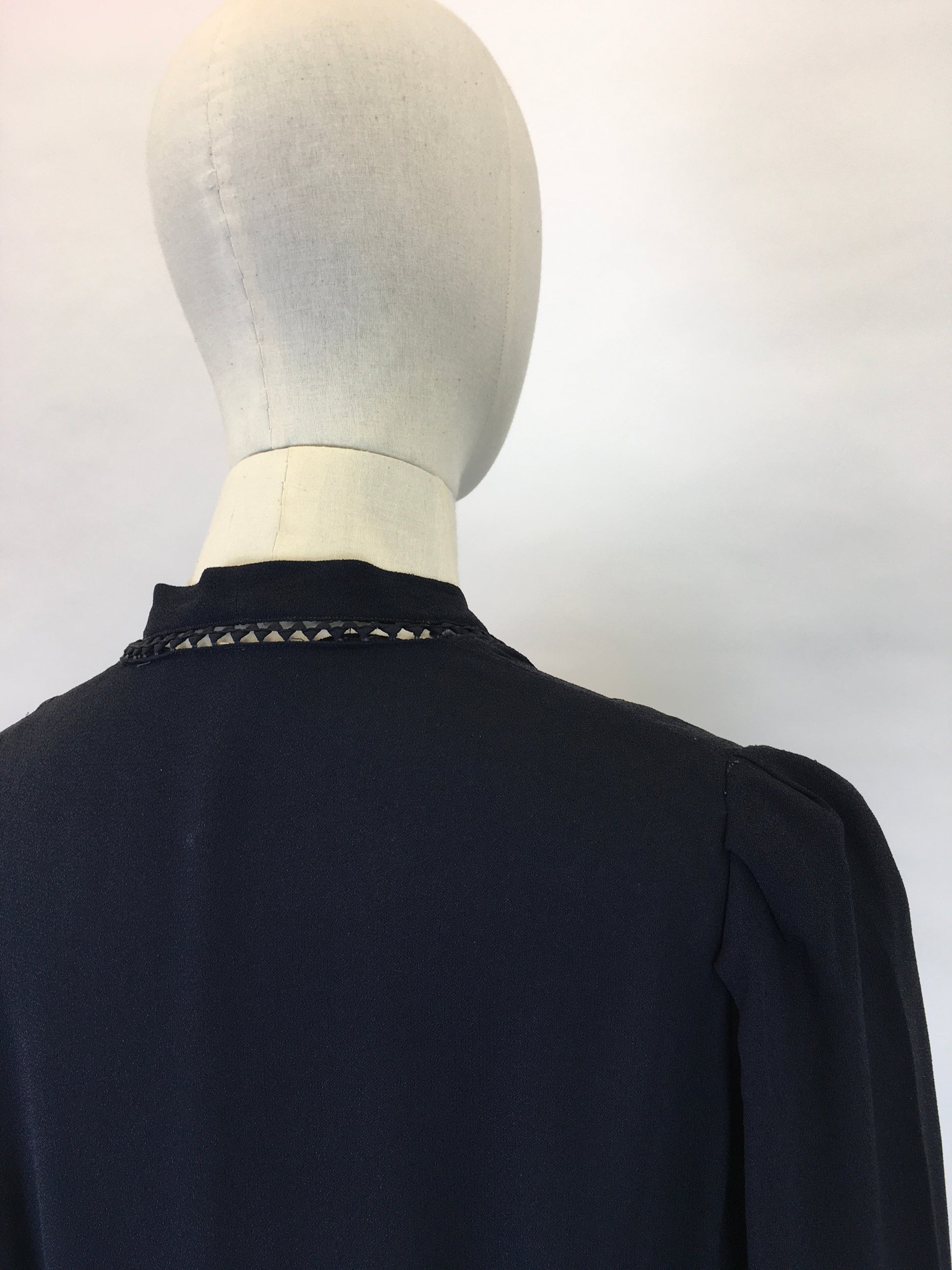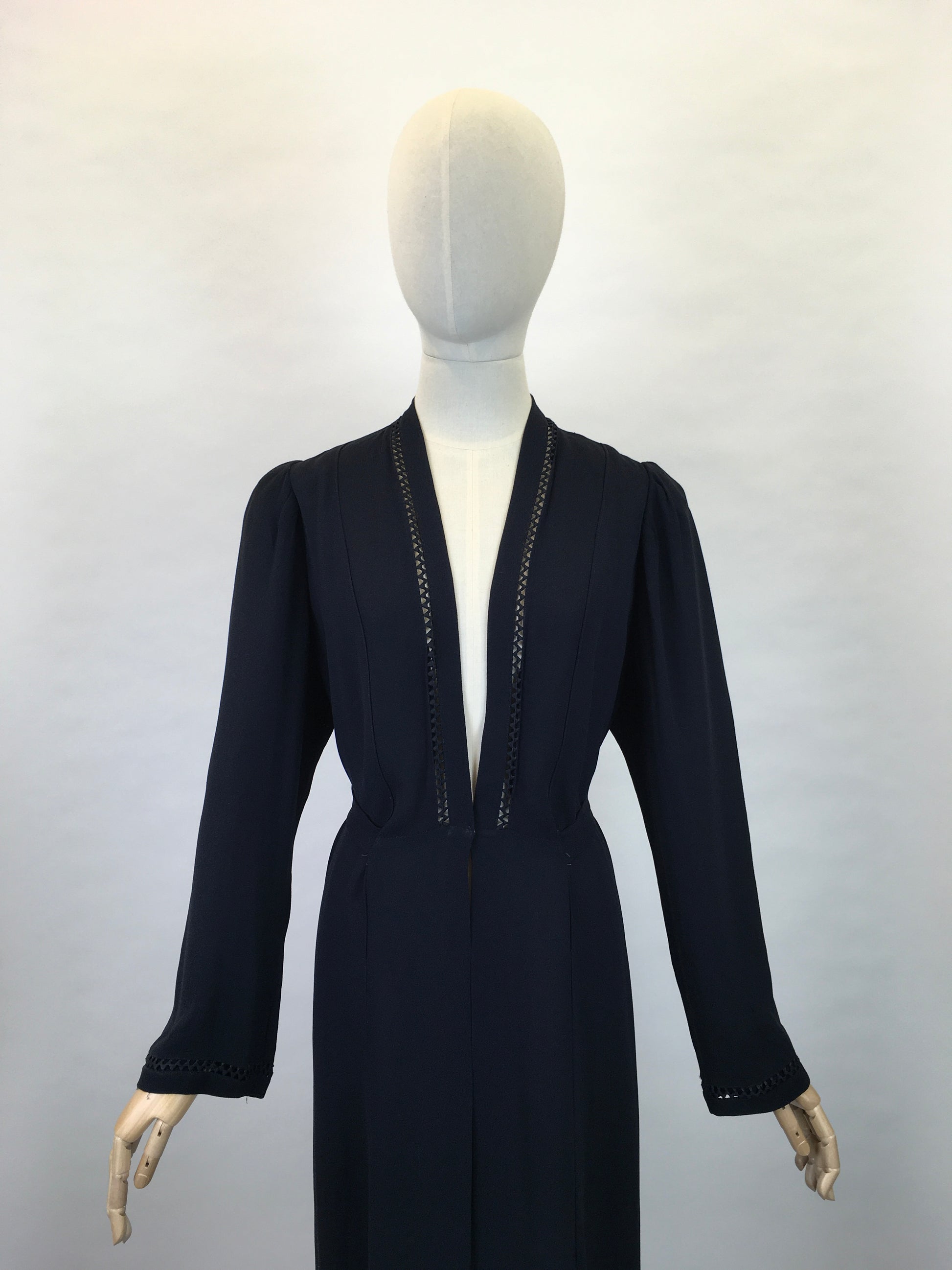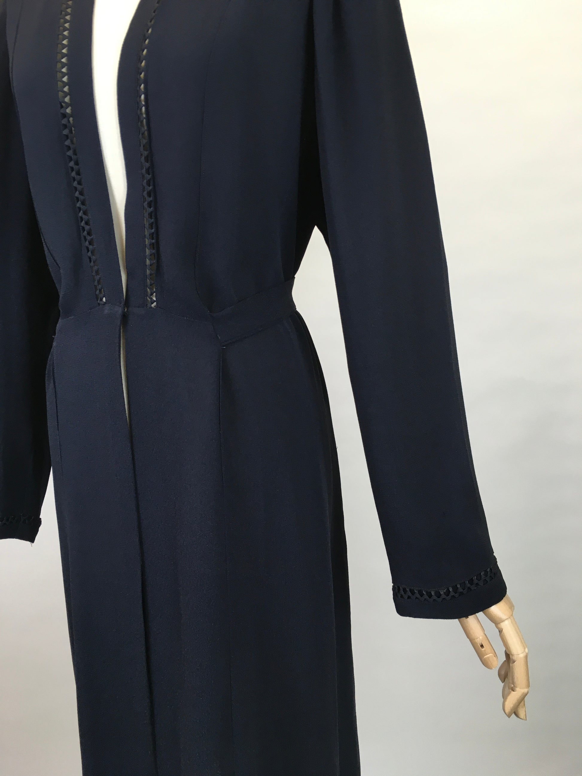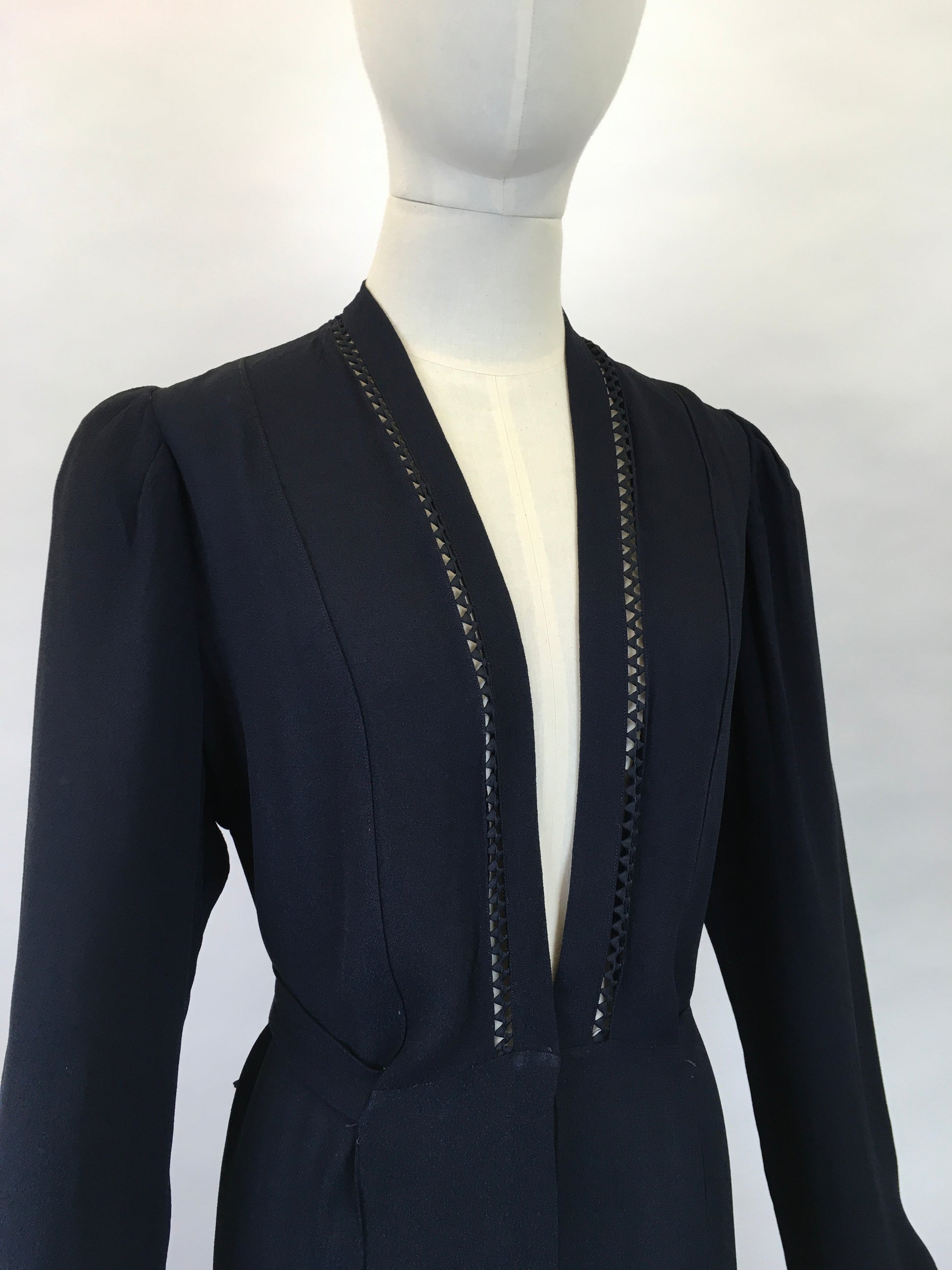 Vintage 1930s Navy summer coat made from a beautiful lightweight crepe. In a fabulous deco silhouette this piece has a long sleeve, fretwork detailing to the front edge, longline length, hook and eye fastening and tie belt. Although measuring much larger this piece is suited for a UK 10-12 for the best fit and for it to hang correctly.