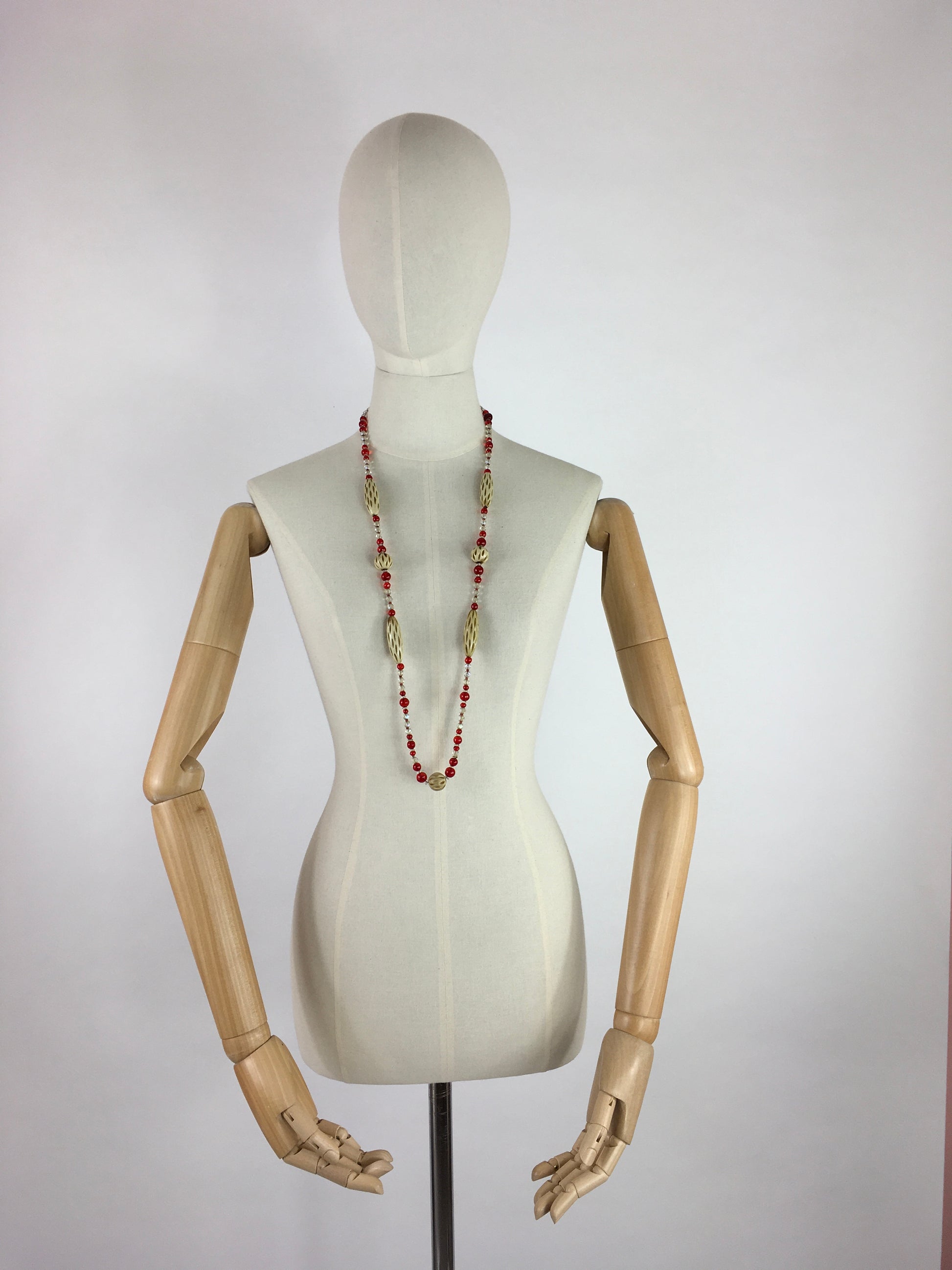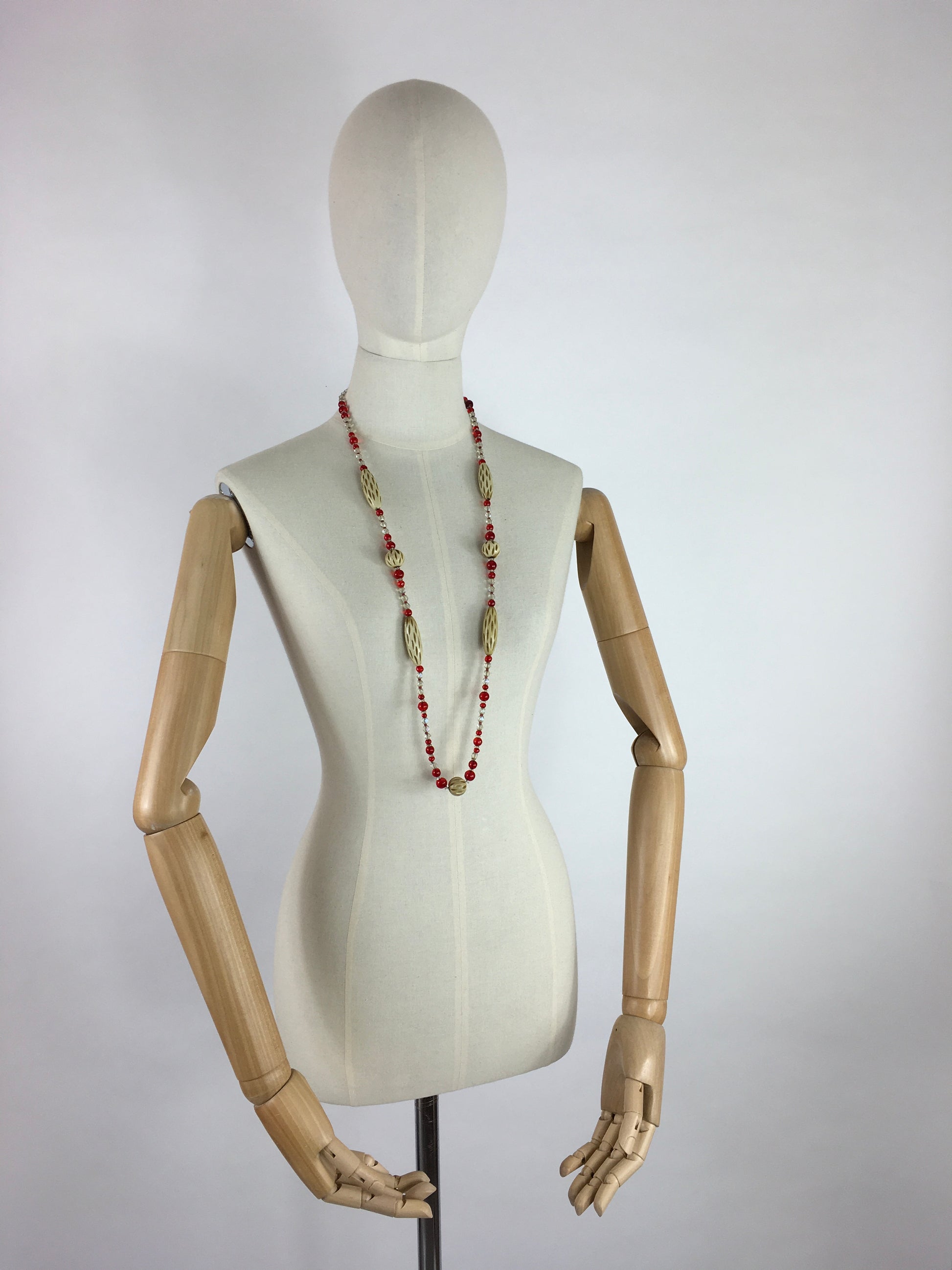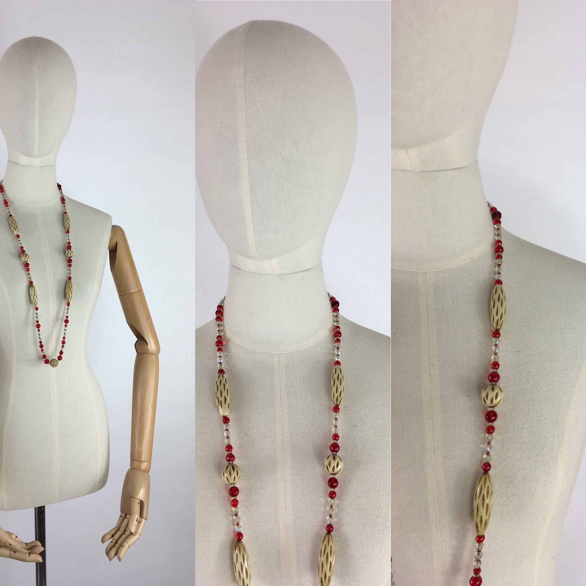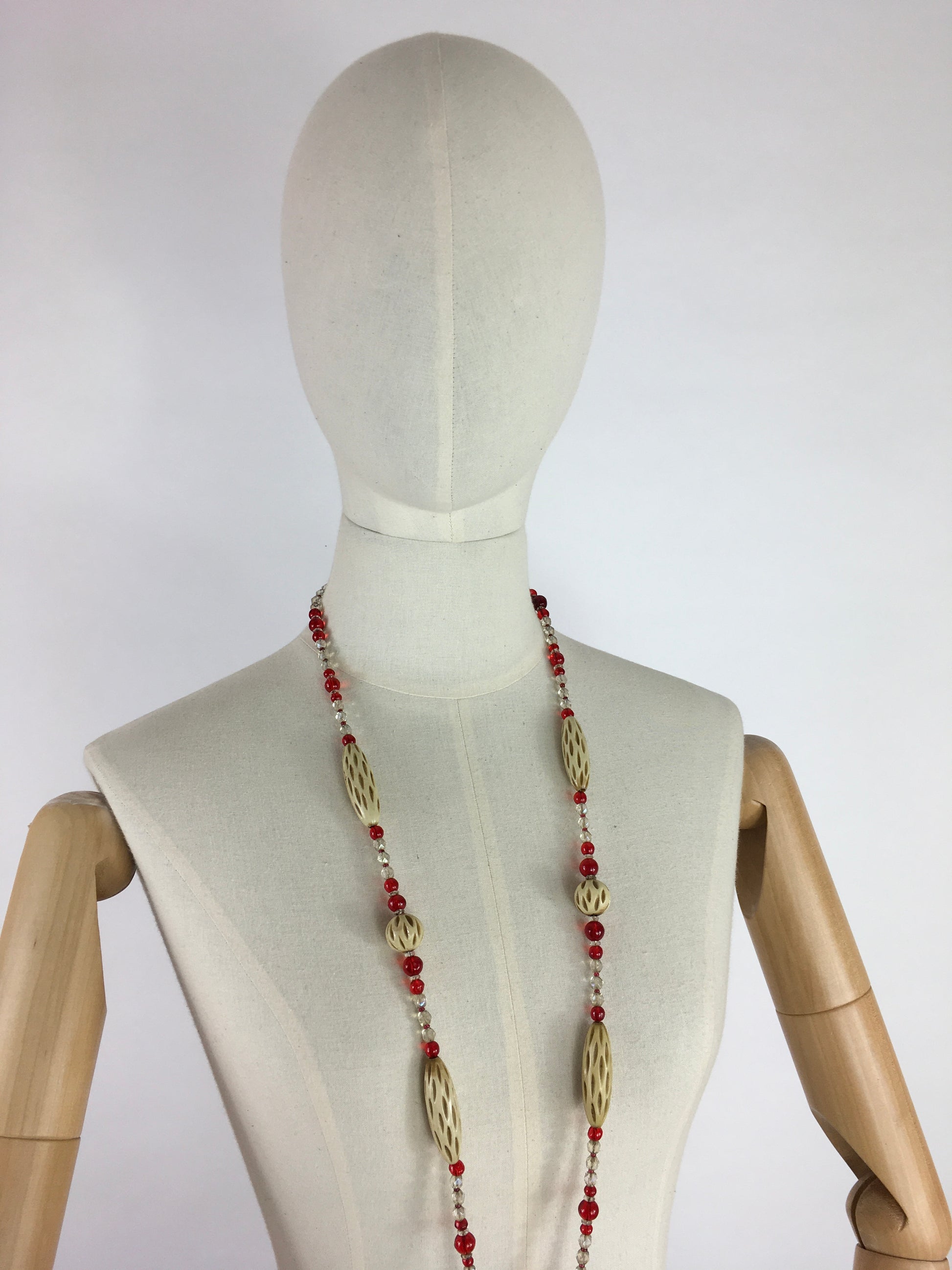 Original 1930s Long Line Necklace - In a Contrast Glass Bead and Celluloid in Reds, Clear and Soft Cream