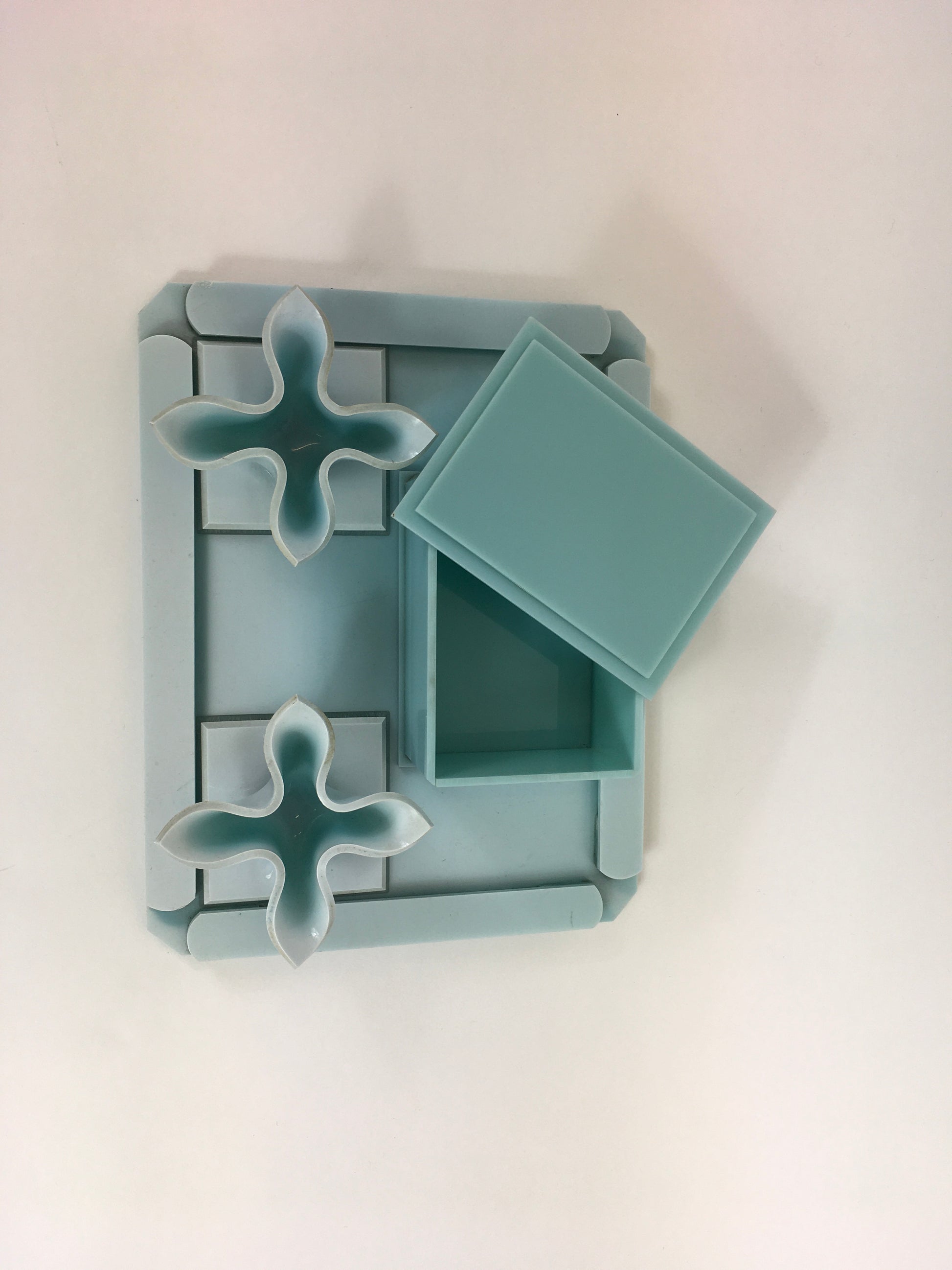 Vintage 1930’s lucite vanity set in an exquisite pale duck egg blue. Consisting of a tray, box and pair of candlesticks in an almost handkerchief shape. A beautiful piece for a vintage dressing table or sideboard to keep your trinkets In. A beautiful nod to the Art Deco eras. A lovely gift to yourself or someone special.