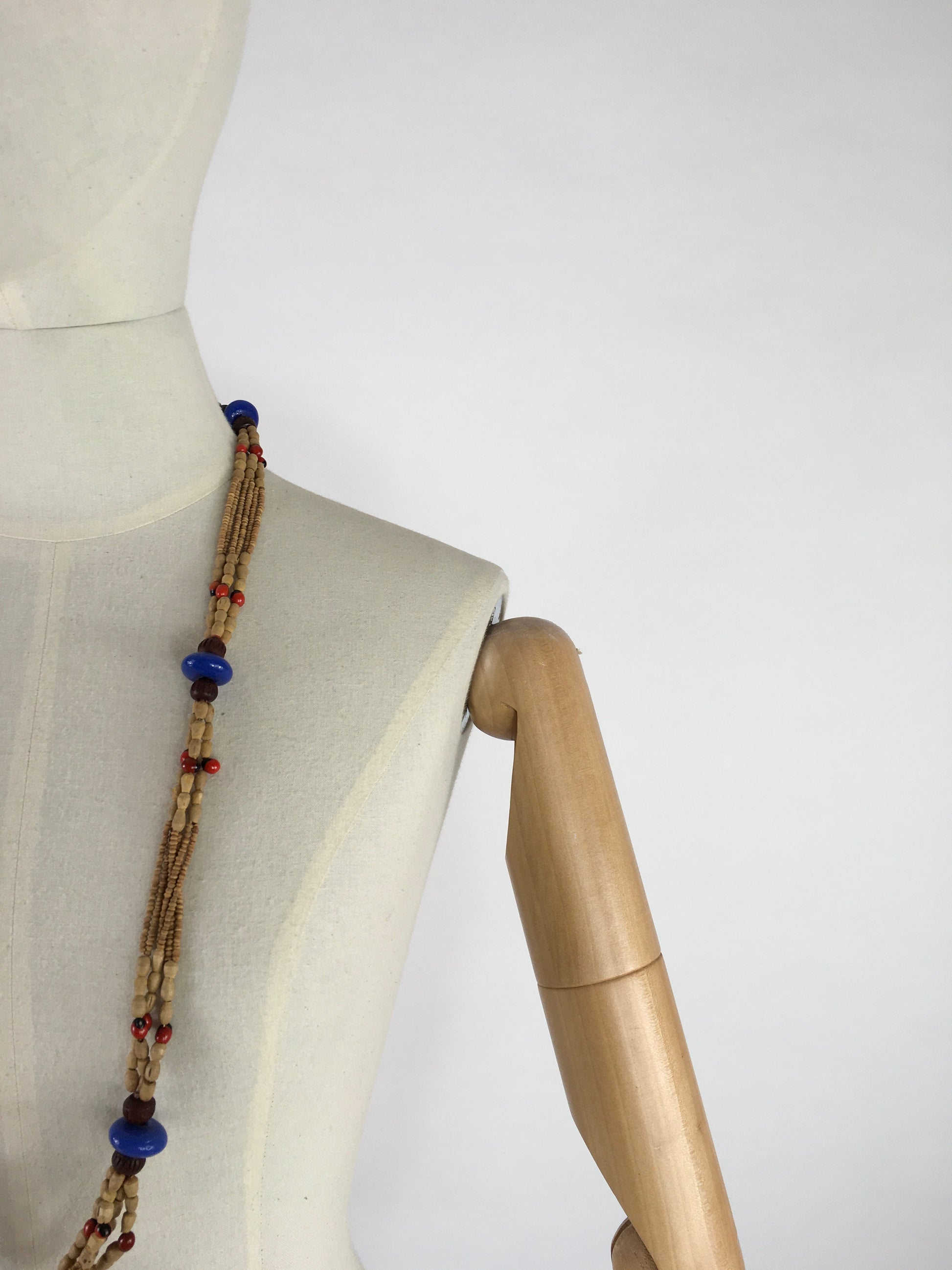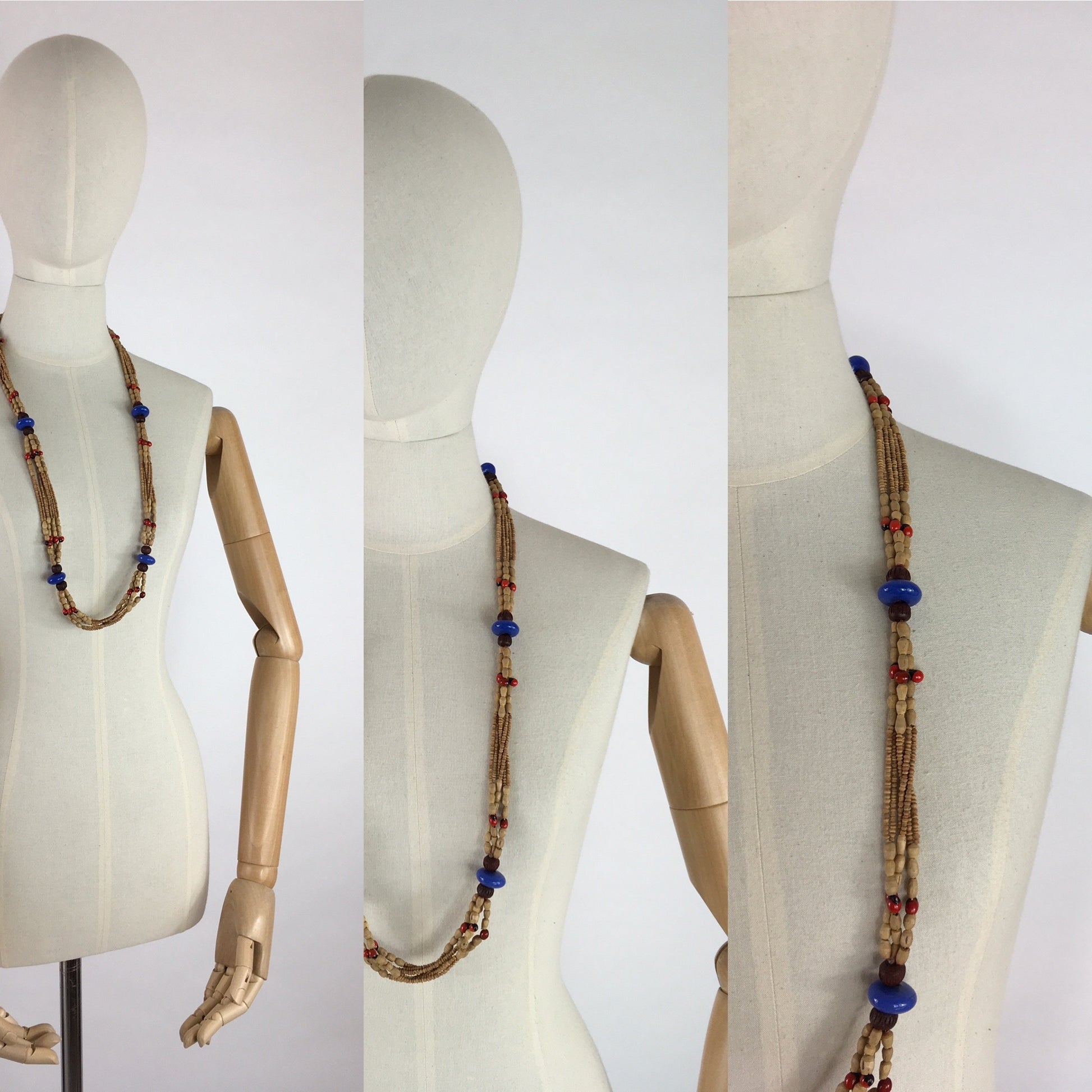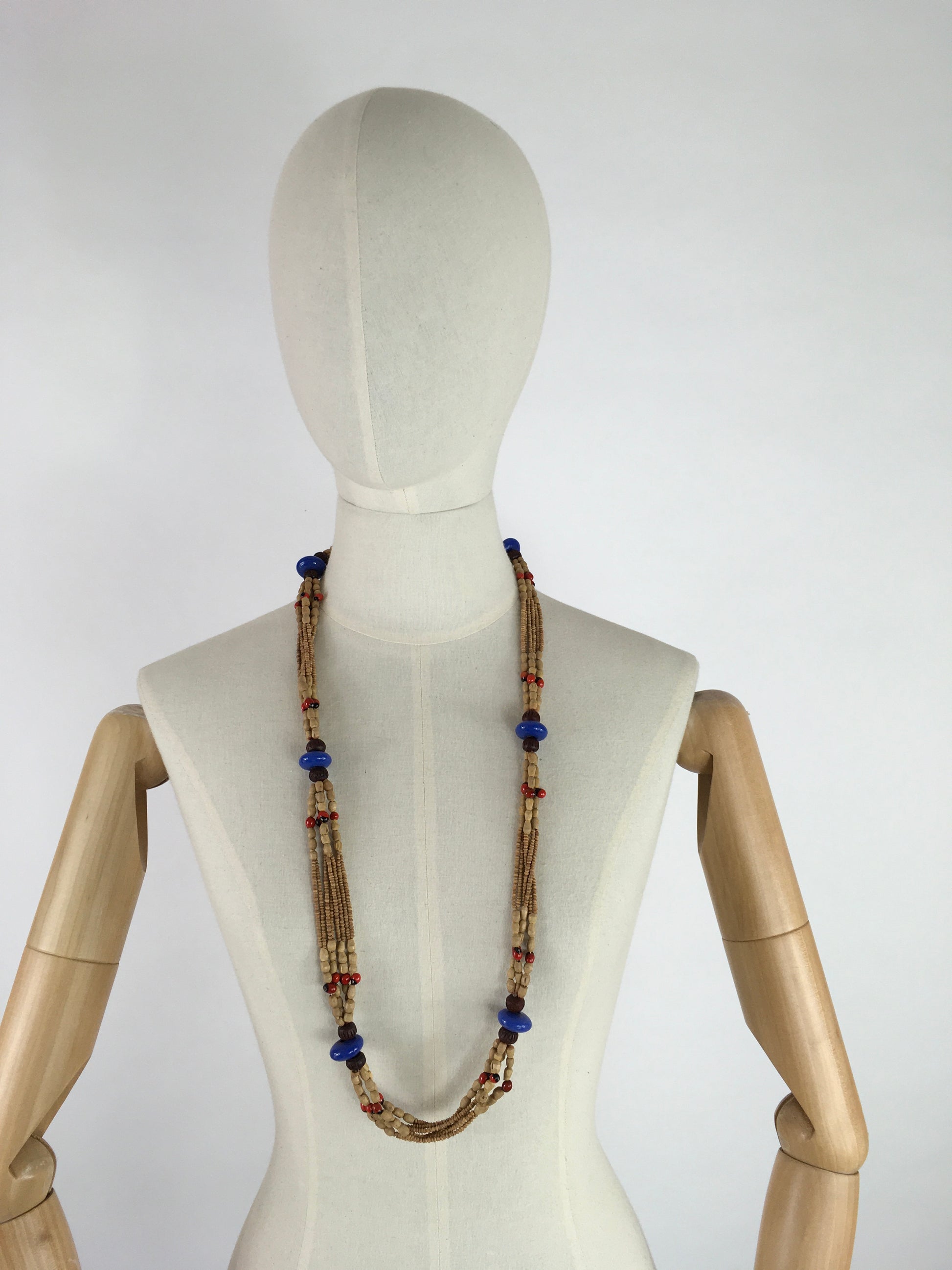 Vintage 1930s fabulous multi strand necklace made from wooden and glass beads in a lovely colour pallet of earthy wooden browns, bright blues and cherry reds. Measuring 35’ total Circumference this is a lovely piece to drape over blouses or dresses as a statement.