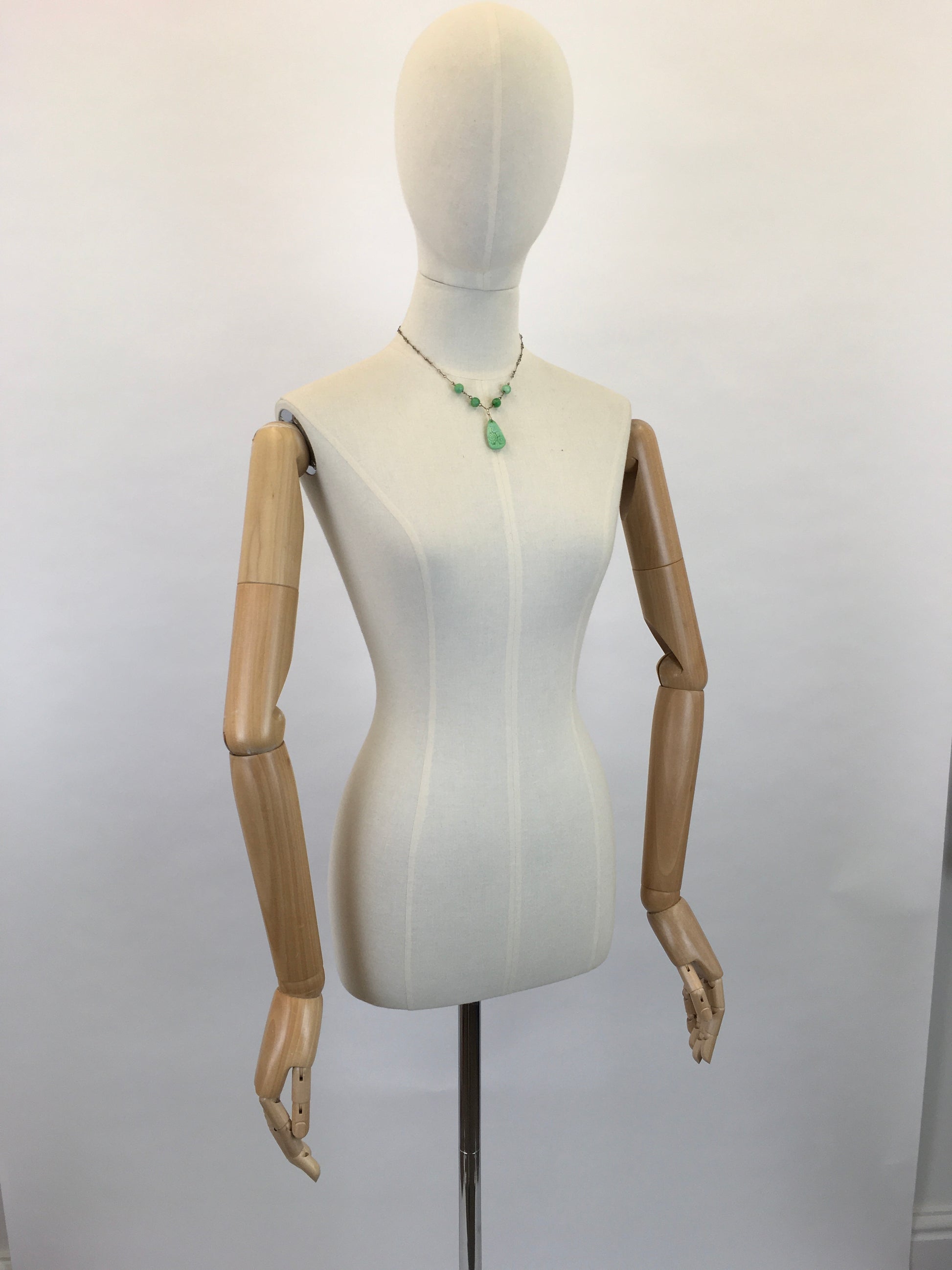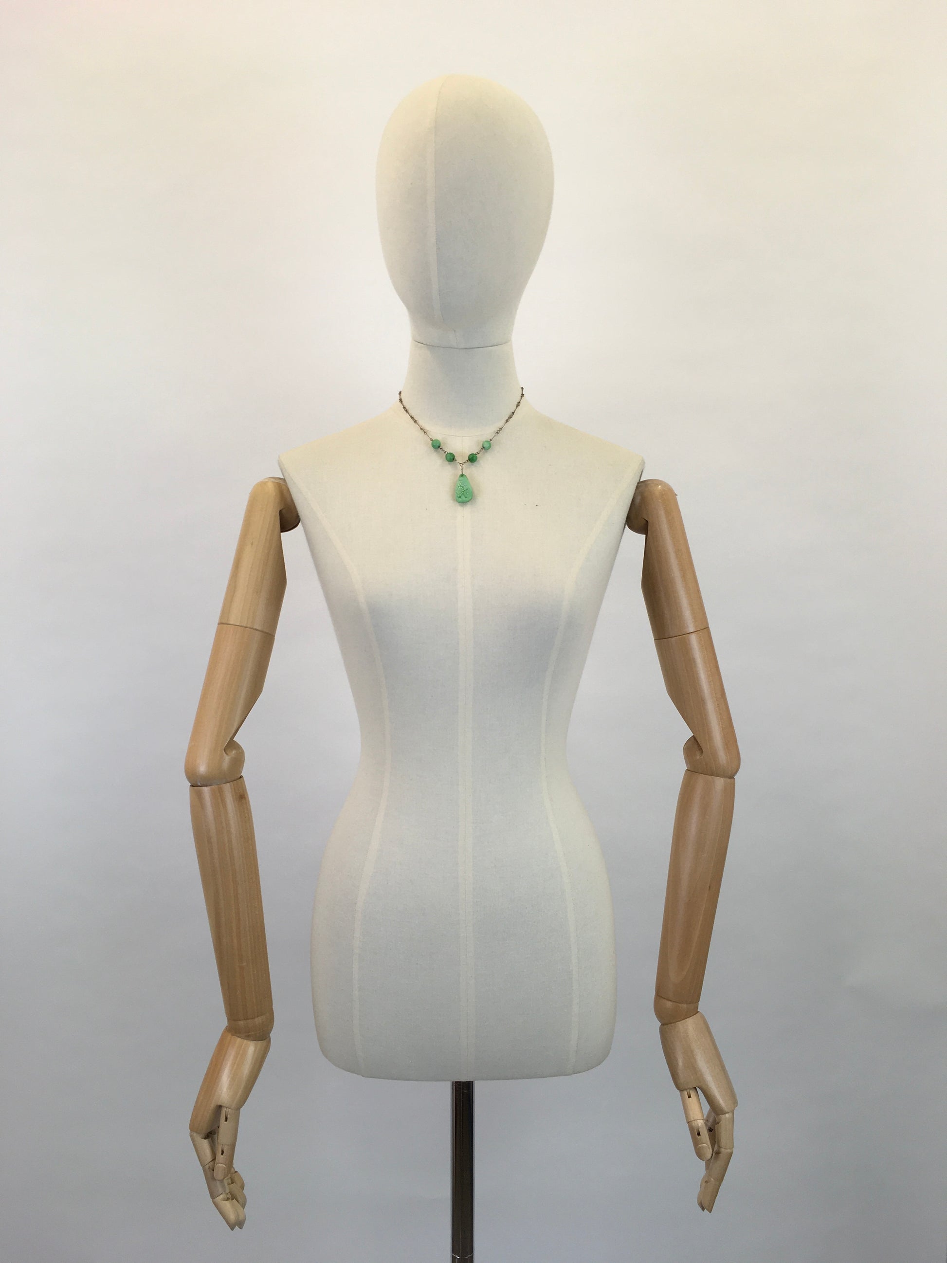 Vintage 1930s Green Glass beaded and pressed glass necklace. In that iconic 30’s green which is a must have for any 30’s wearer. The pendant is pressed glass with a beautiful floral design. A stunning piece as a gift to yourself or someone special.