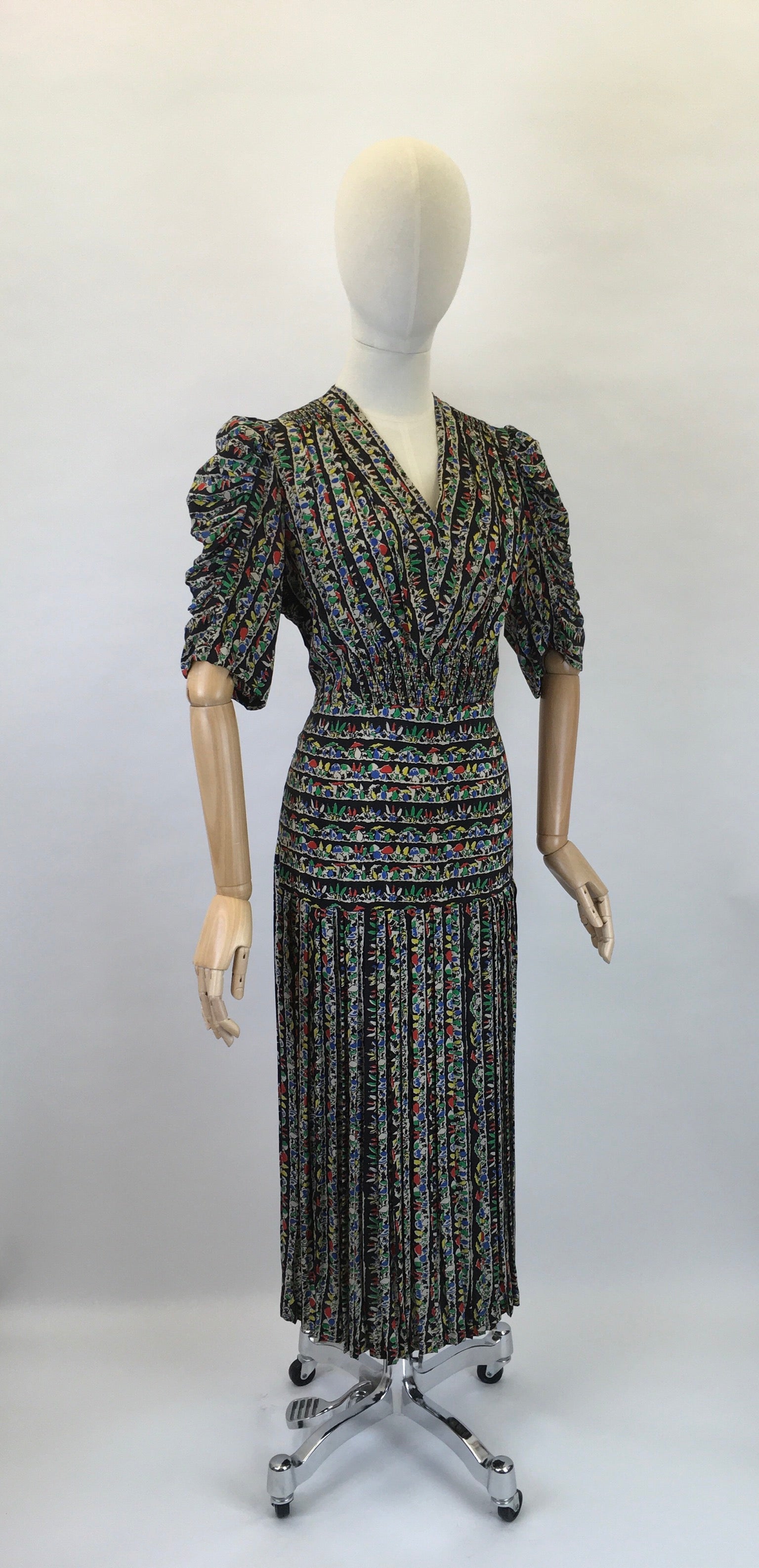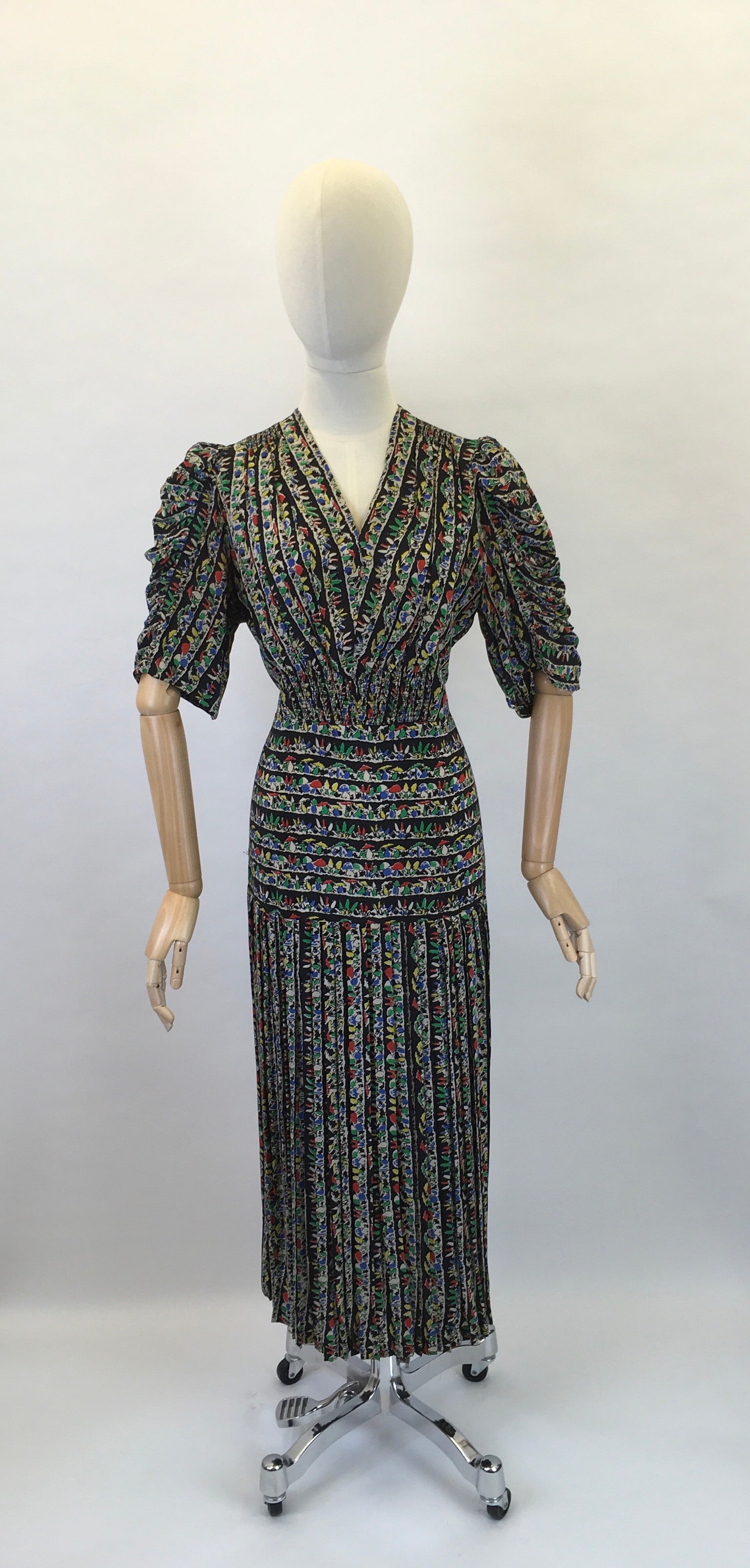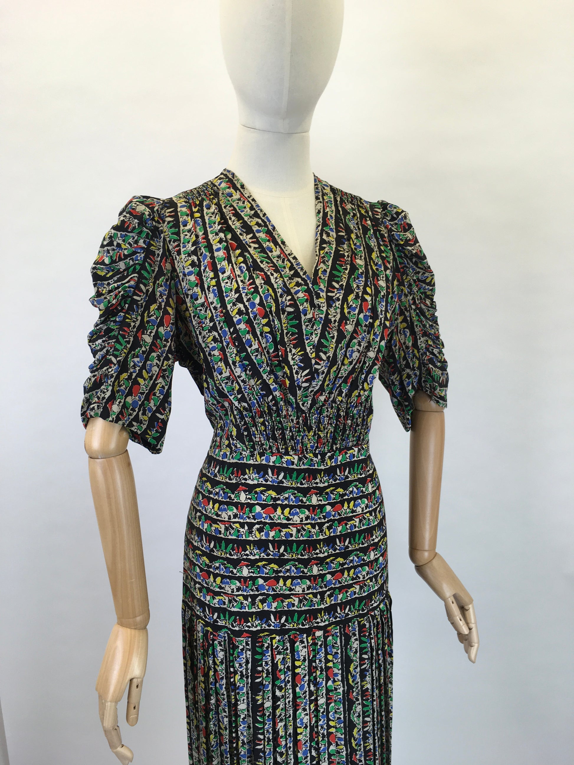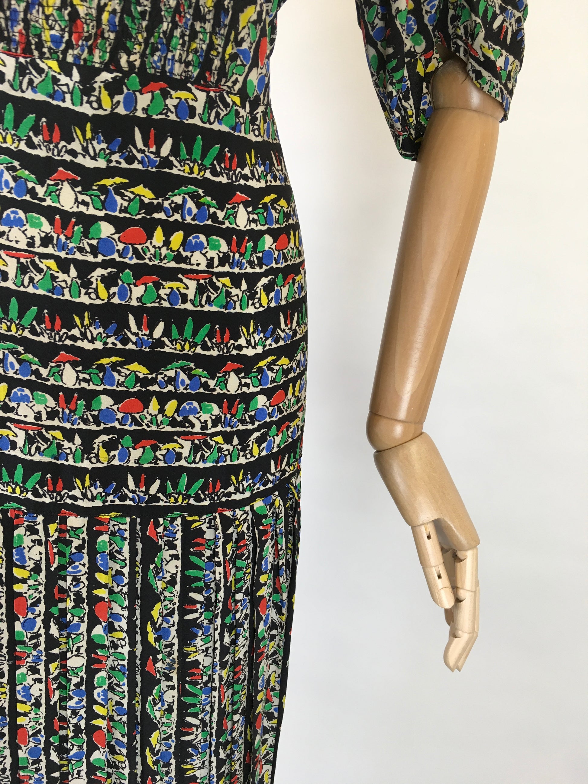 Vintage 1930s Stunning novelty print rayon dress featuring small toadstools in a fabulous burst of primary colours in red, yellow, green and blue on black. The dress has such an iconic 30’s silhouette featuring ruched gathered tulip sleeves, v neckline with panelled waistband in the contrast horizontal / vertical run of the print which then falls into a gathered skirt. The Dress has such fantastic movement and would look fabulous with an array of accessories for both daytime and evening occasions.