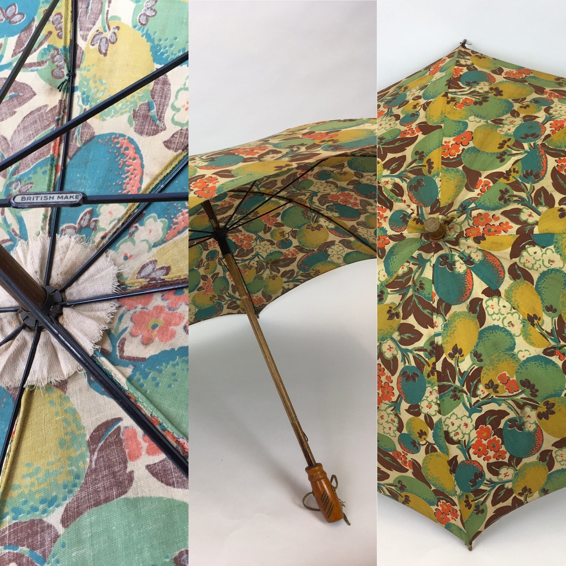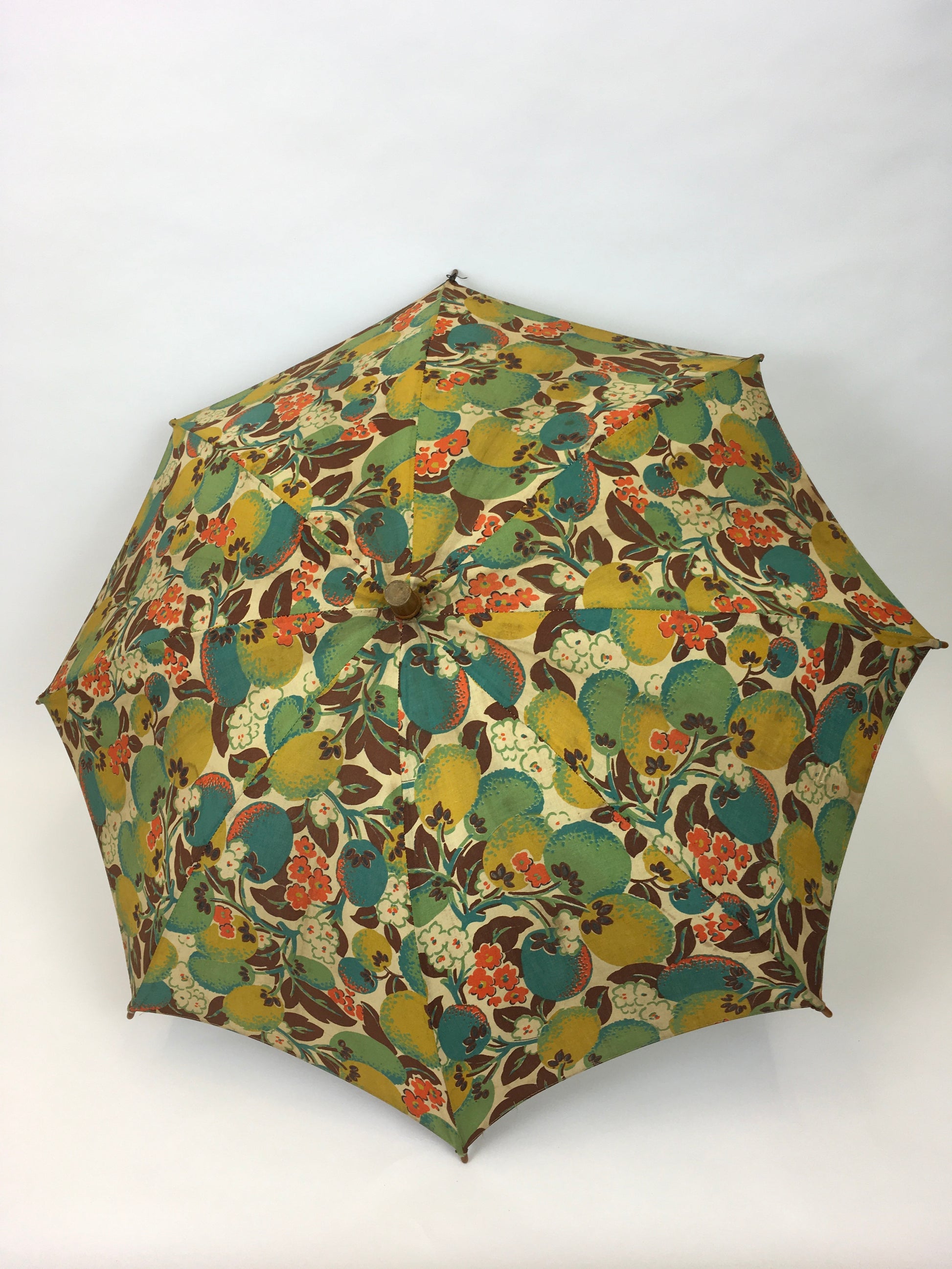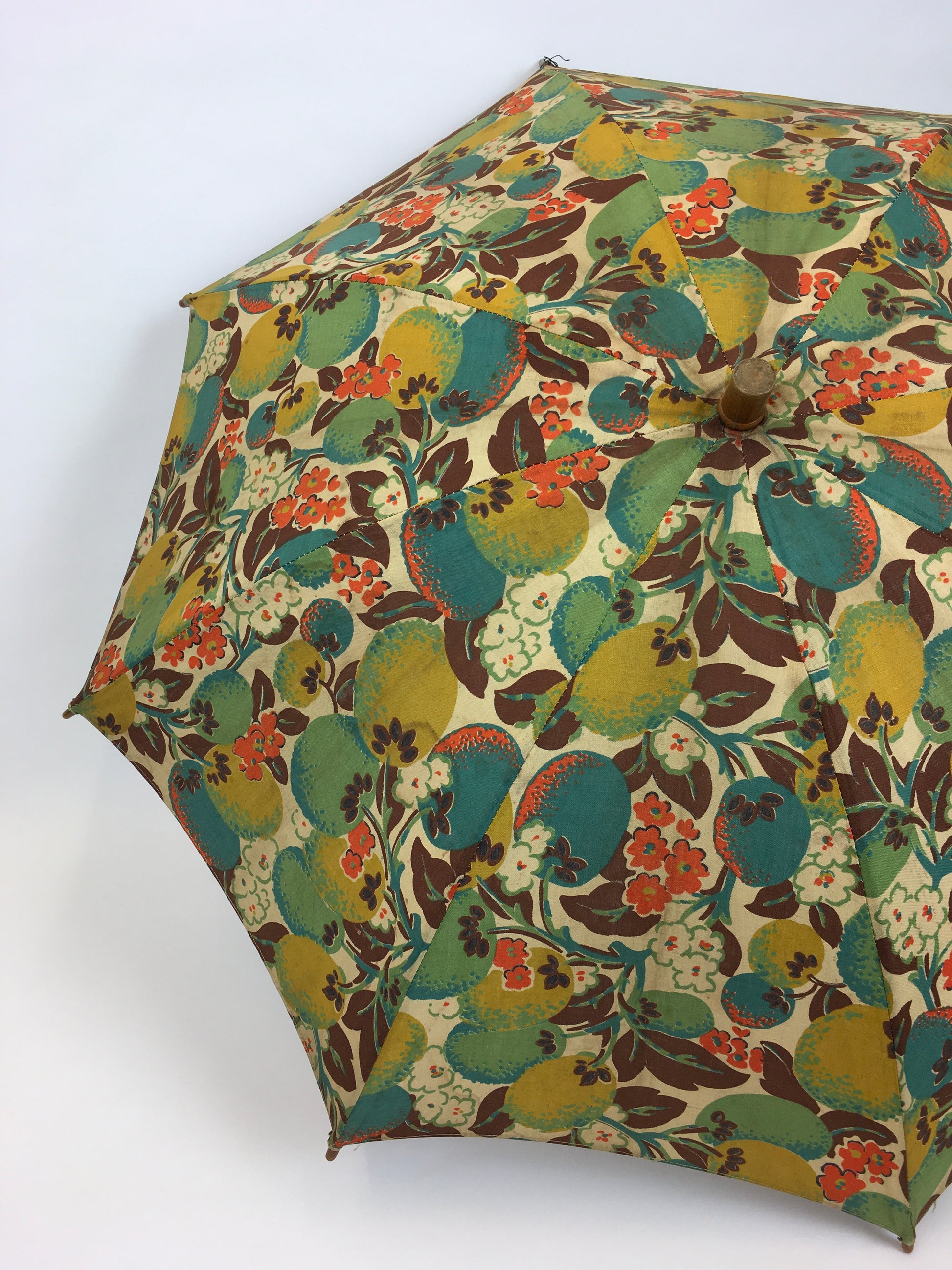 Original 1930’s stunning floral and fruit parasol in the most iconic deco colour palette of orange, brown, chartreuse and teal on a lovely printed cotton. Featuring metal spokes and frame with wooden accents and handle. Such a fabulous piece to use in the spring and summer months for lawn parties and days at the seaside.
