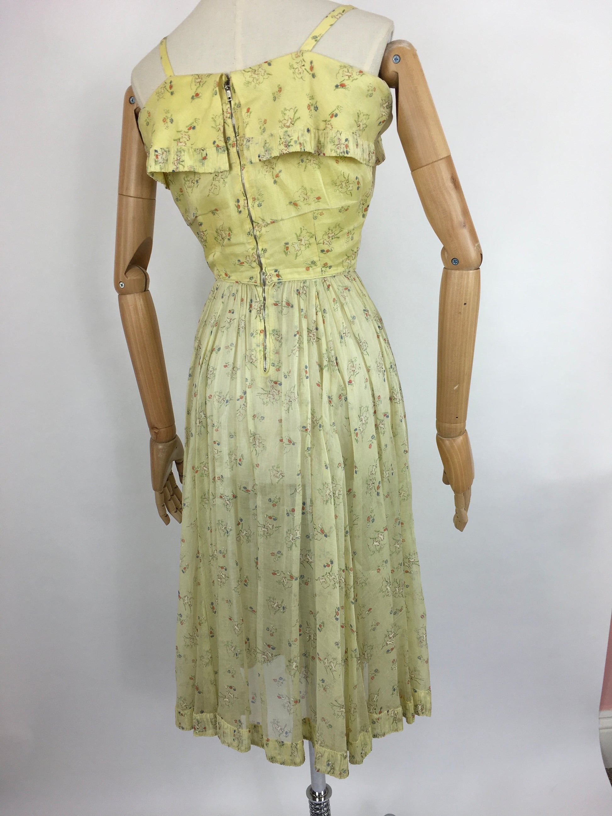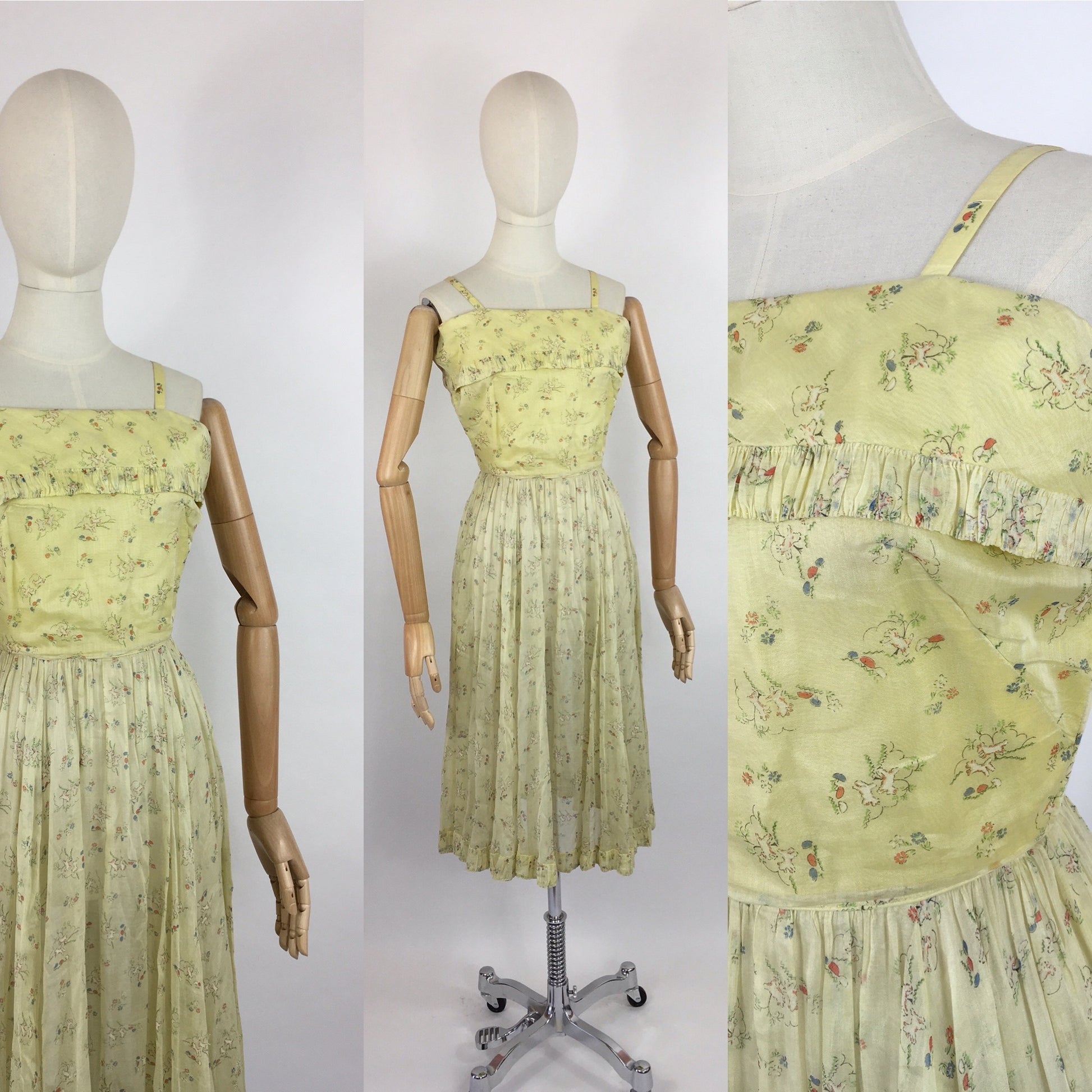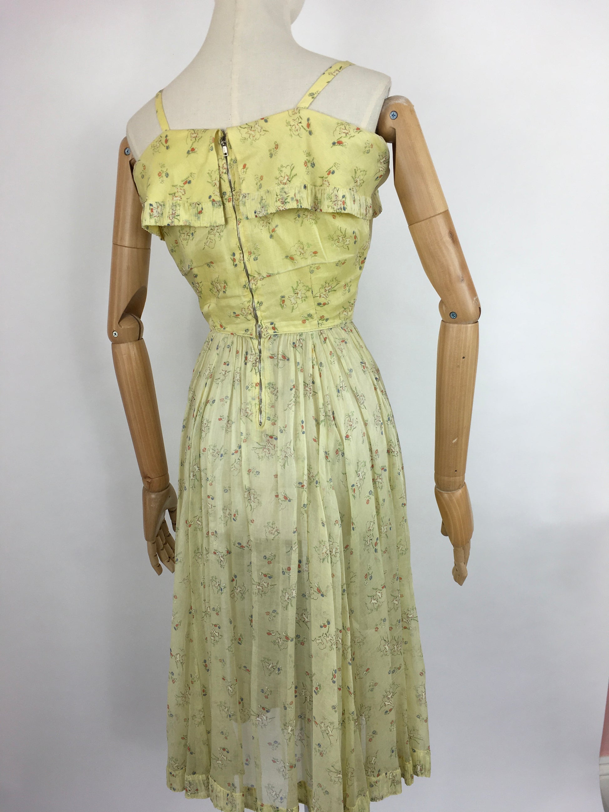 Vintage 1930s darling novelty print cotton lawn sundress featuring leaping lambs with toadstools on a pale lemon background. A classic dainty 30s silhouette this piece features thin straps, an almost overlay panel to the bust with pleated detailing which mimics the hemline. Fastens with a metal zip and hook and eye fastenings.