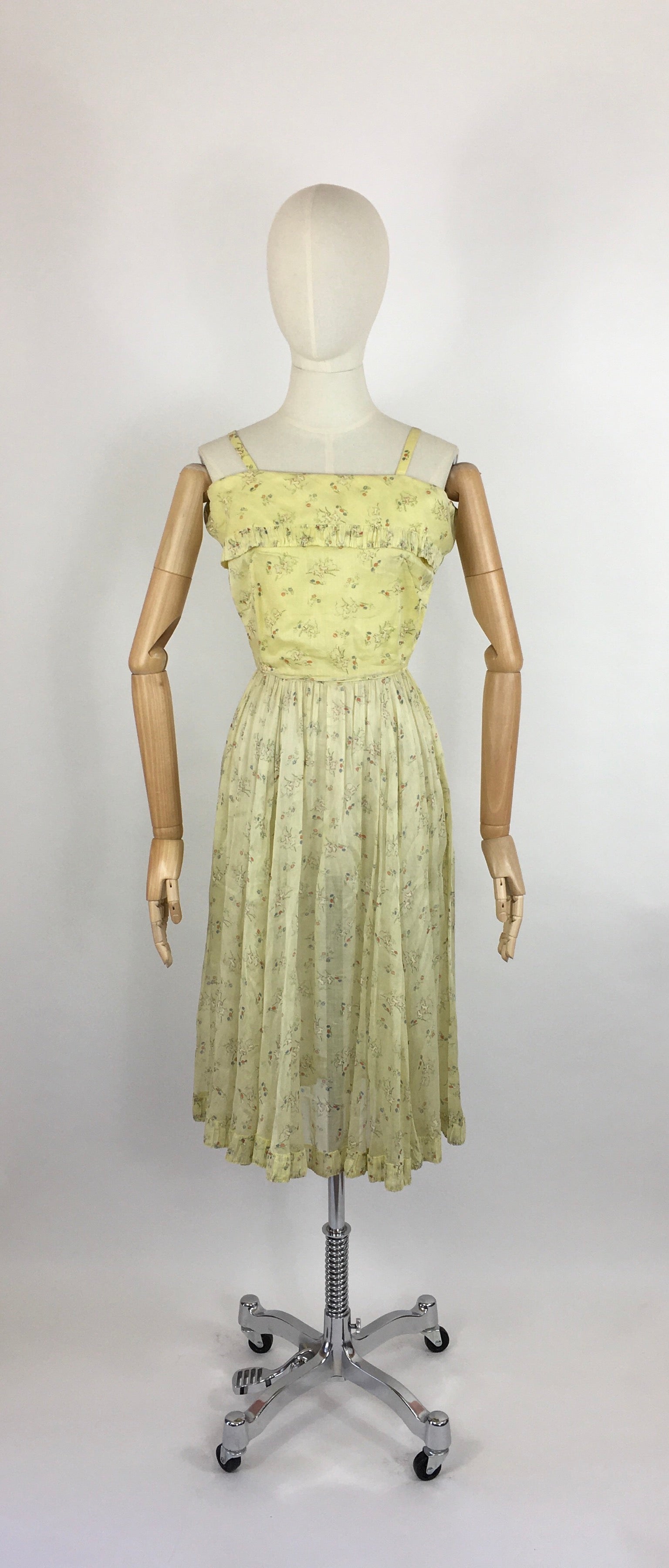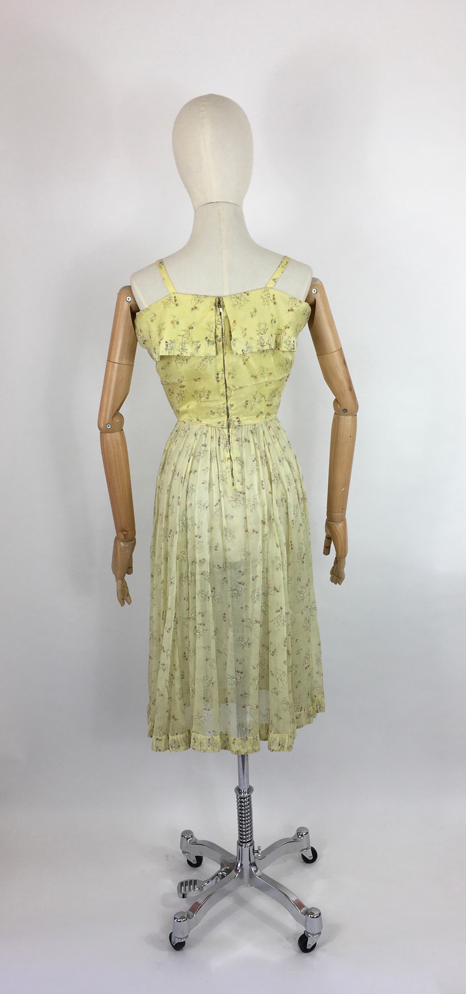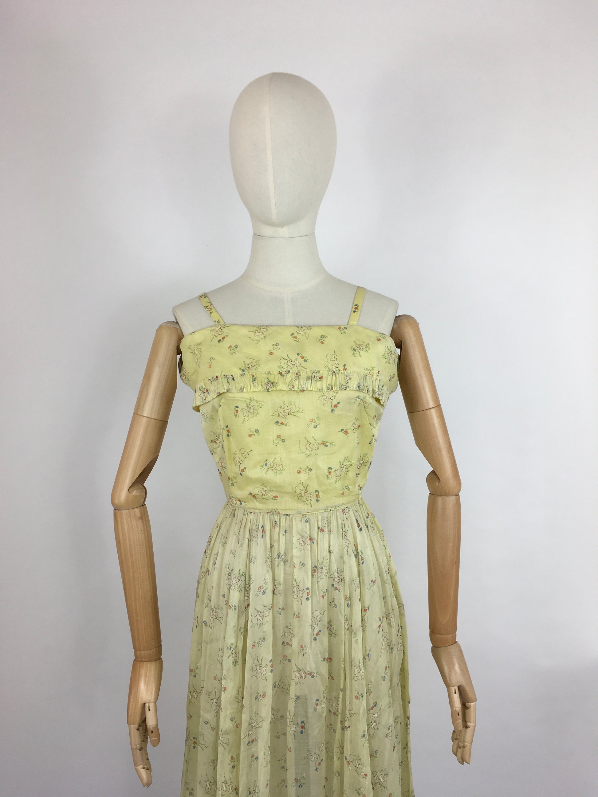 Vintage 1930s darling novelty print cotton lawn sundress featuring leaping lambs with toadstools on a pale lemon background. A classic dainty 30s silhouette this piece features thin straps, an almost overlay panel to the bust with pleated detailing which mimics the hemline. Fastens with a metal zip and hook and eye fastenings.