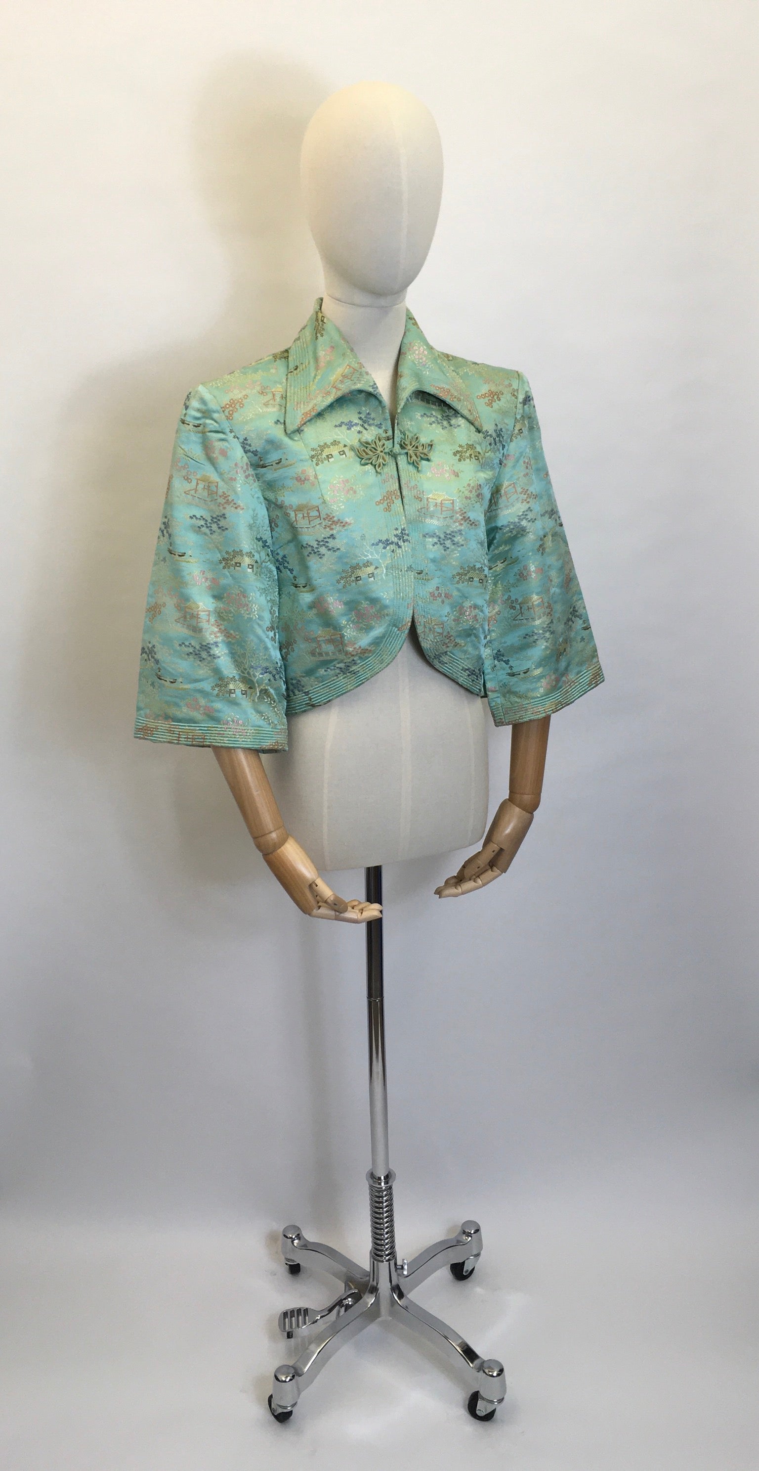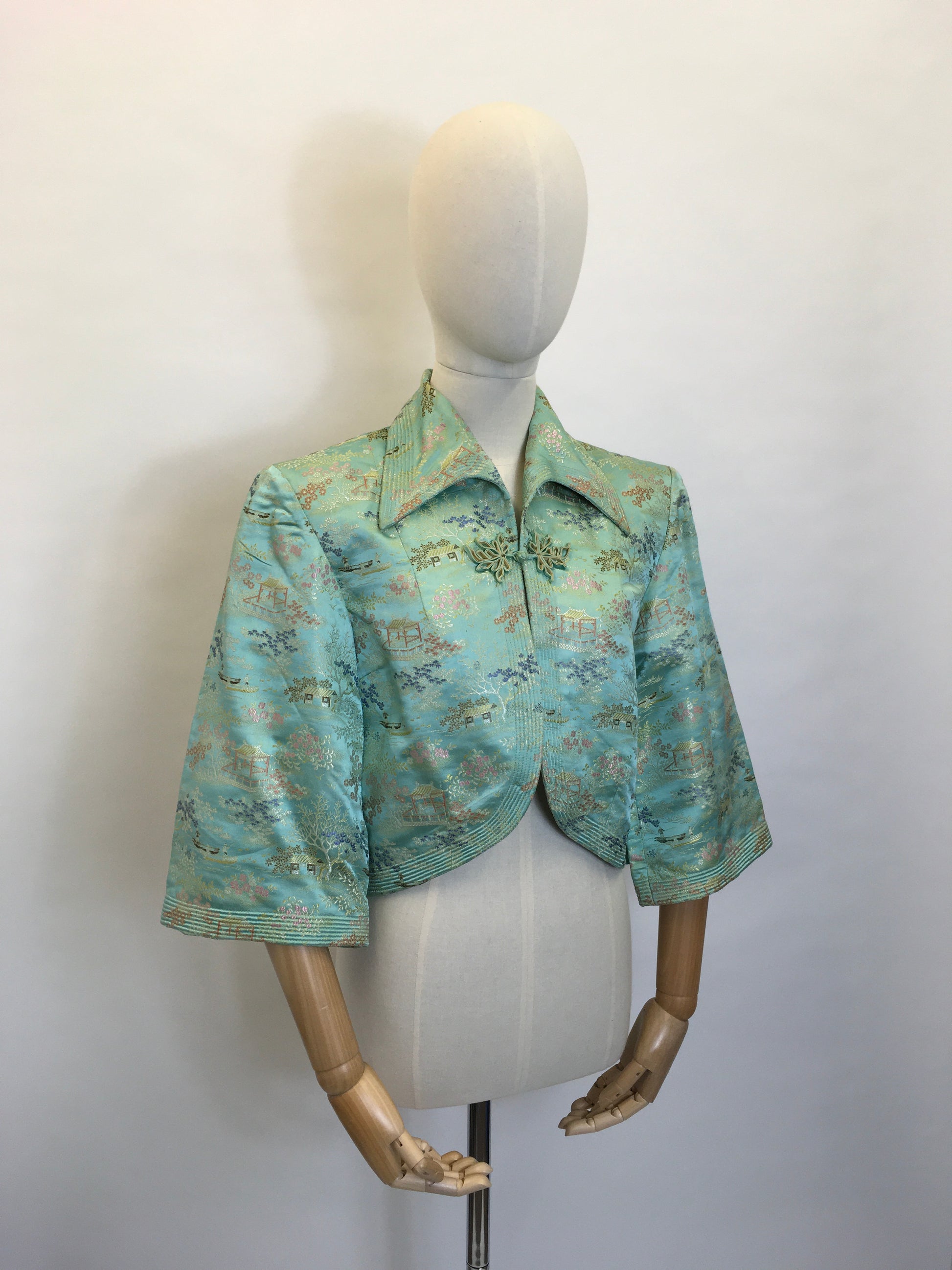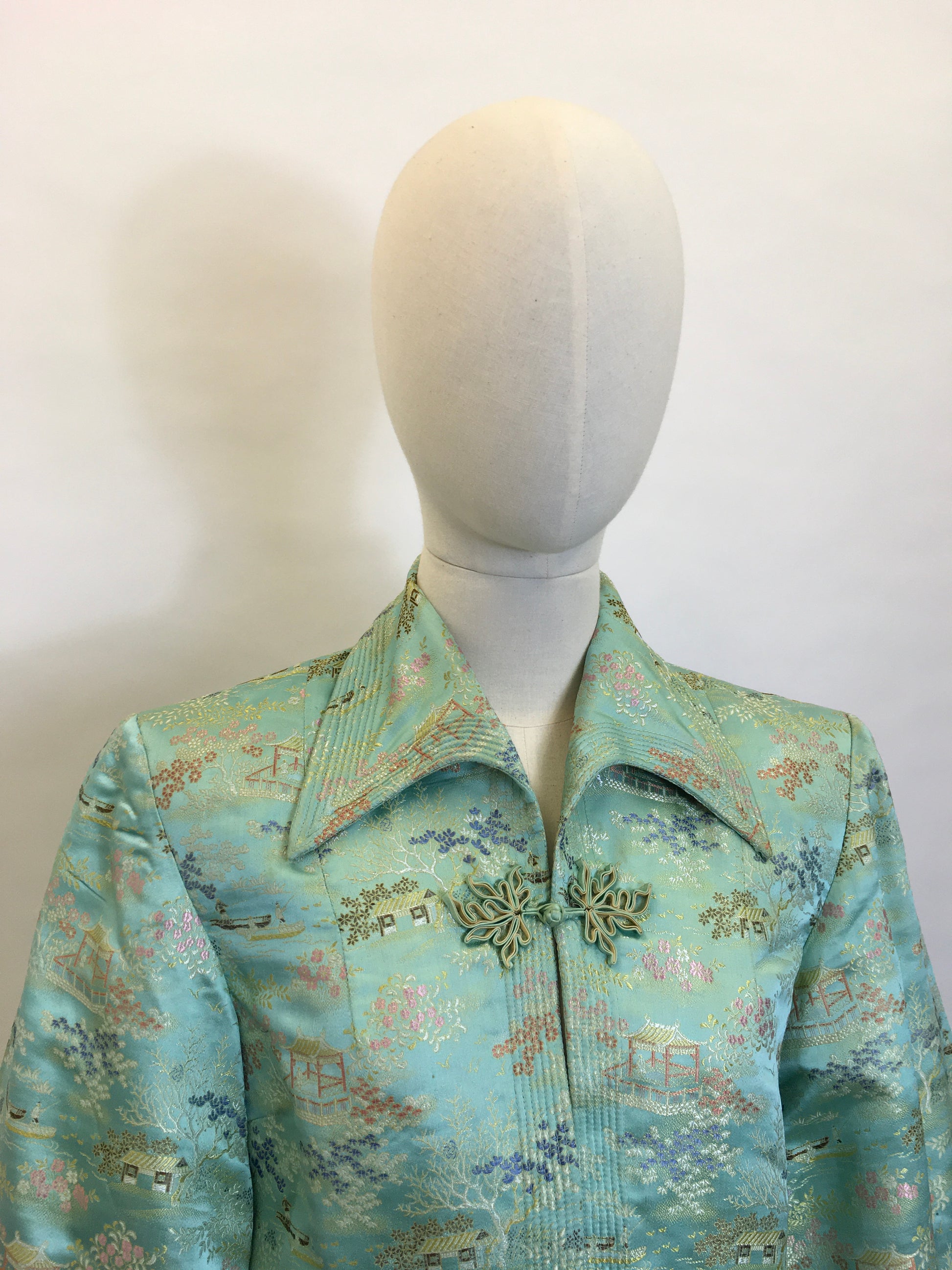 Vintage 1937 Oriental Loungewear Jacket made by ‘ Ying Tai Co ‘ in immaculate condition. Sadly it’s original box was destroyed but it preserved this beauty inside. Featuring a strong pointed collar with stitched detailing, shaped front and fabulous sleeves this piece really is a showstopper. Can be worn inside or equally outside with wide leg lounge pants and a blouse or over a simple dress. The colours of the silk are exquisite including rich golds, powdered pinks, greens and blues all on a bed of a light duck egg blue. It has a contrast pale yellow lining.