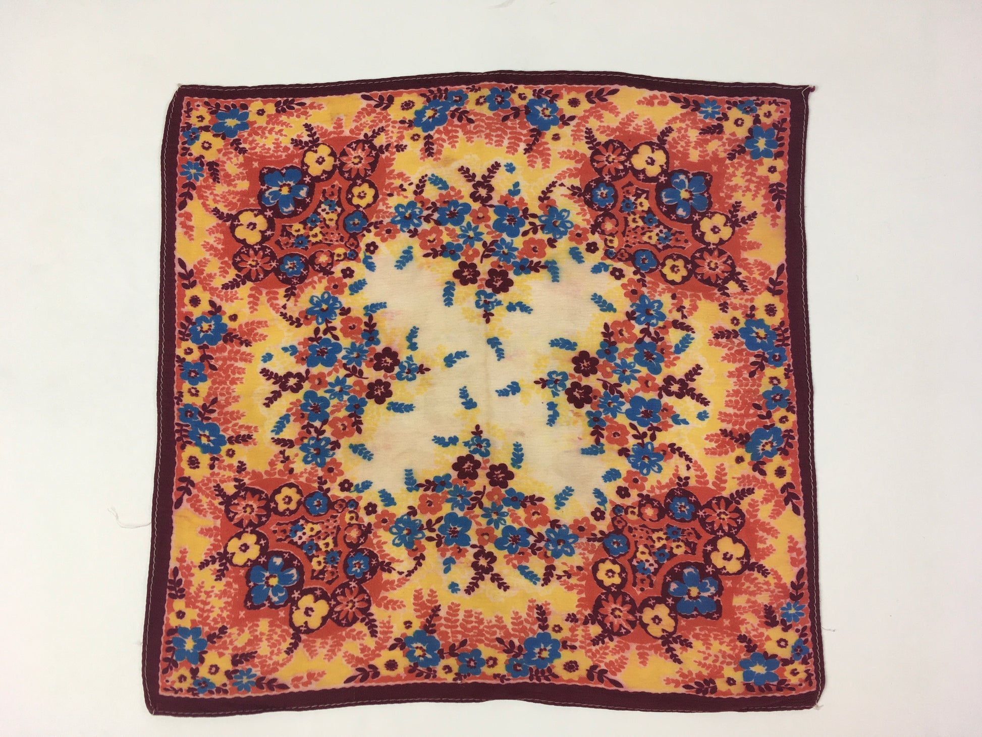 Original 1940’s / 1950’s Rayon Hankie - In A Lovely Floral In Burgundy, Oranges, Blues and Yellows