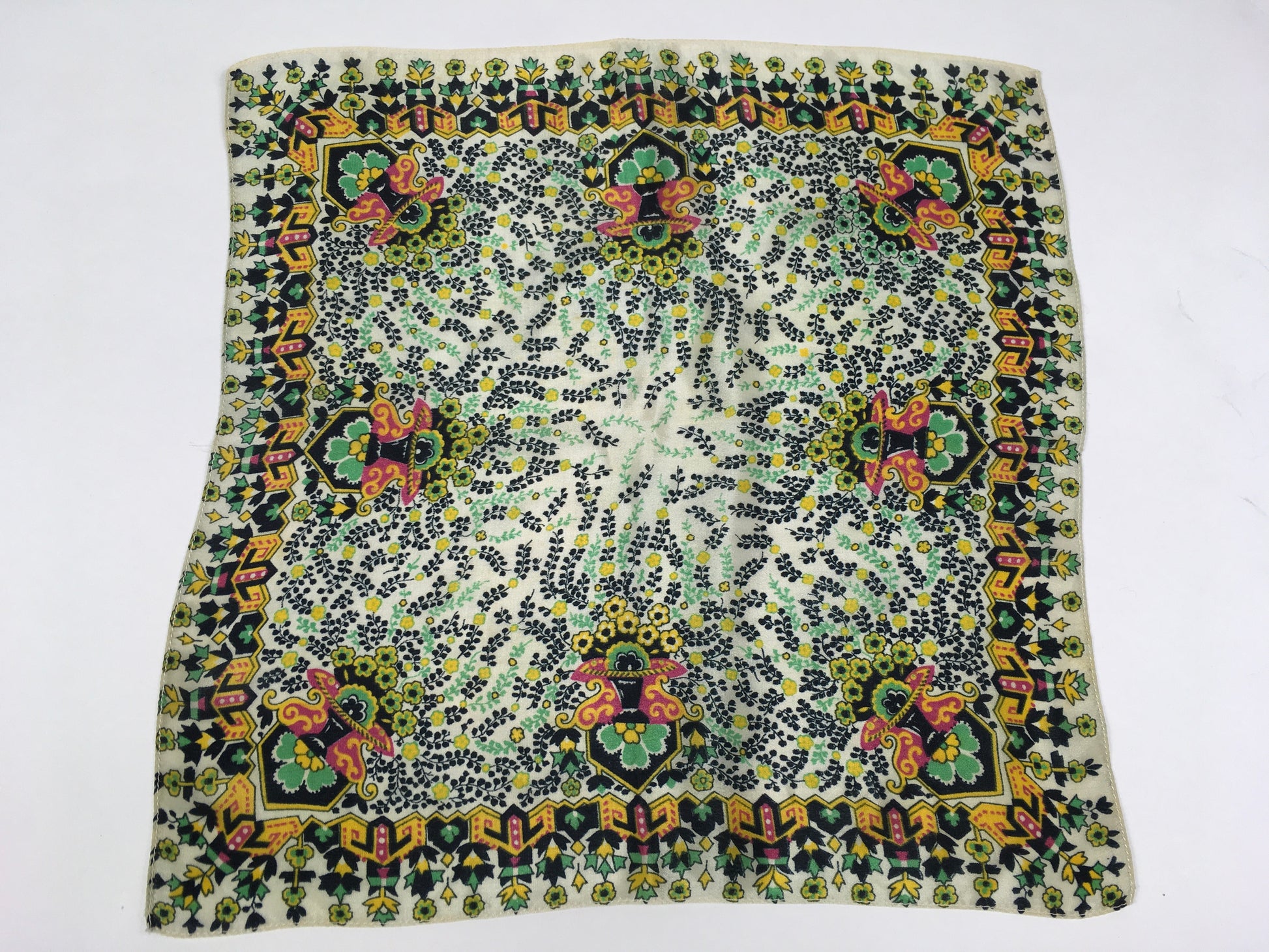 Original 1940’s / 1950’s Silk Hankie - In Lovely Bright Greens, Yellows, Black & Pink
