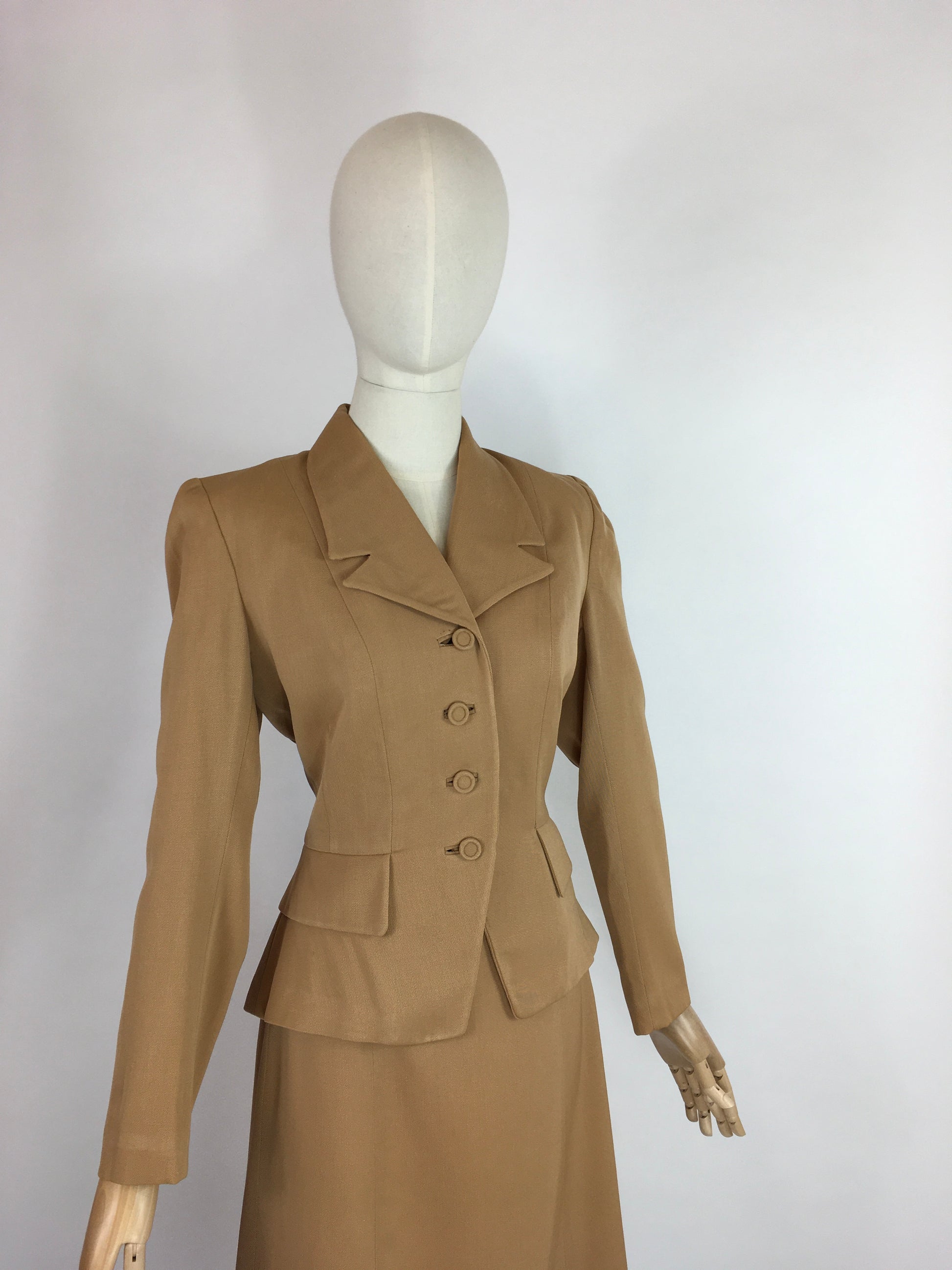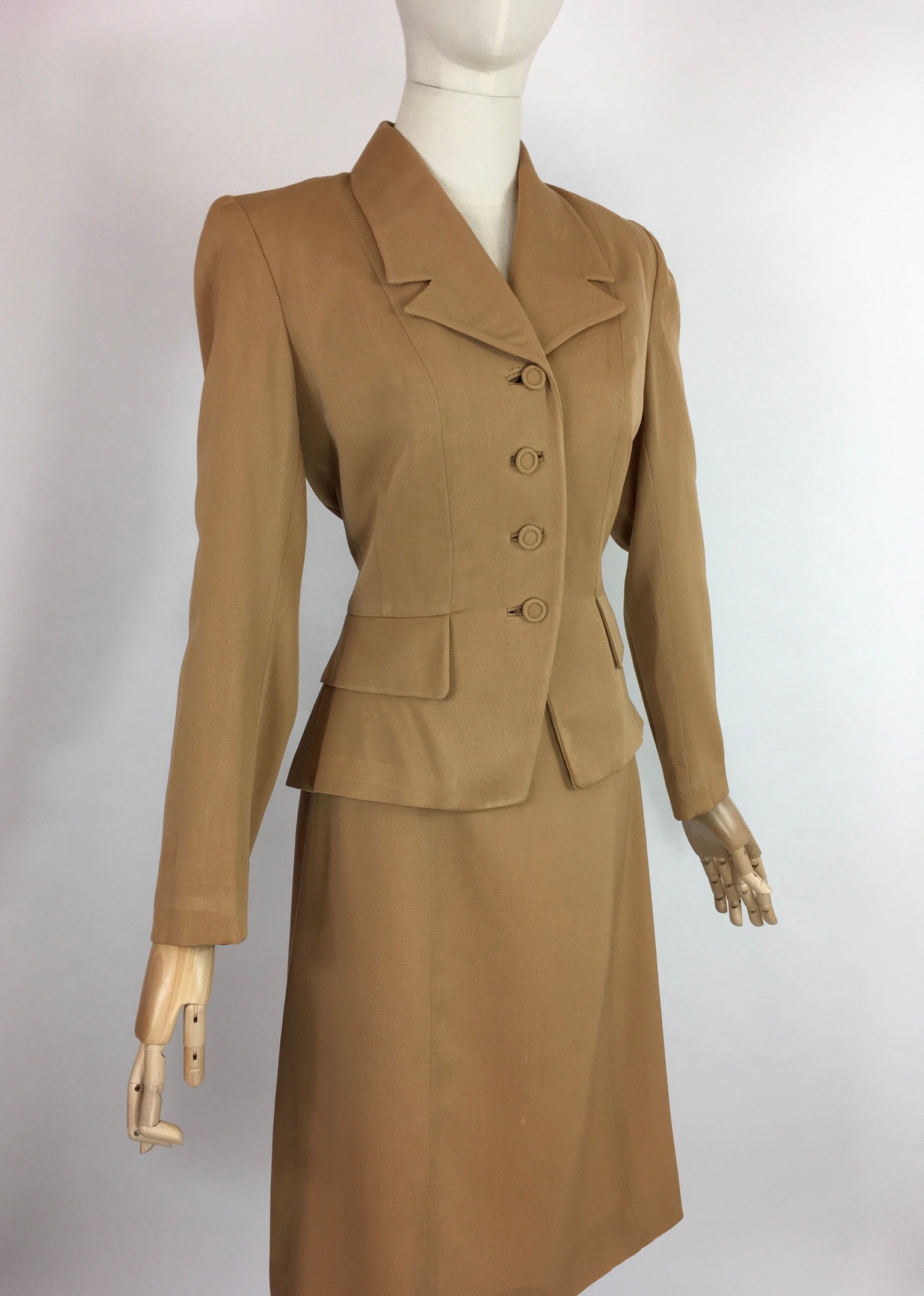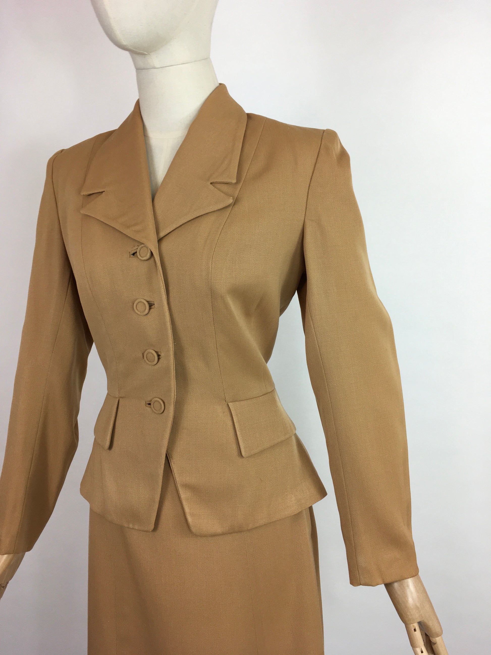 Original 1940’s 2 piece suit In A Lovely Soft Caramel Garbadine - With Amazing Arrow and Button Detailing