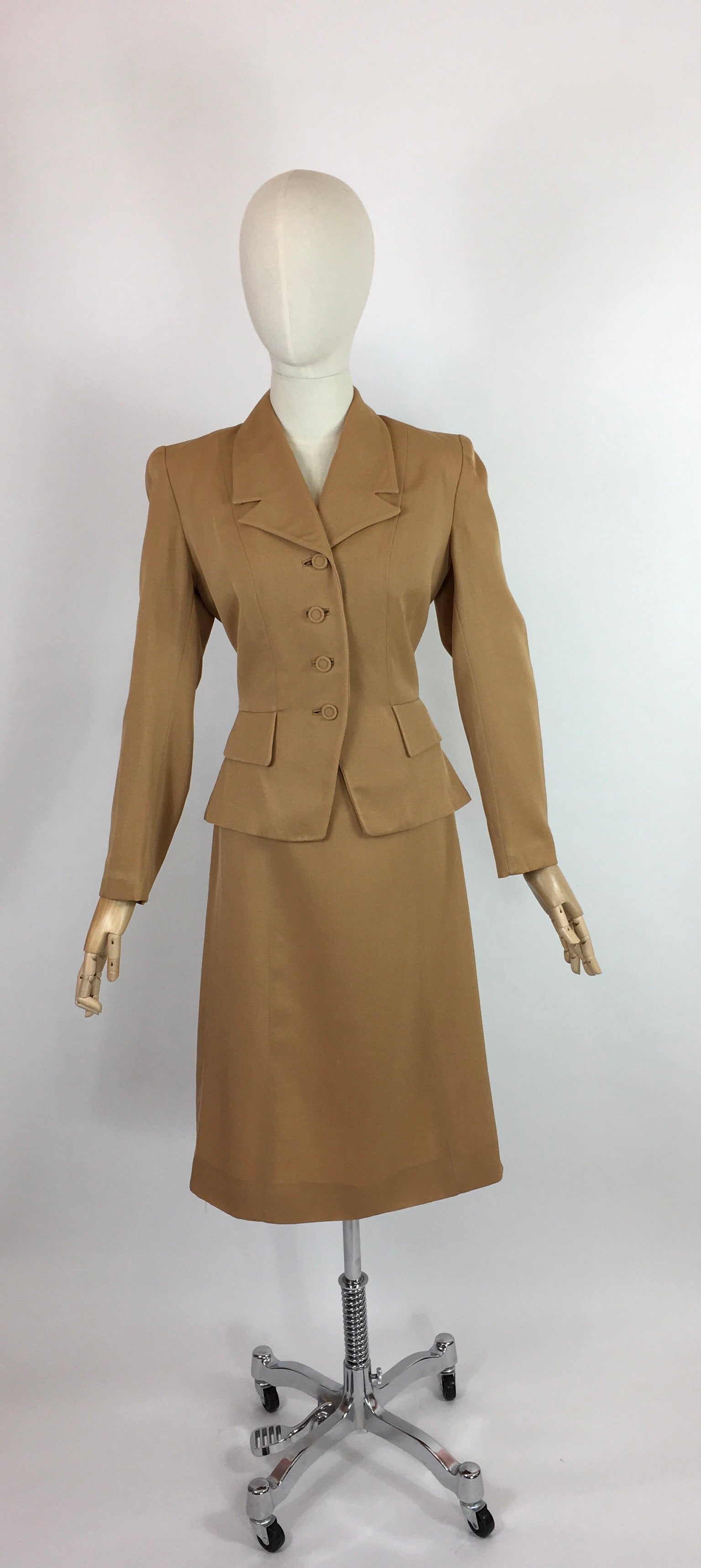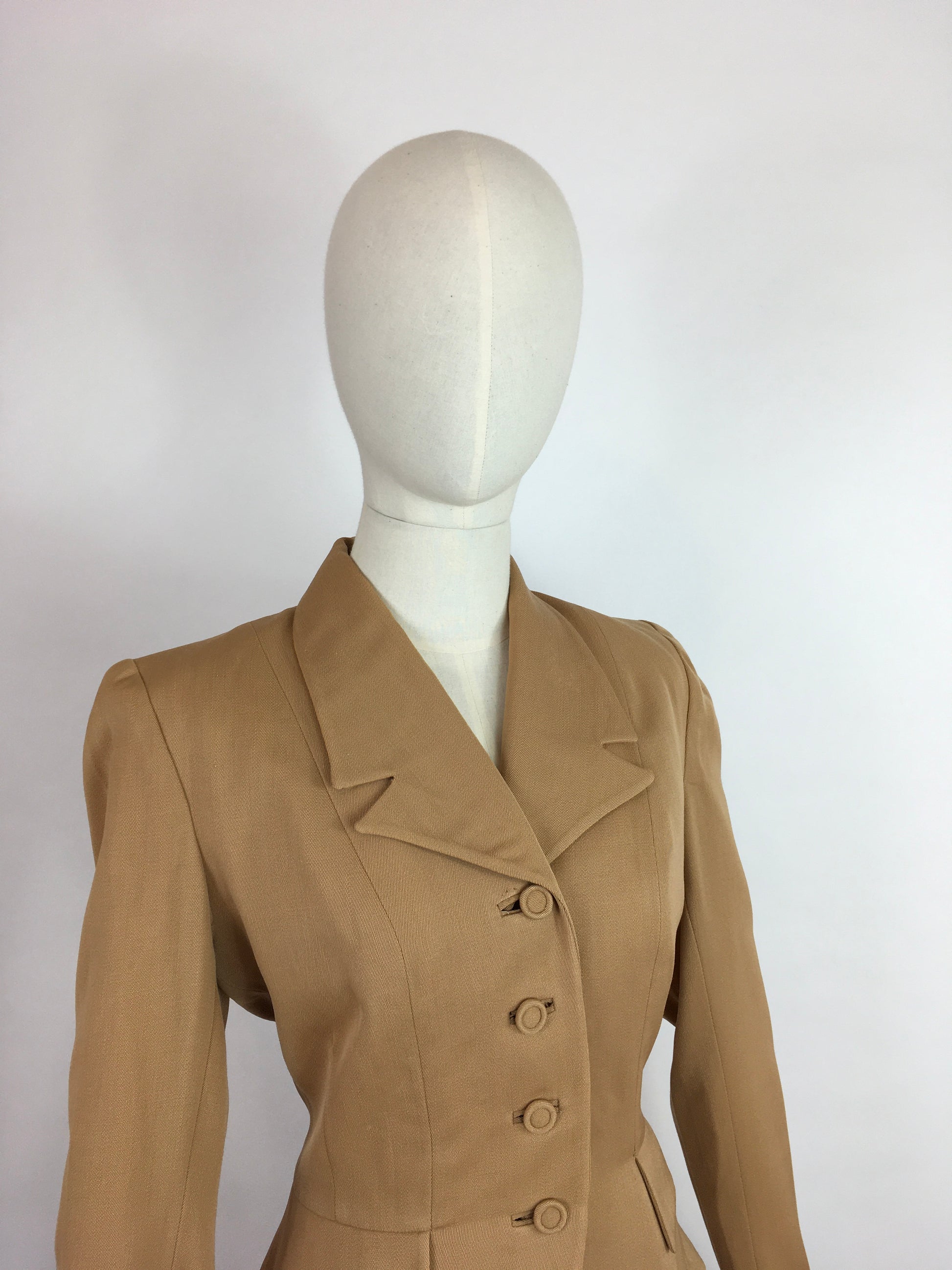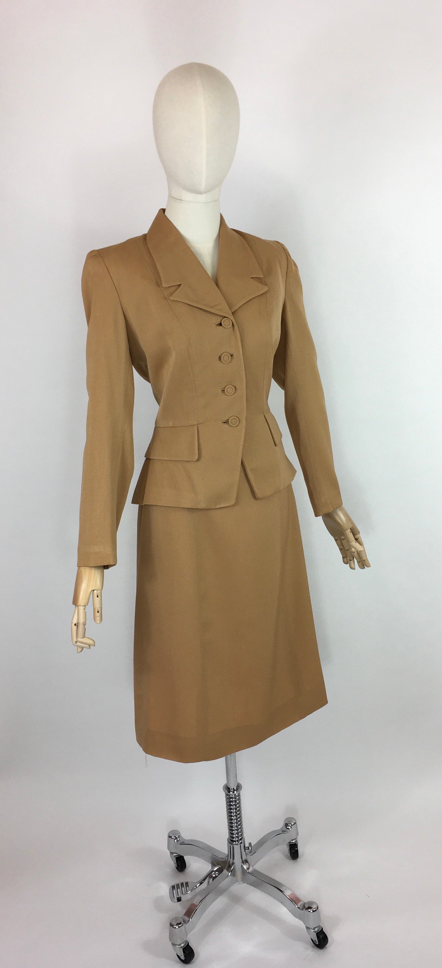 Original 1940’s 2 piece suit In A Lovely Soft Caramel Garbadine - With Amazing Arrow and Button Detailing