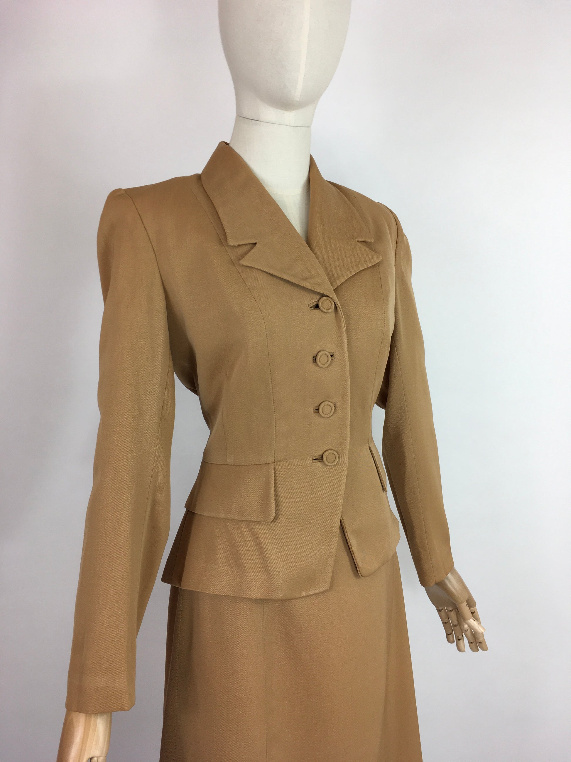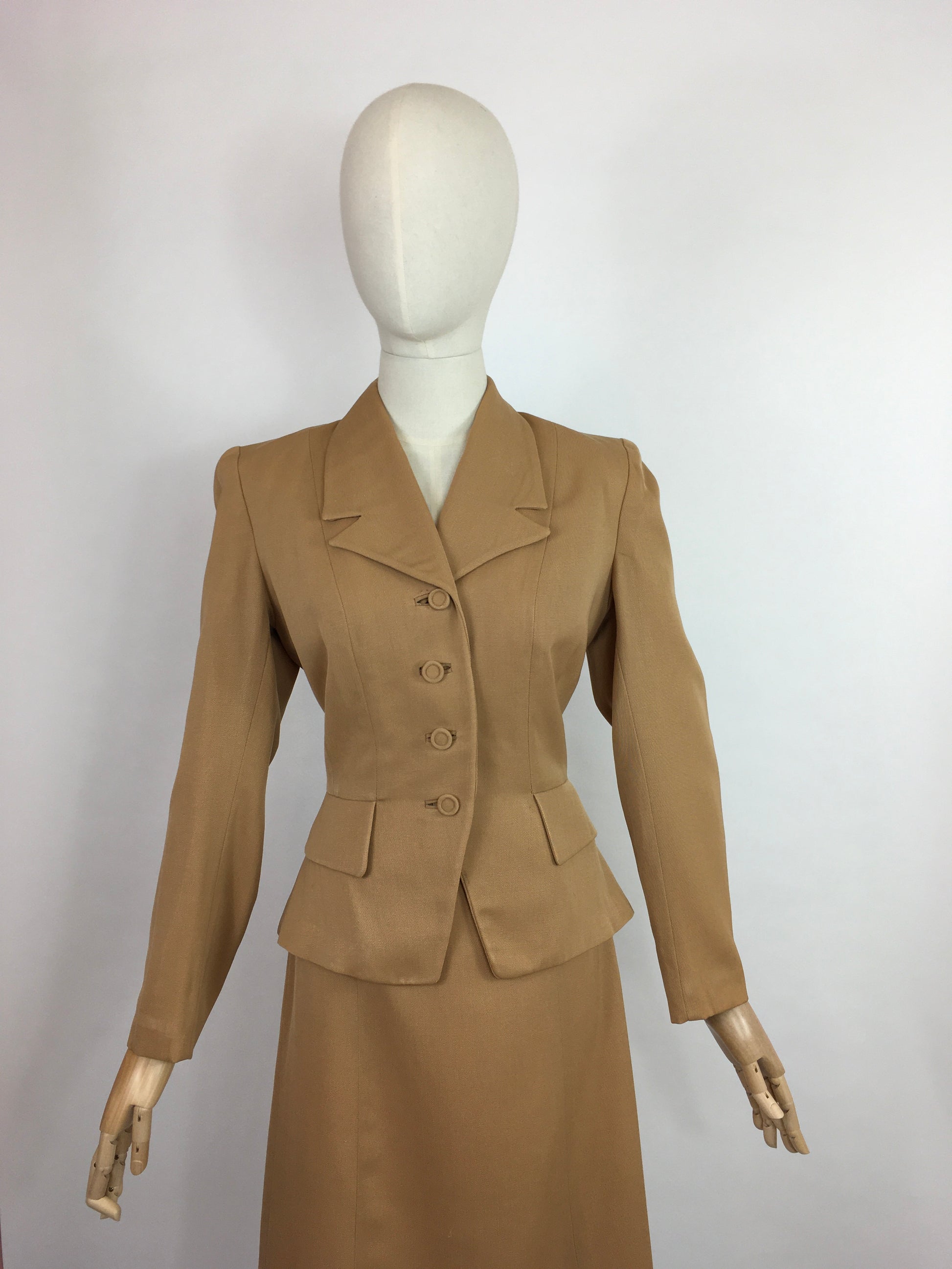Vintage 1940’s 2 piece suit in a lovely soft caramel gabardine fabric. The suit features a classic 40’s Hollywood shape with structured shoulders and pads, button front, nipped in waist with matching fabric buttons, amazing button and arrow detailing to the back and full length sleeves. The skirt is a lovely a line shape with metal zip and button fastening.