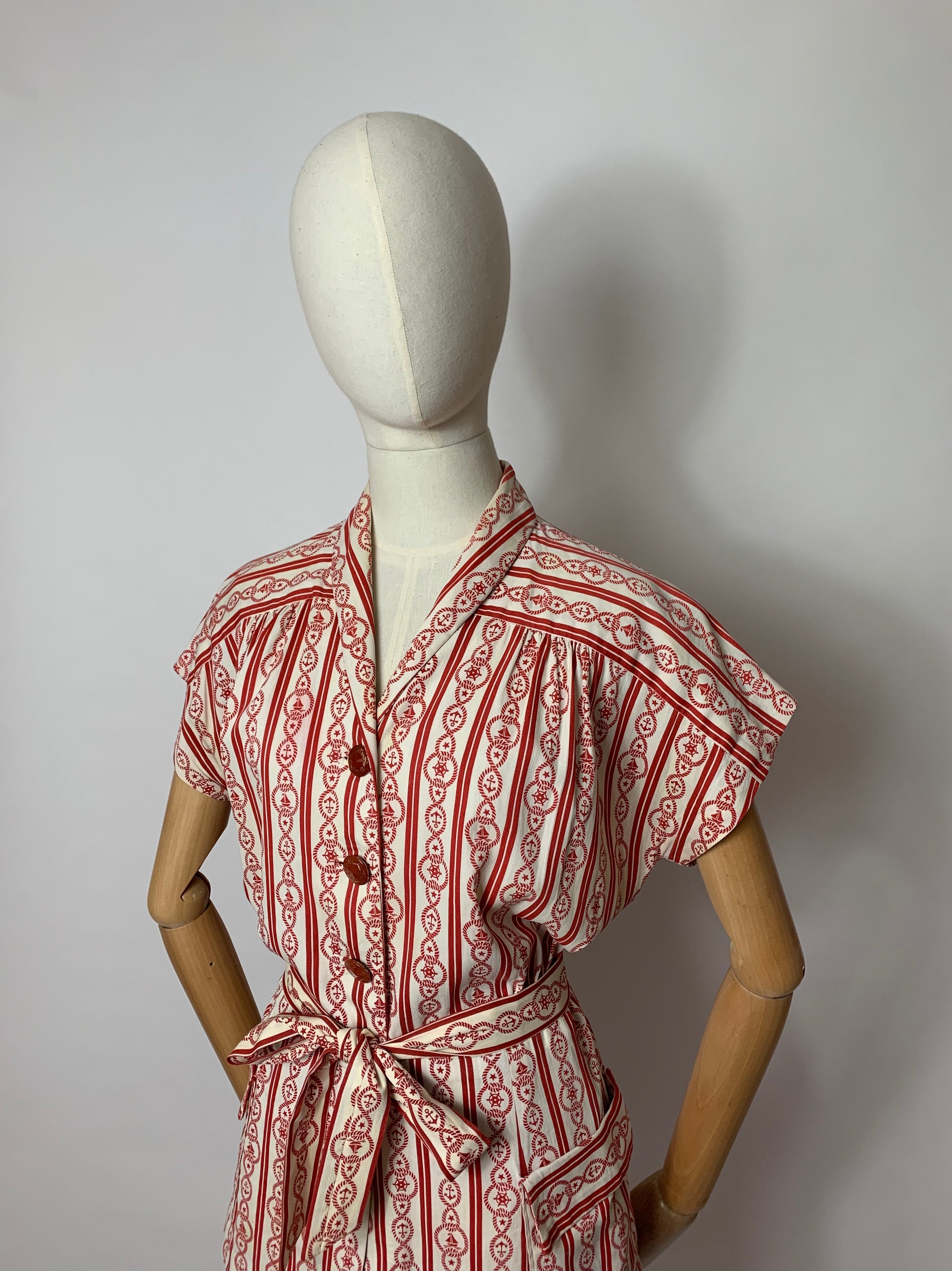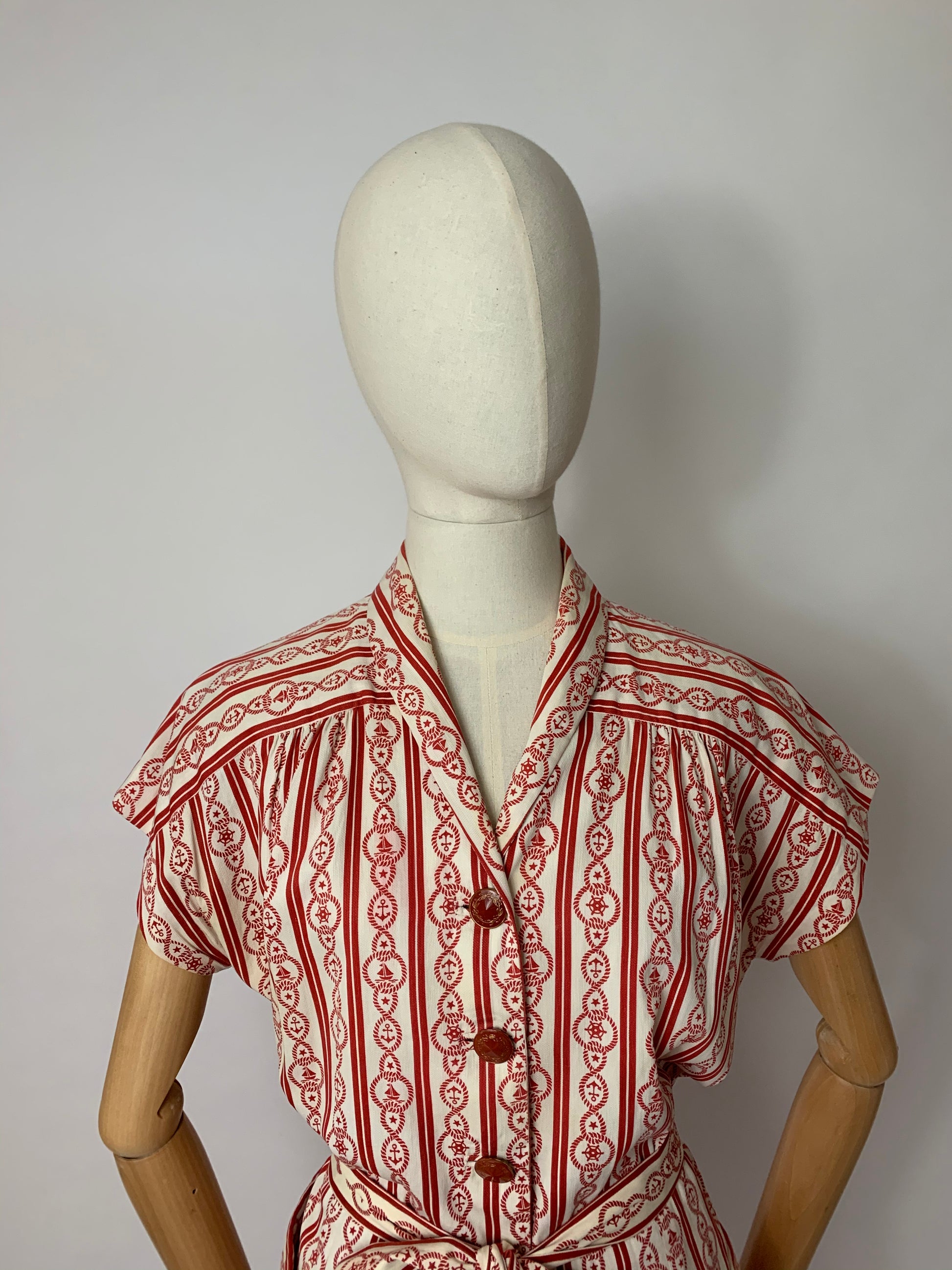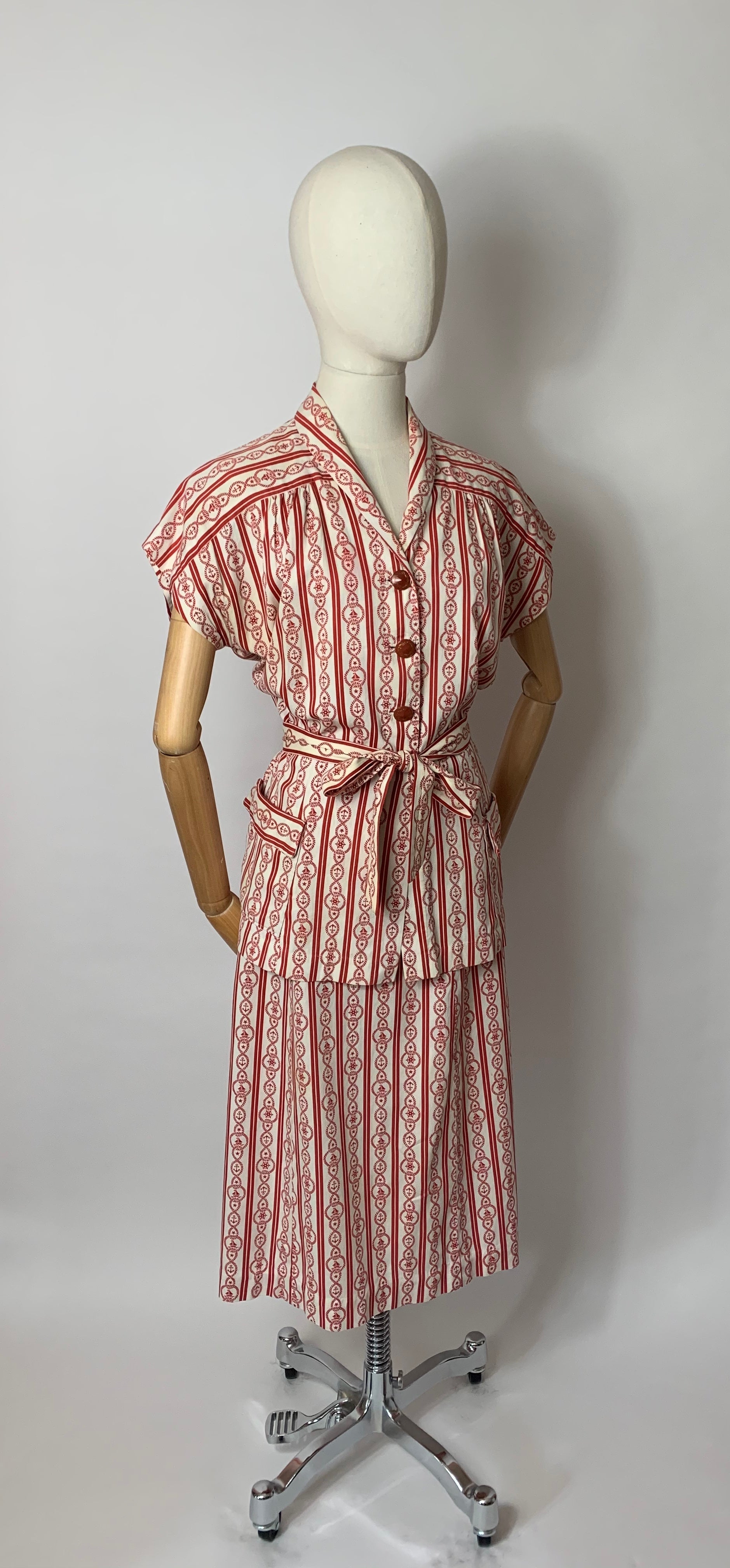 Vintage 1940’s 3 pc summer suit consisting of jacket, skirt and belt In a lovely lightweight cotton fabric in a nautical red & ivory print. Featuring a sharp collar, button down front and pockets with a simple a line skirt which fastens with poppers.