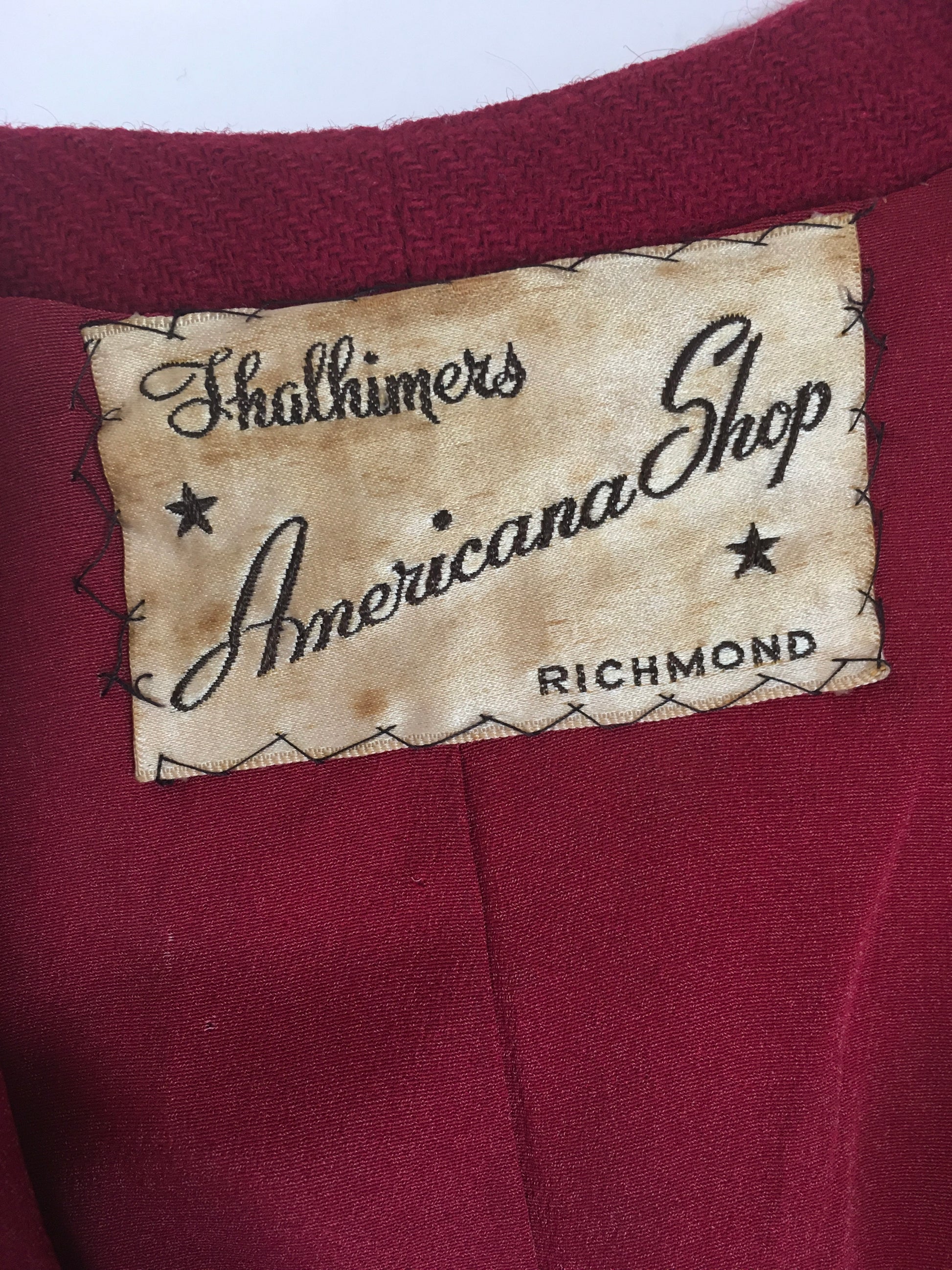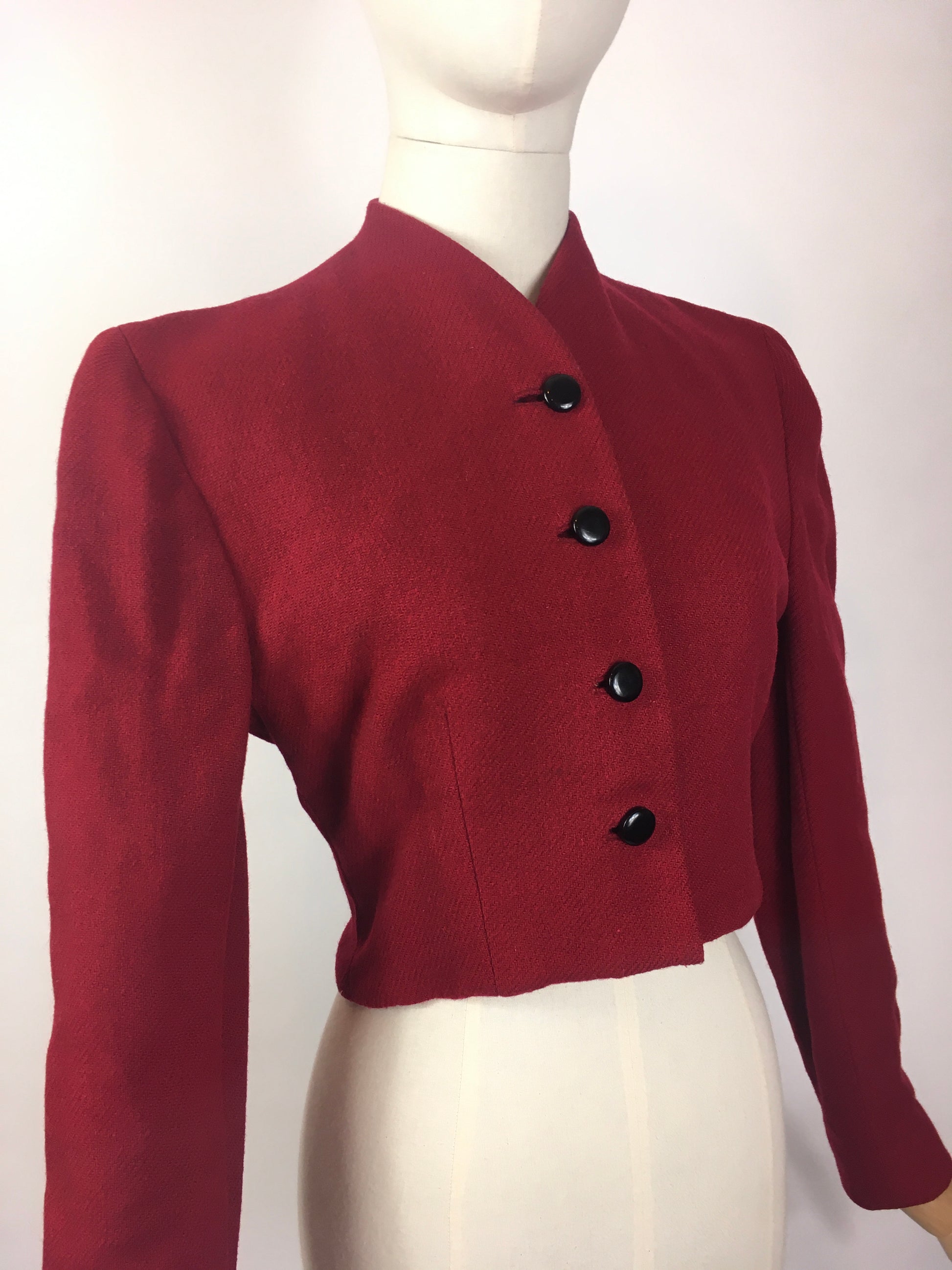 Vintage 1940’s American Cropped jacket in a lovely deep wine red wool. Made by ‘ Americana Shop, Richmond’ with a National Recovery Label. Such an iconic shaping this piece features strong shoulder pads, button front and features a shorter waistline with darts pulling it in. This will make such a statement over the top of dresses, over 40’s slacks or even mixing eras with a full pleated 50’s skirt for a Dior inspired look.