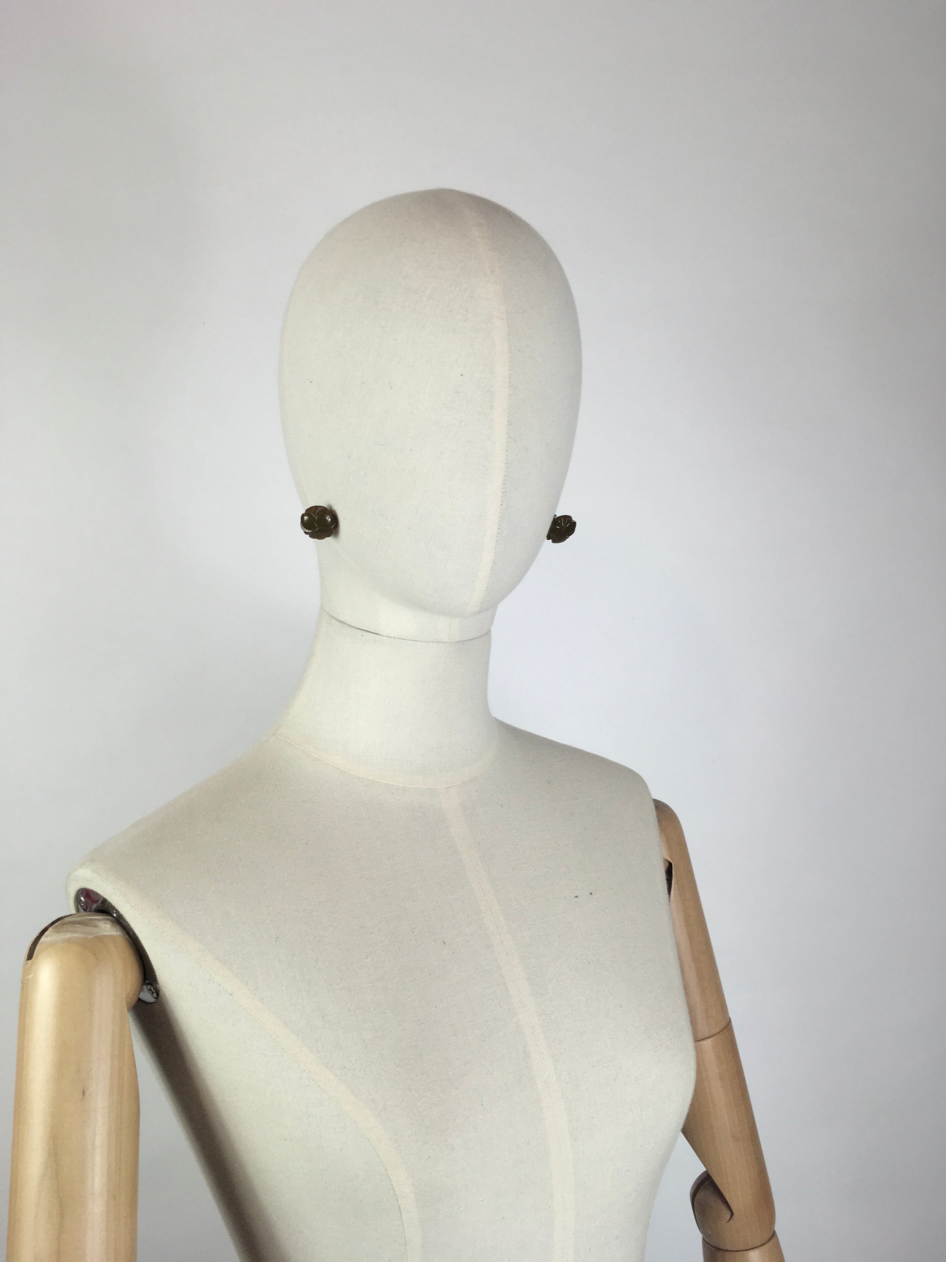 Vintage 1940’s Carved Bakelite screwback earrings in a lovely soft avocado green colourway. They have such an interesting shape and feature an almost clover petal design. In lovely condition.