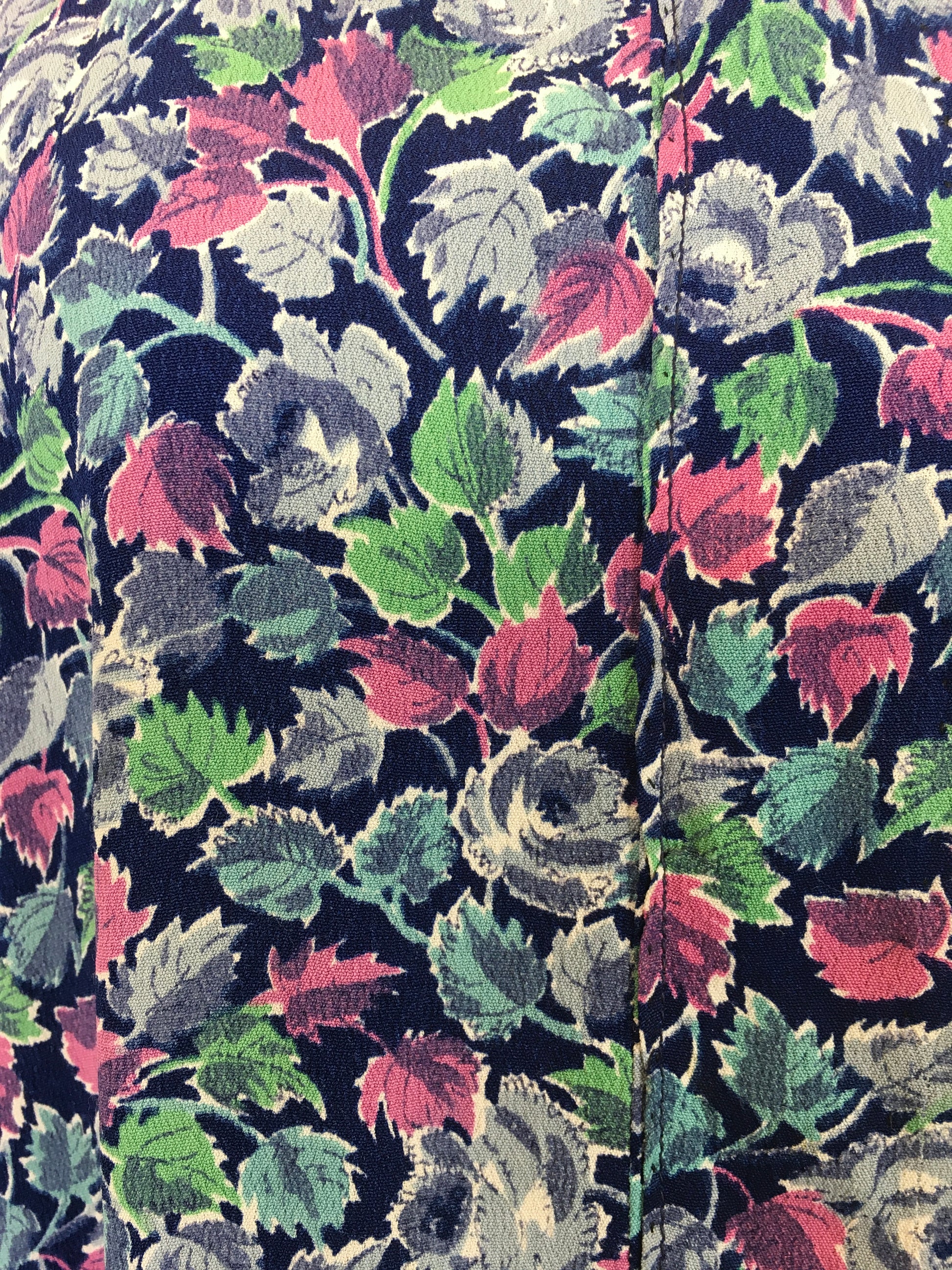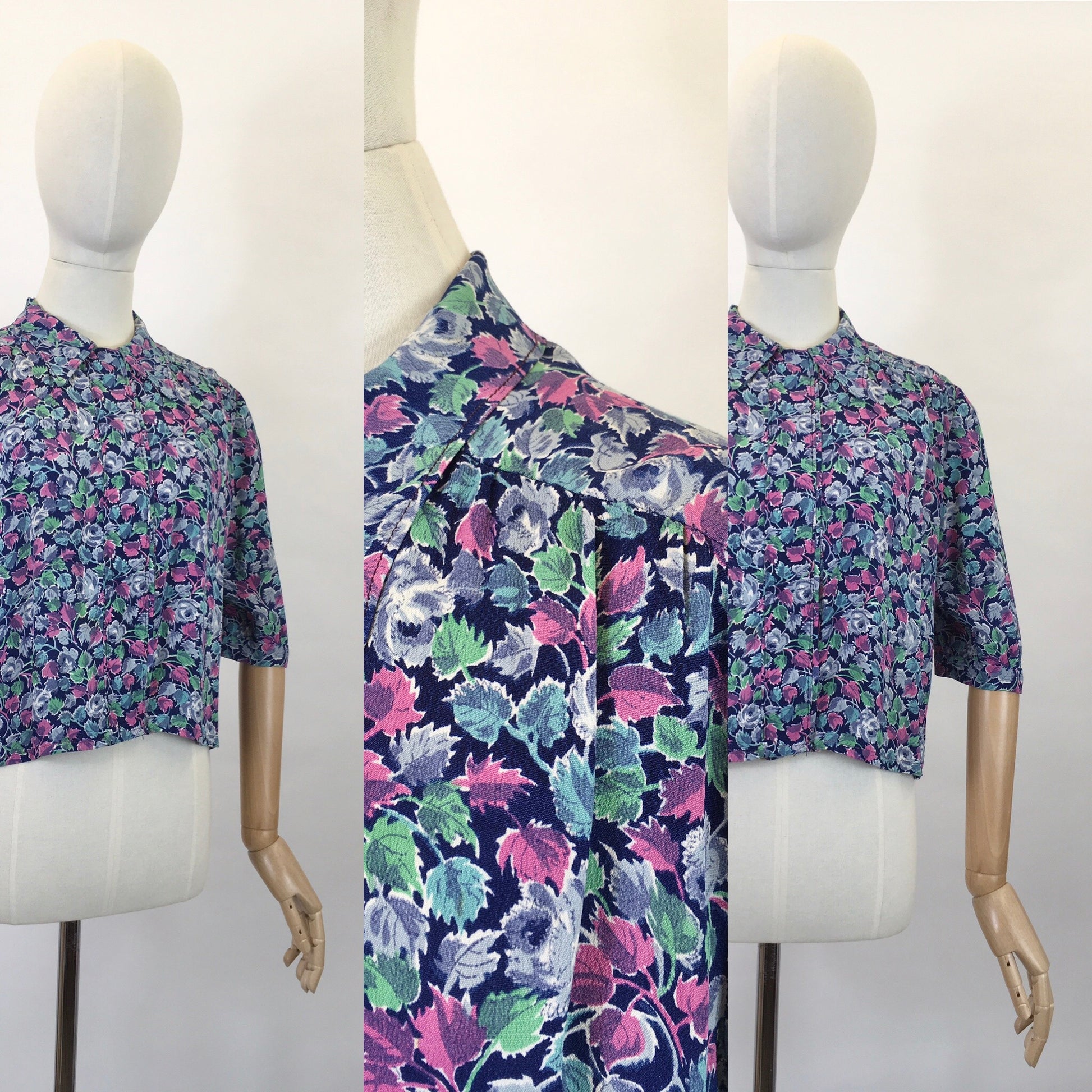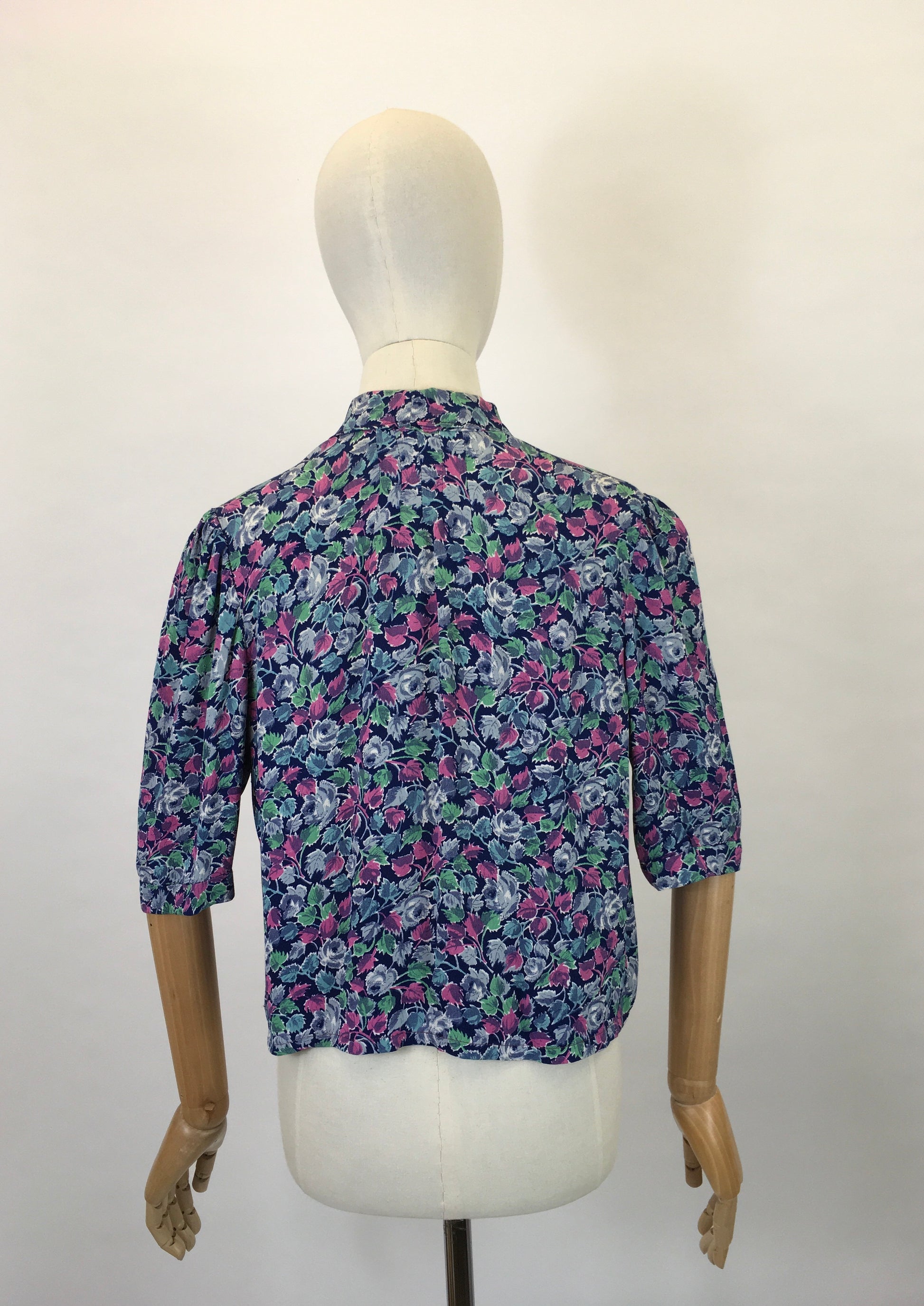 Vintage 1940’s beautiful crepe jacket / blouse in a lovely floral in rich purples, pinks, greens, greys and navy. Featuring a classic 40’s spear point sharp collar, a puff 3/4 sleeve this piece has 2 hooks and eyes as fastenings currently which is great as a lightweight jacket but could have further fastenings or button holes and buttons adding to make it a blouse.