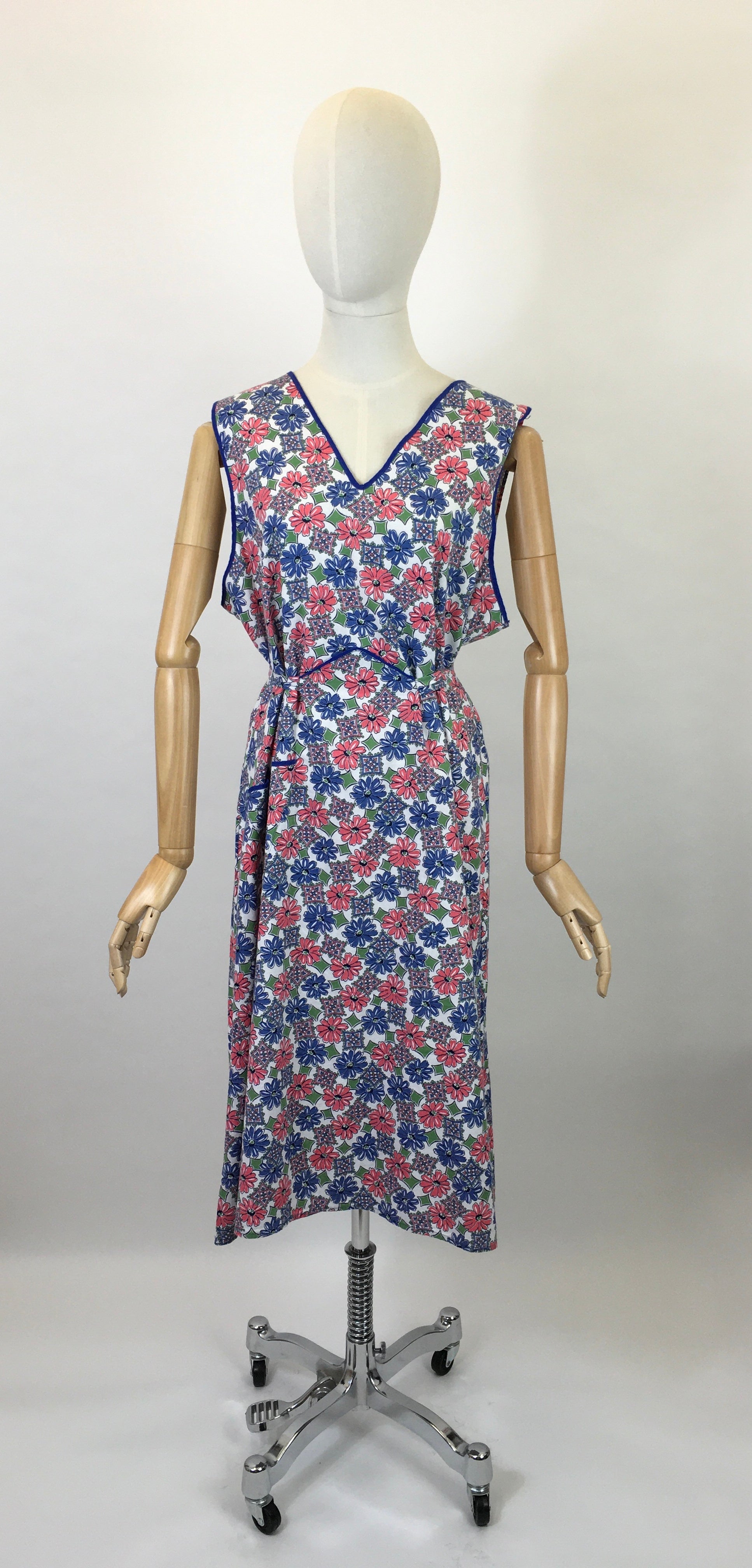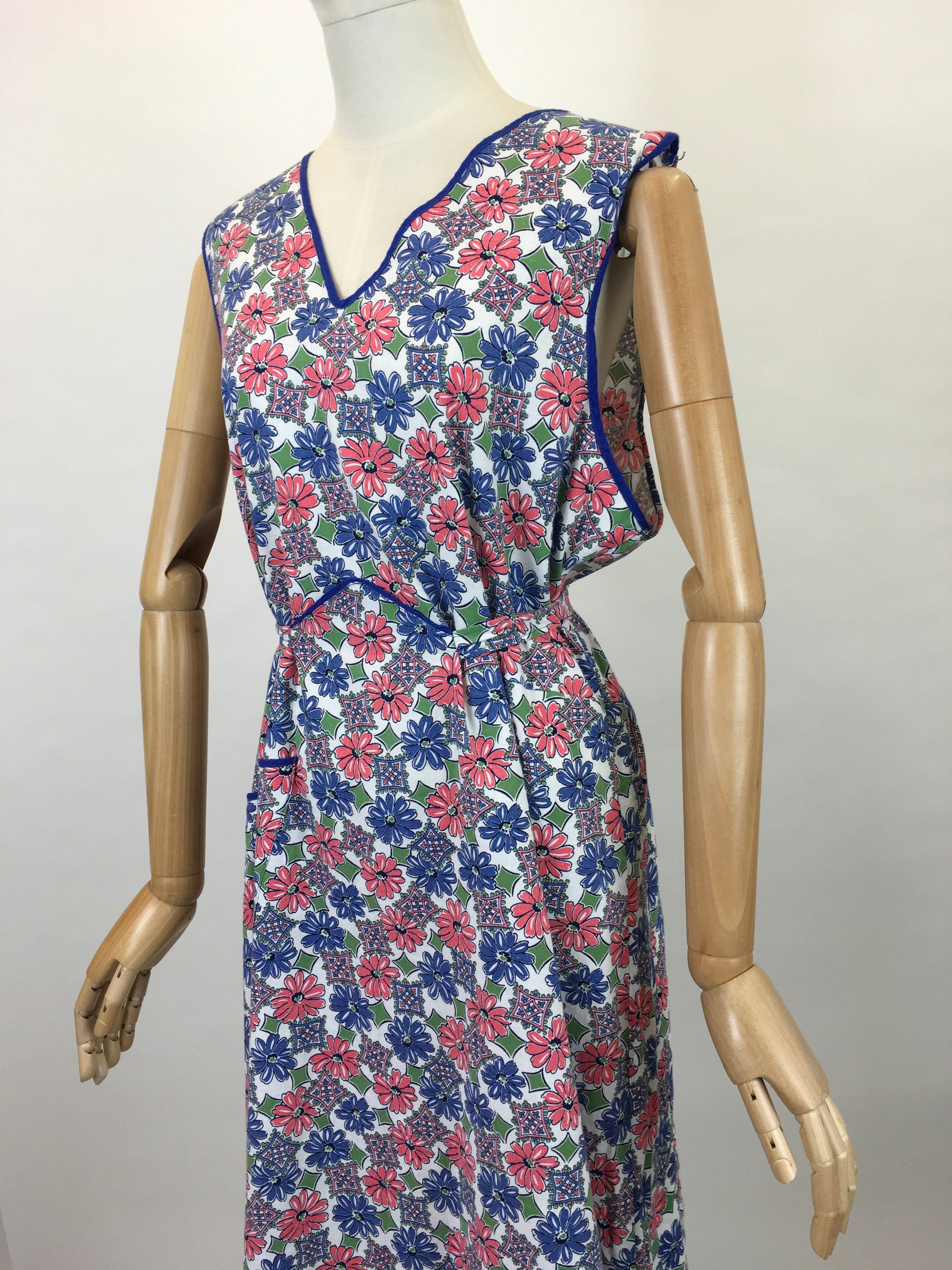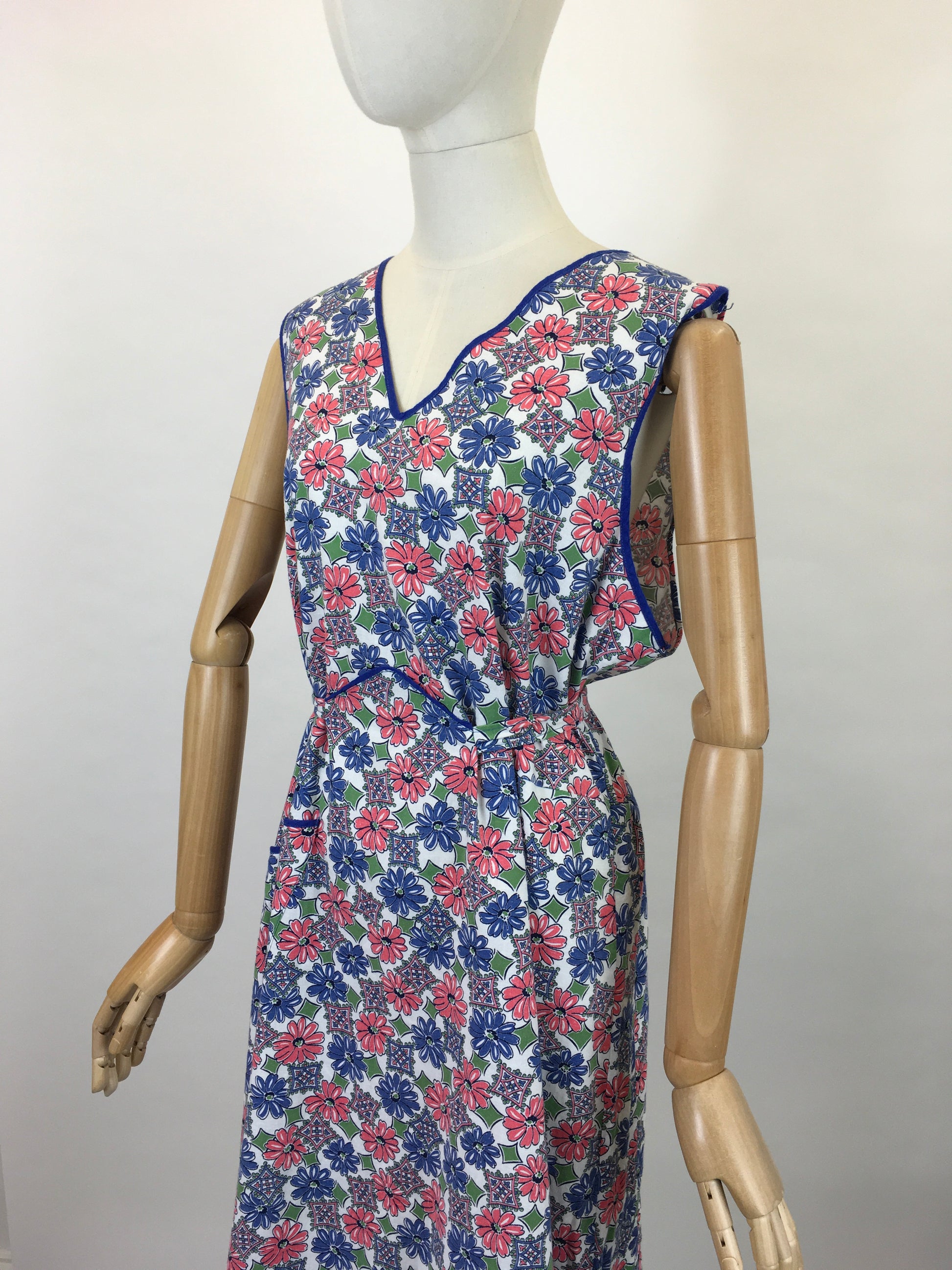 Vintage 1940’s Beautiful Full pinny in a lovely floral cotton in blues, soft pinks and greens. Trimmed in a blue piping, with handy pocket and self tie fastening to the back. A great piece or as a treat for yourself or friend. Lovely for a vintage baker or crafter.