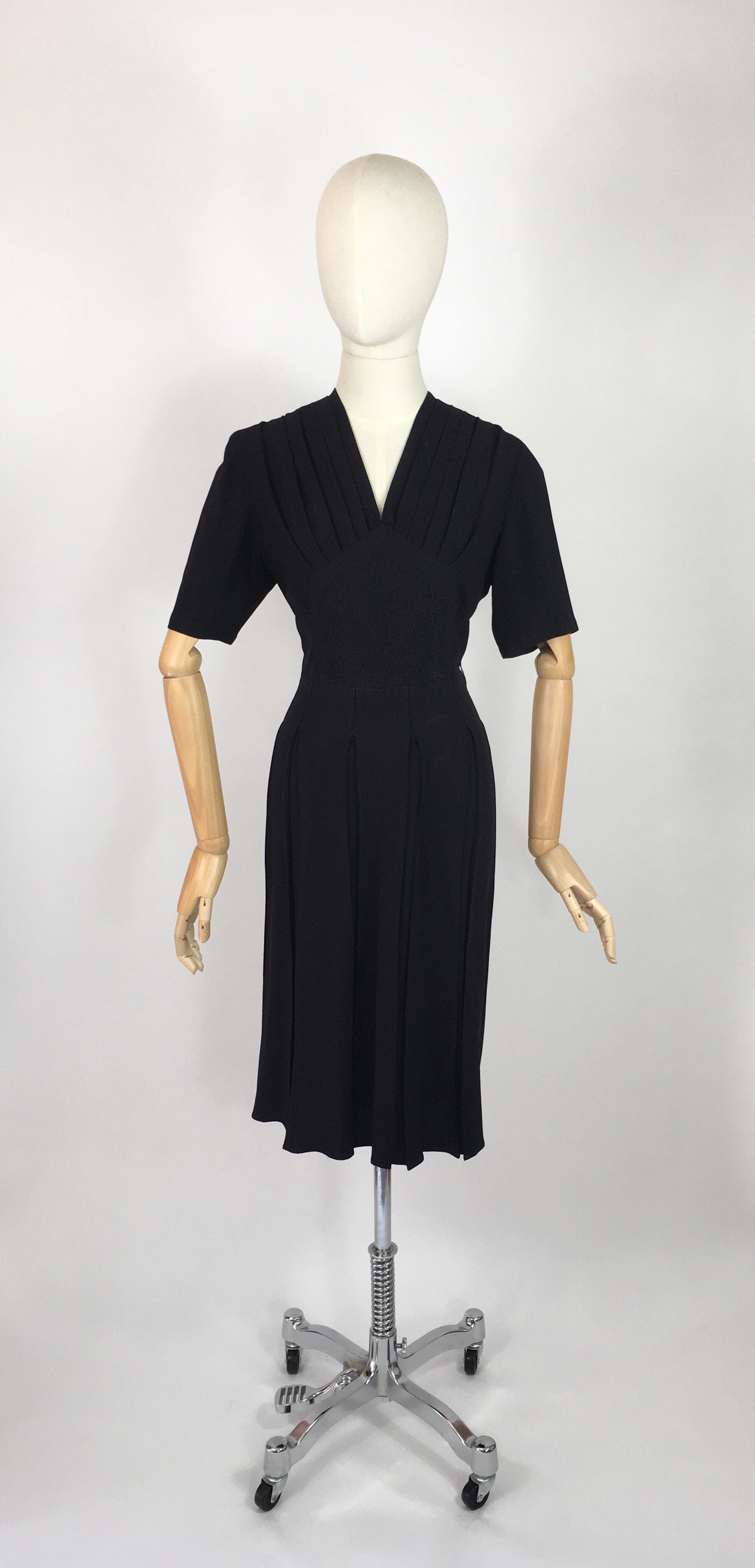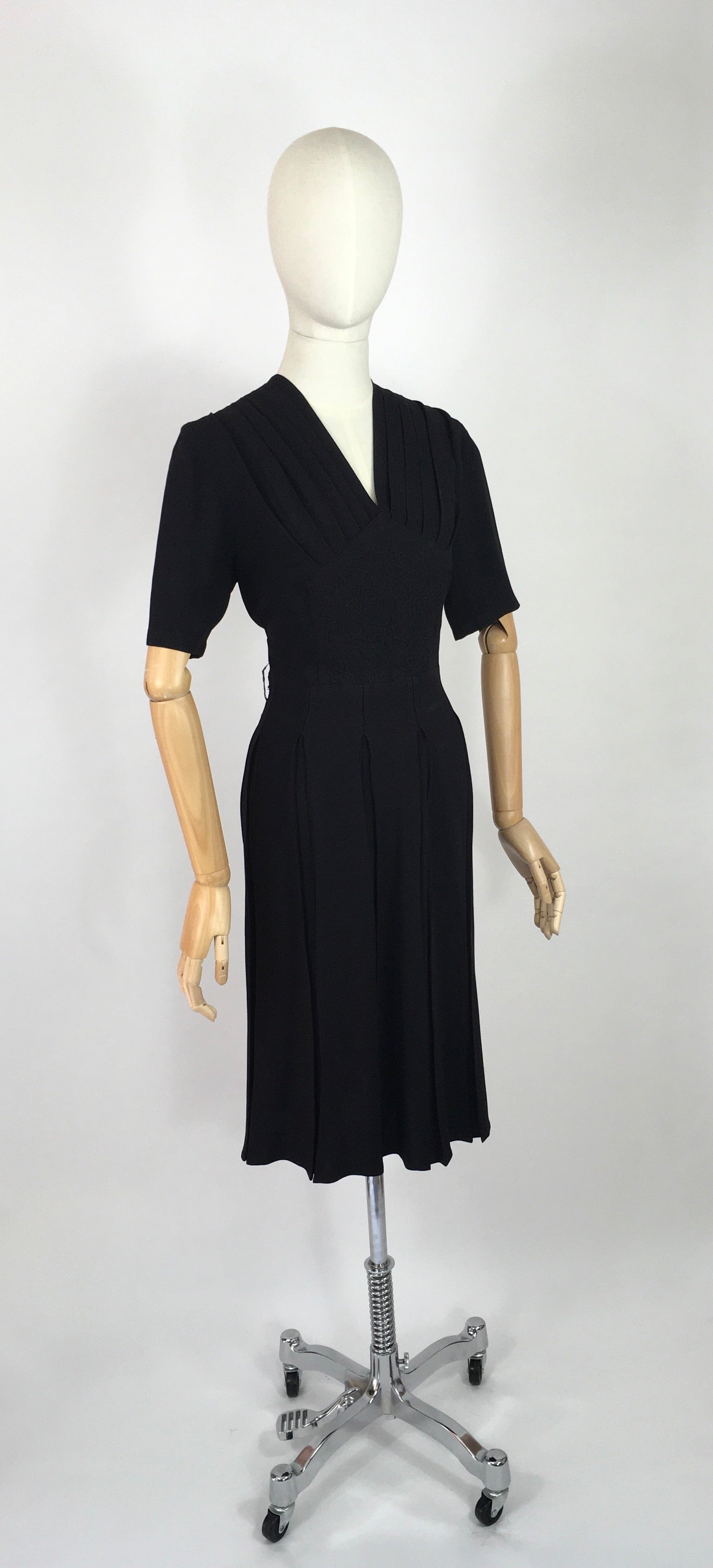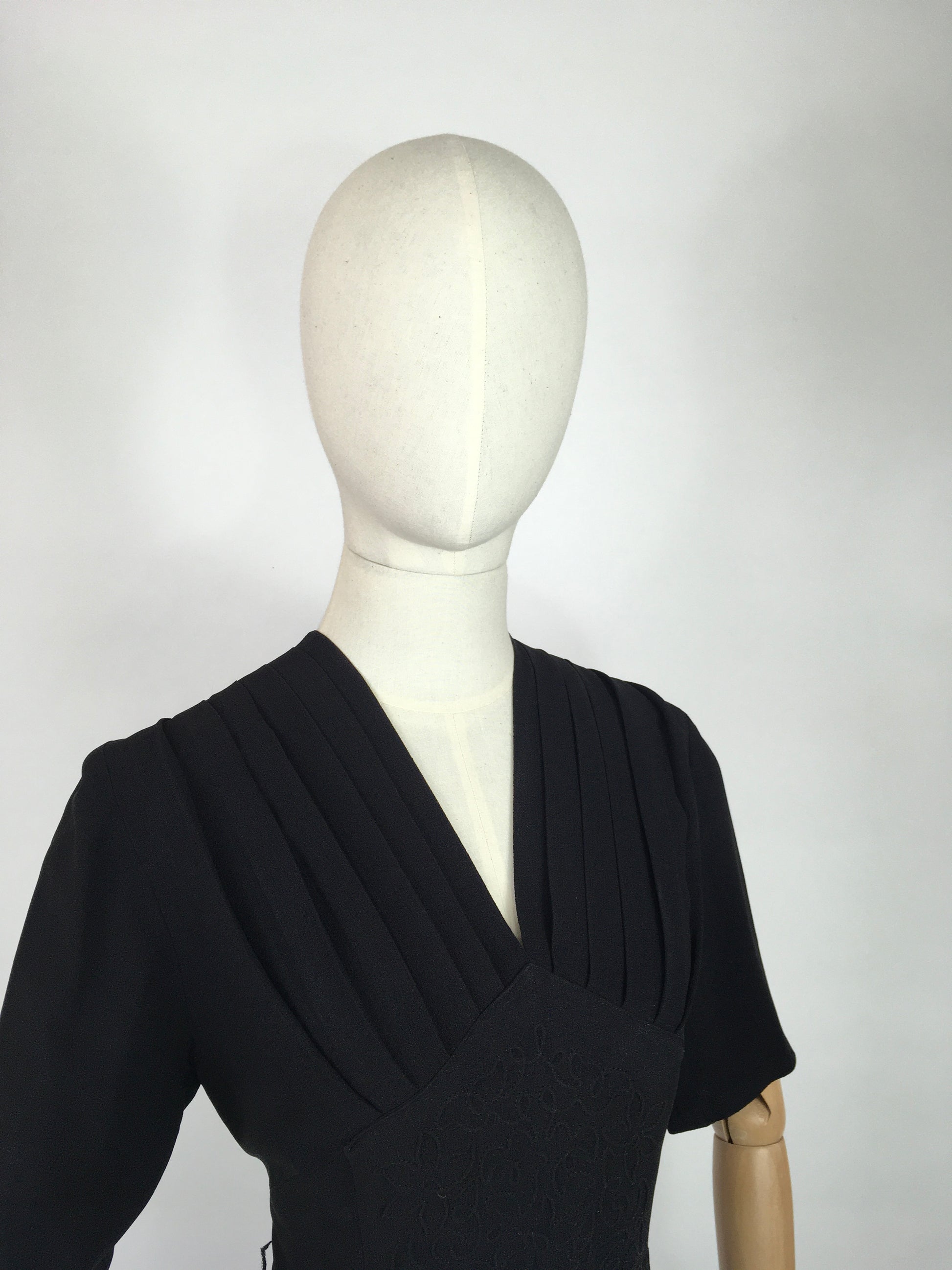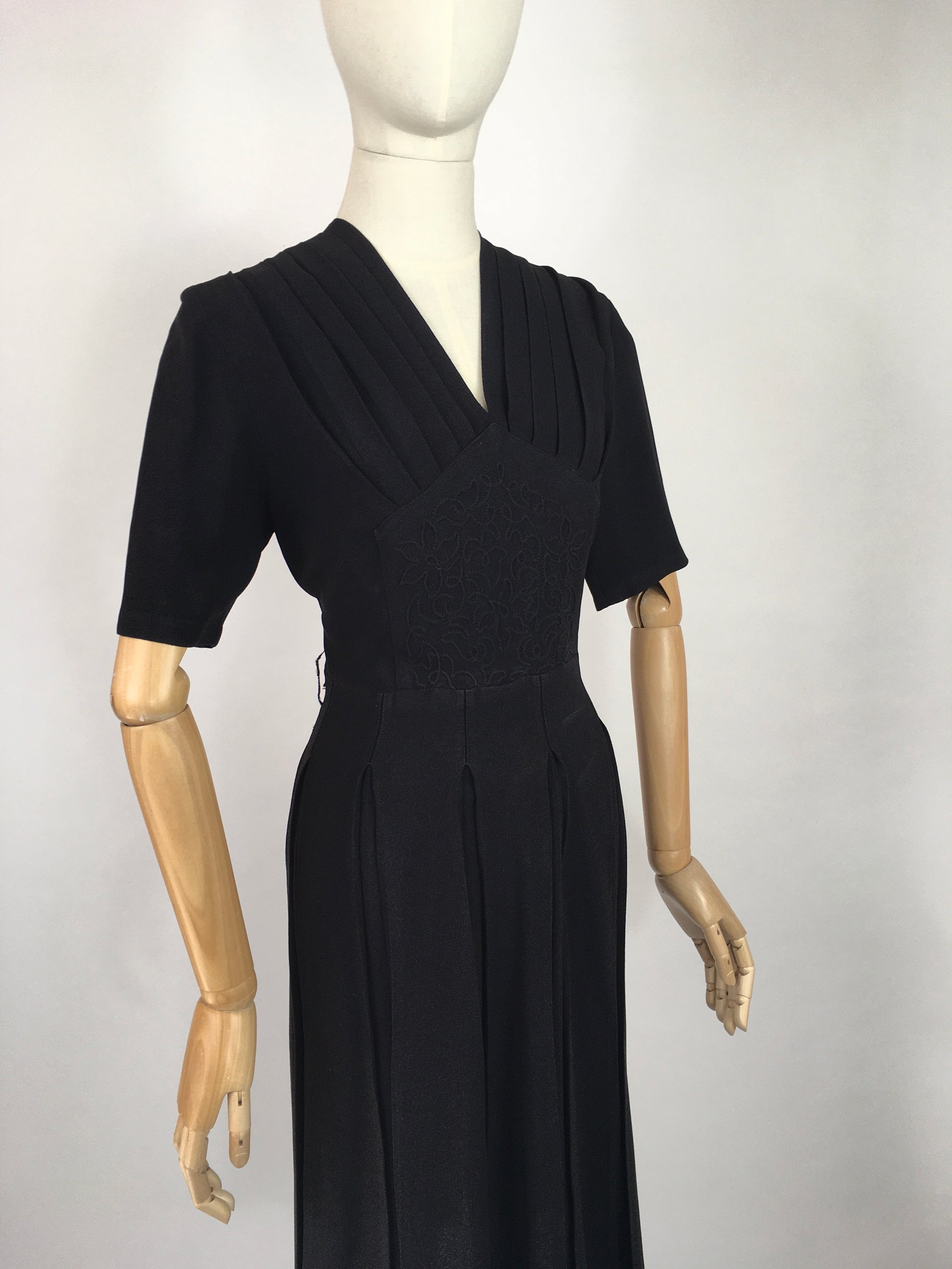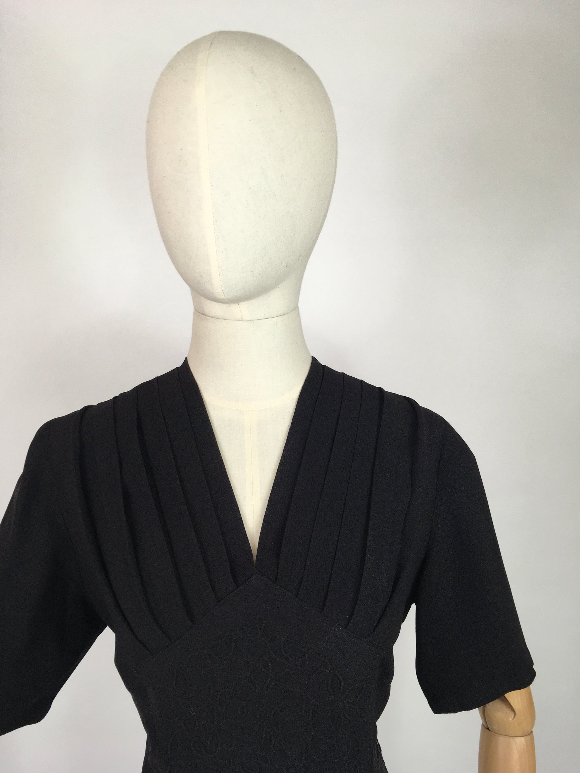 Vintage 1940’s Black crepe dress in a lovely 40’s silhouette featuring v neckline with pleated bodice detailing, Soutache embroidered waist panel and pleated skirt. The piece fastens with a metal side zip and a metal zip to the nape.