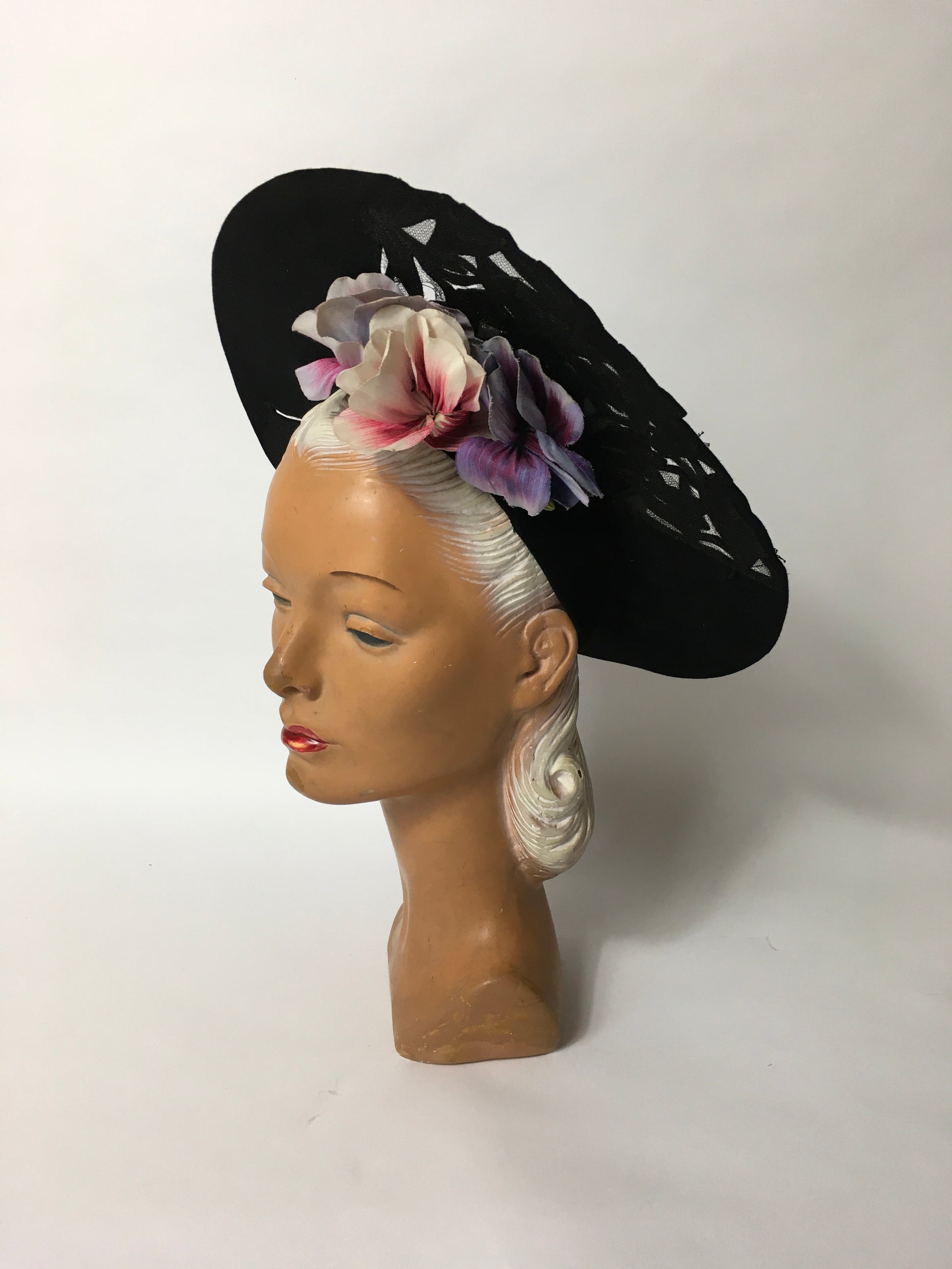 Vintage 1940’s black halo hat with the most beautiful wide brim detailing with cutwork and veiling. Flowers sit to one side of the hat in lovely blues, pinks and ivories.