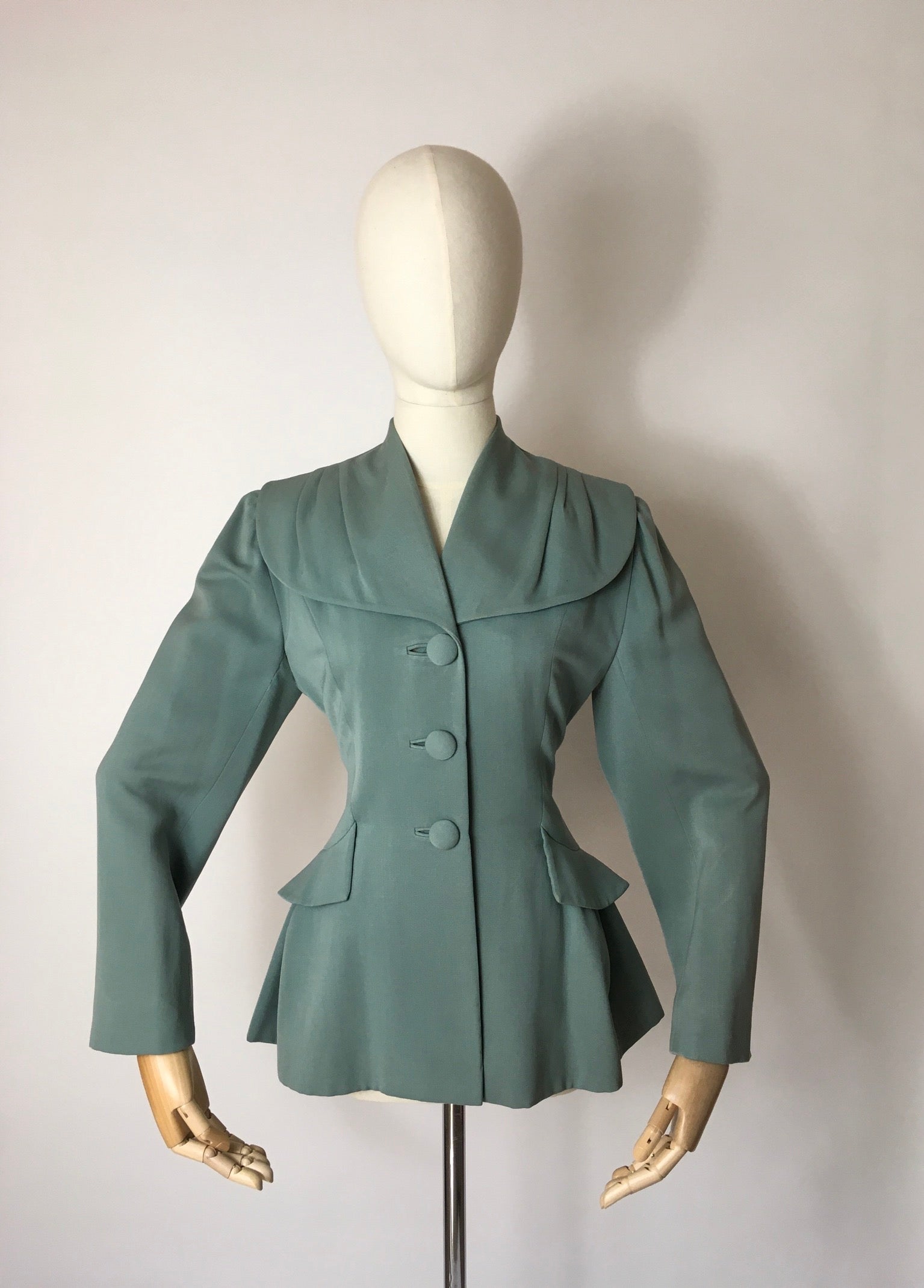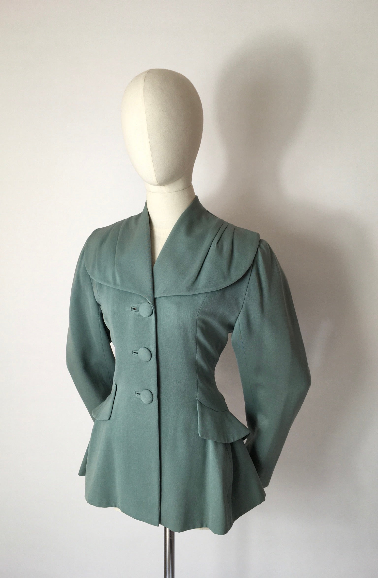 Vintage 1940’s Black Label ‘ Lilli Ann’ in the most exquisite soft duck egg blue colouring. Featuring a petal shaped collar, button down front, full length sleeve, nipped in waist and faux peplum pockets. This jacket really has it all, simple but so elegantly stylish. Great worn over a dress or a blouse and slacks combination.