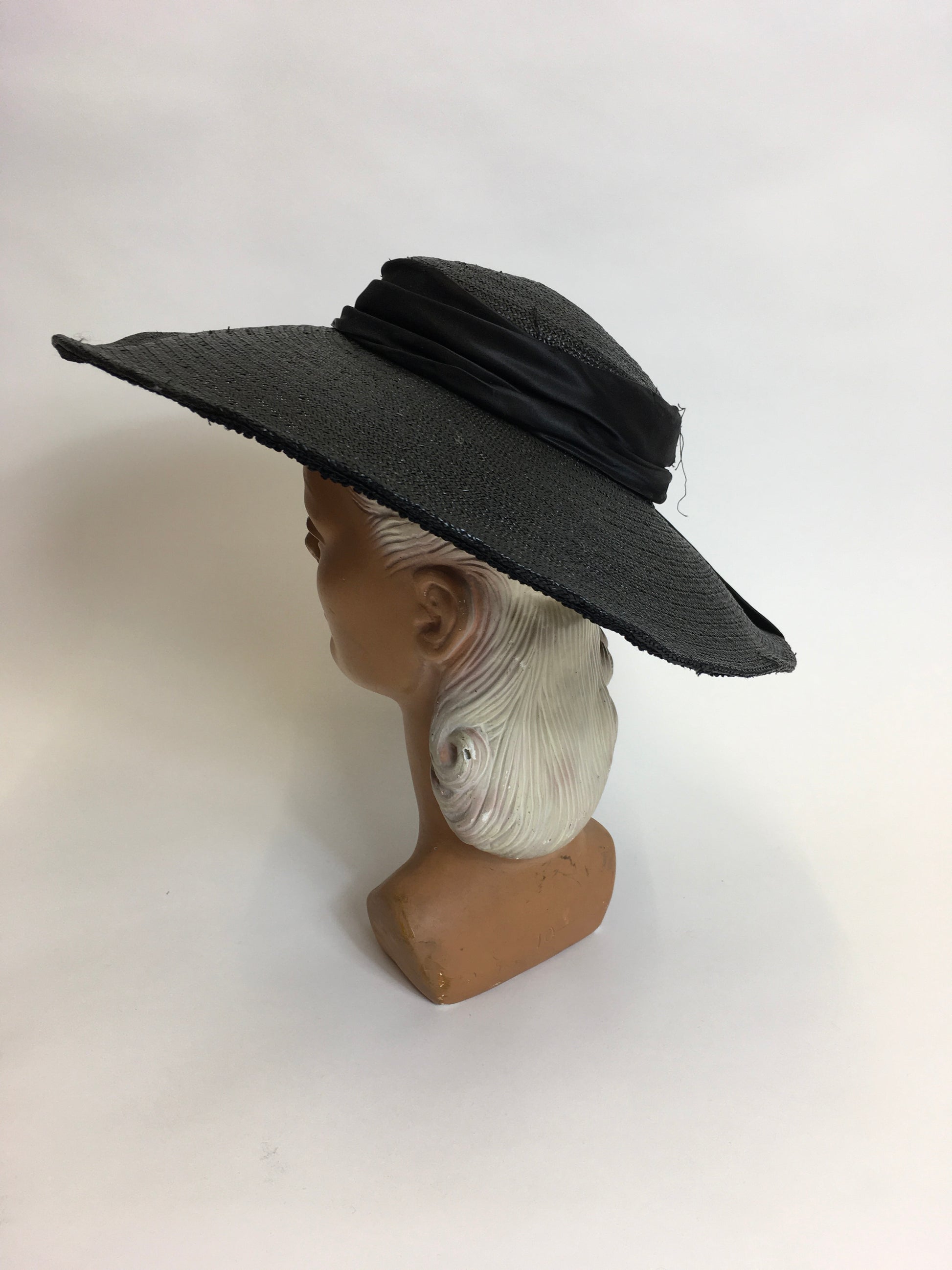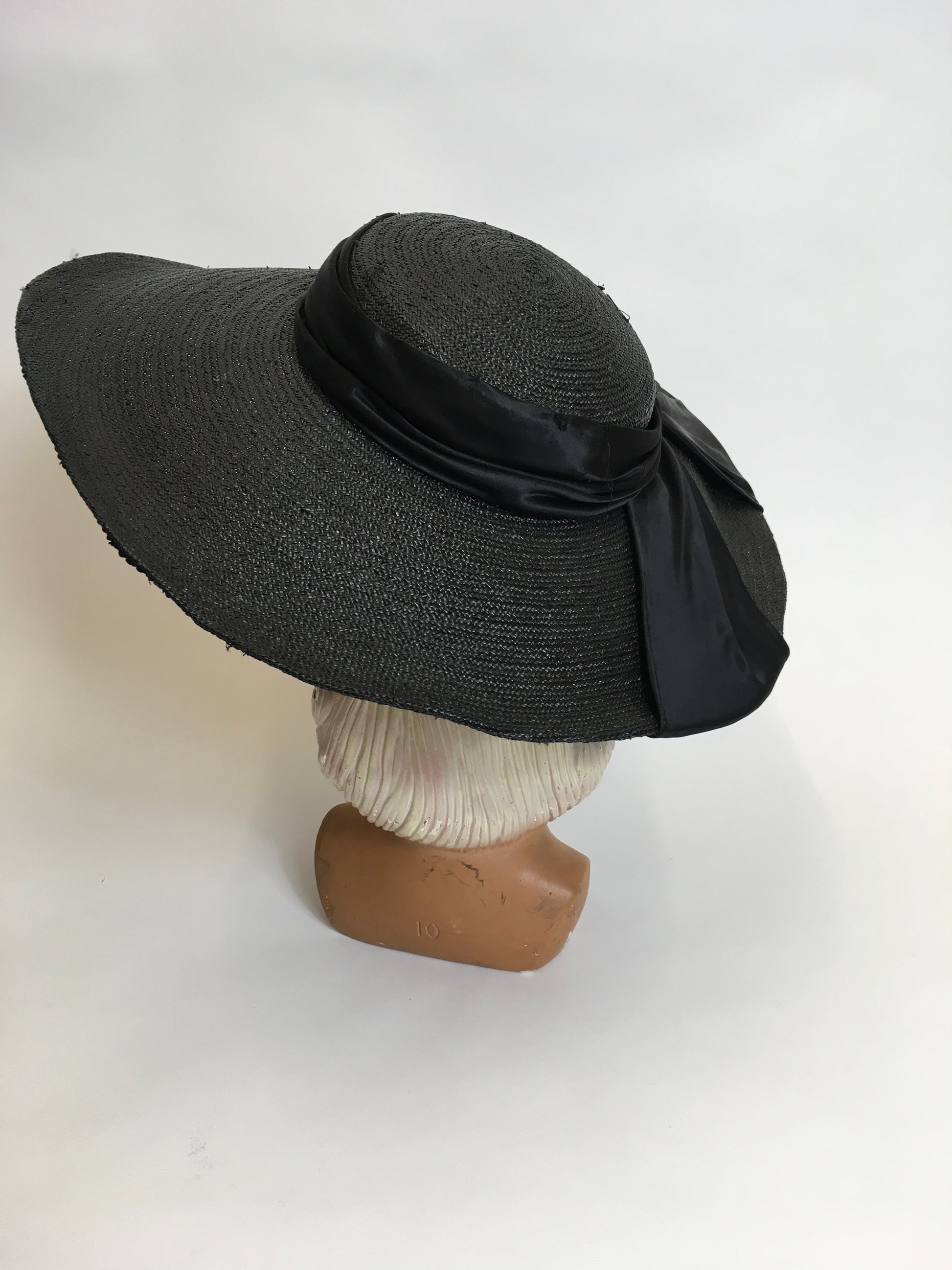 Vintage 1940's black saucer hat with a lovely black satin bow detailing. Very Dior, this iconic hat shape is great work to the back of the head and styled as a halo hat or worn tilted to one side to shape the face.