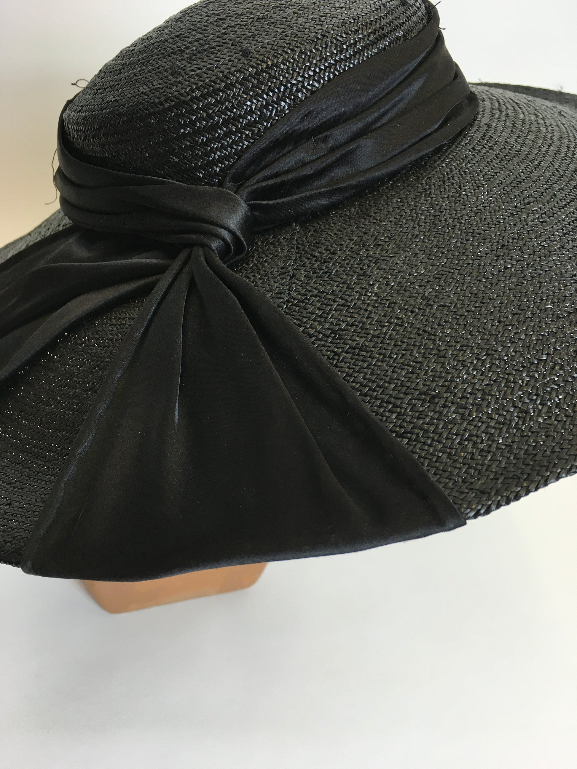 Original 1940’s Black Saucer Hat - ‘ Made In France ‘ With Black Satin Bow Ribboning