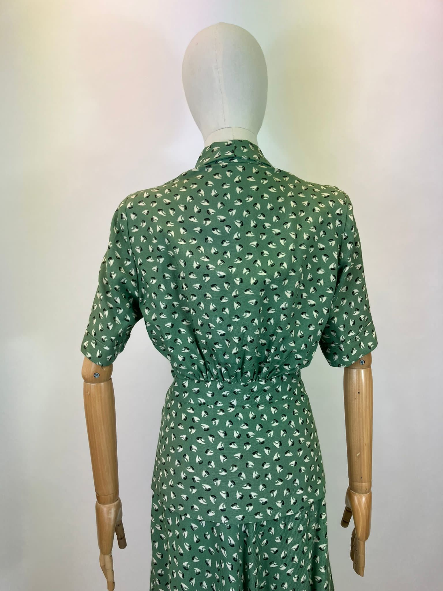 Vintage 1940’s CC41 Novelty Moygashel Linen Suit with White and Black sail boats on a sea bed of green.