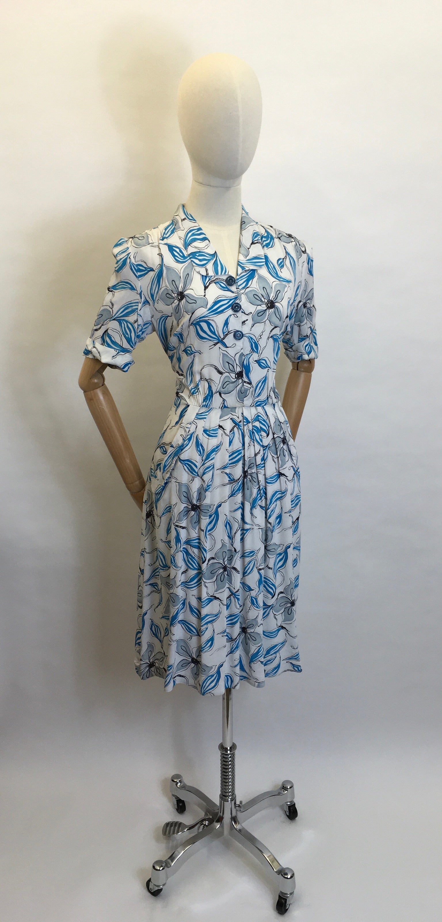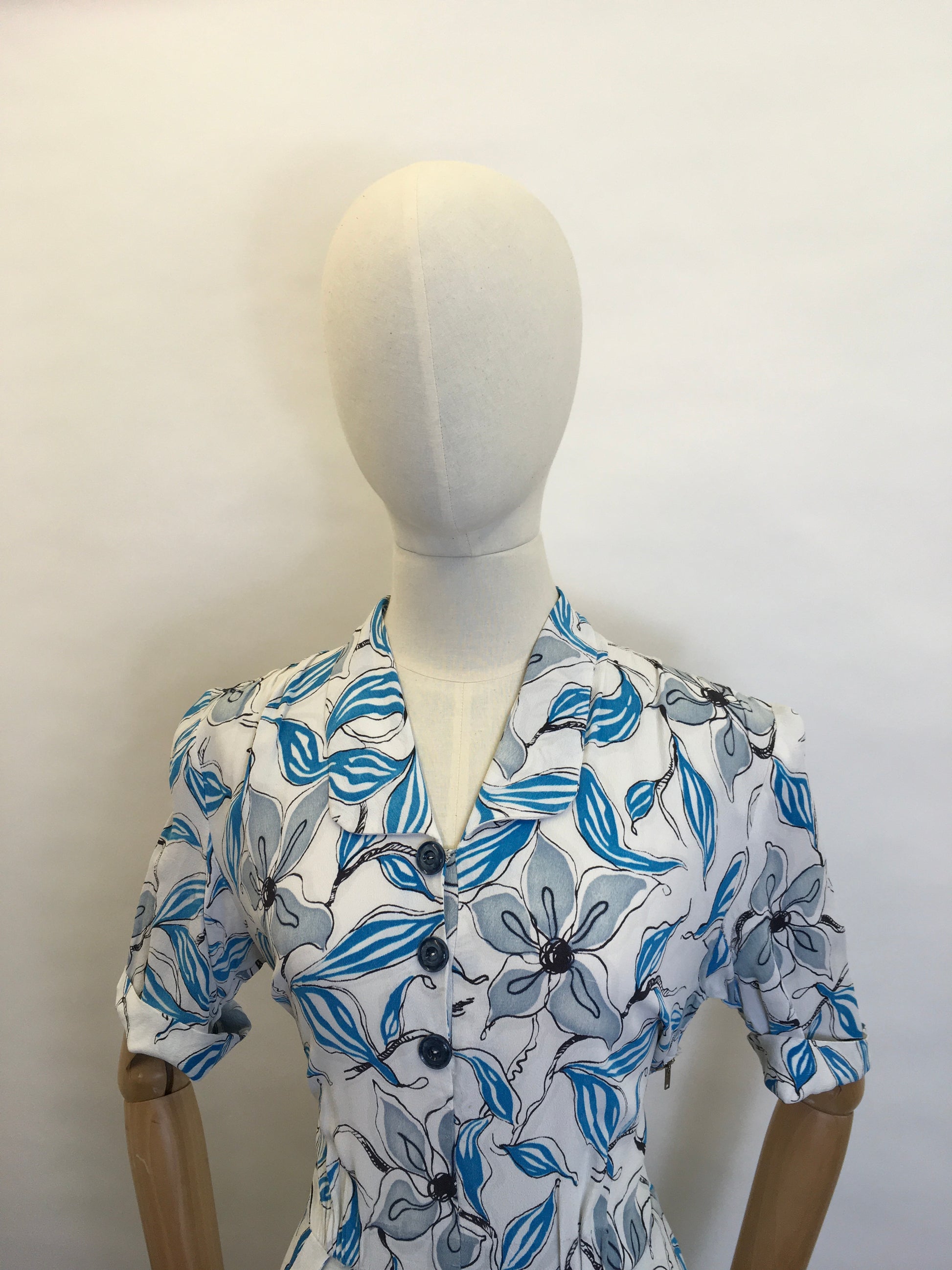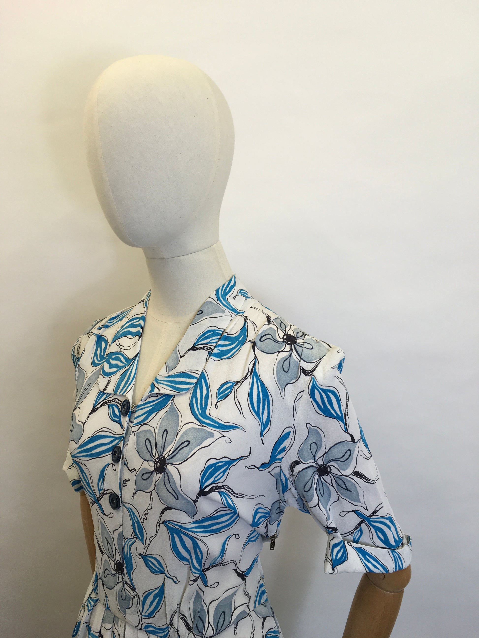 Vintage 1940s day dress made from a beautiful crepe with an almost stencil like floral in a lovely shade of blue, slate grey and outlined in black. Featuring a classic button front with a couple of press studs, turnback short sleeve, small shaped collar, cinched in waist, slightly pleated skirt and 2 pockets. Fastens with a metal side zip so best suited slightly smaller than max measurements for ease of getting on and off.