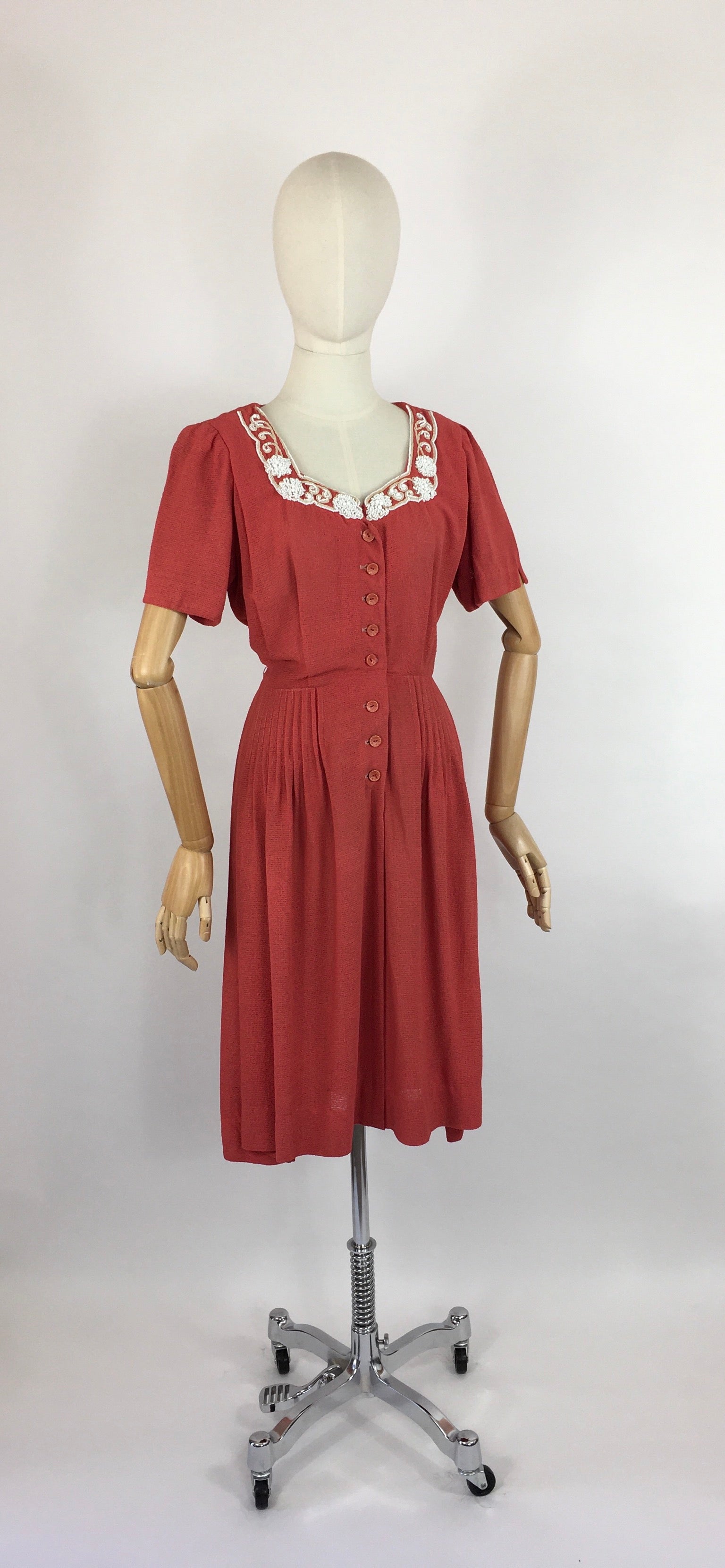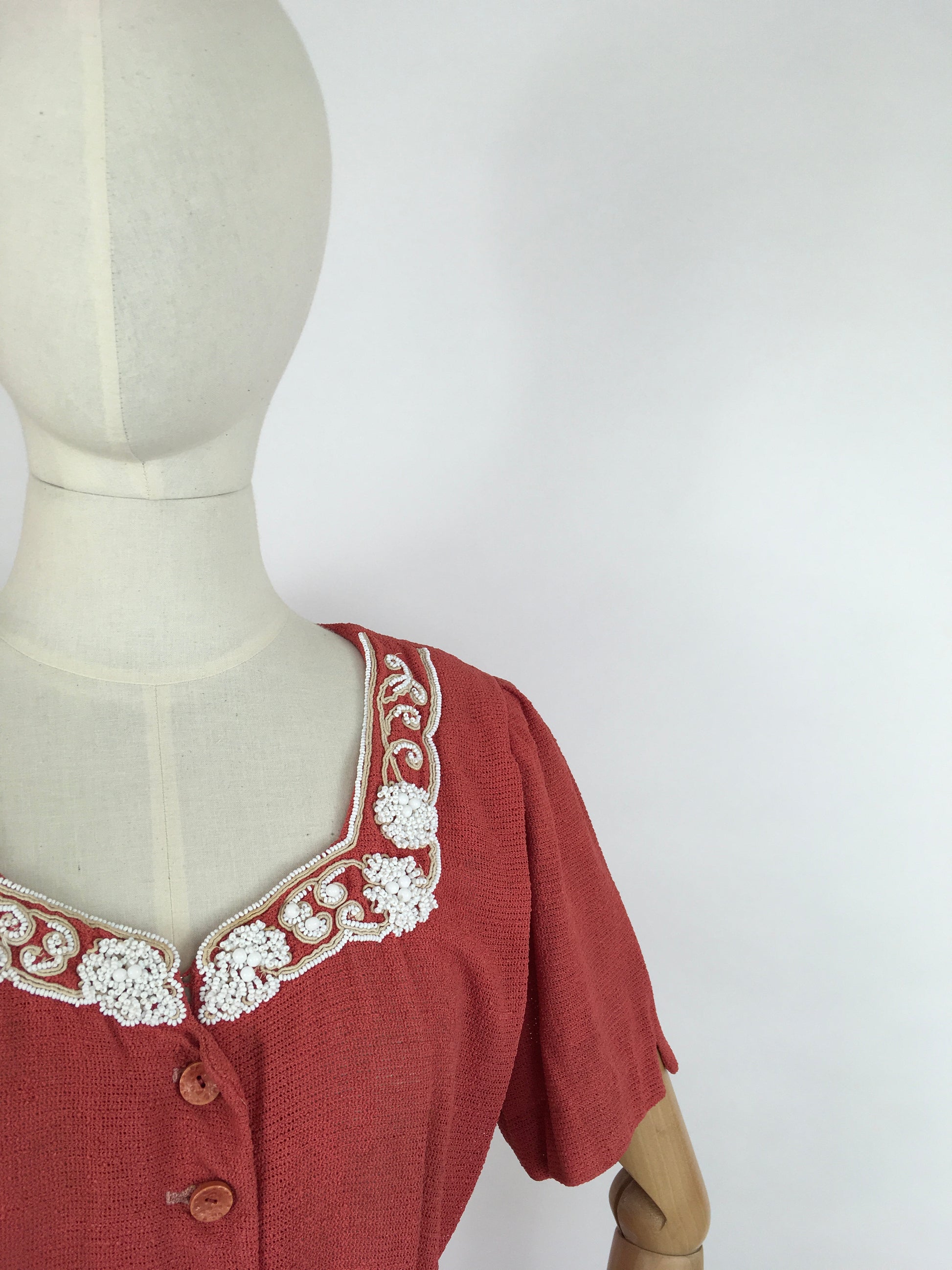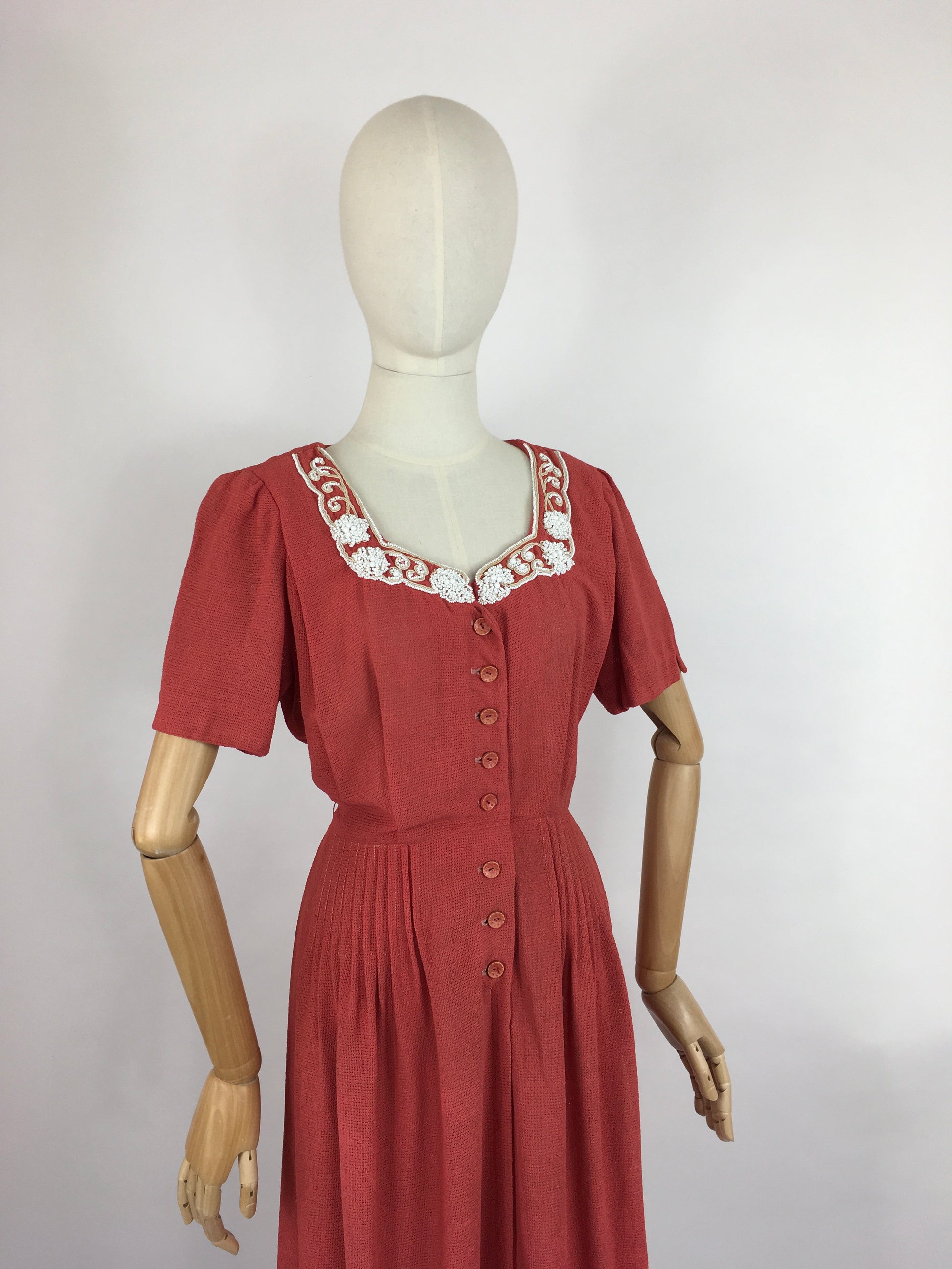 Original 1940’s Dress By ‘ Travelcraft by Sportscraft’ - In a Beautiful Deep Coral with White Floral Beadwork