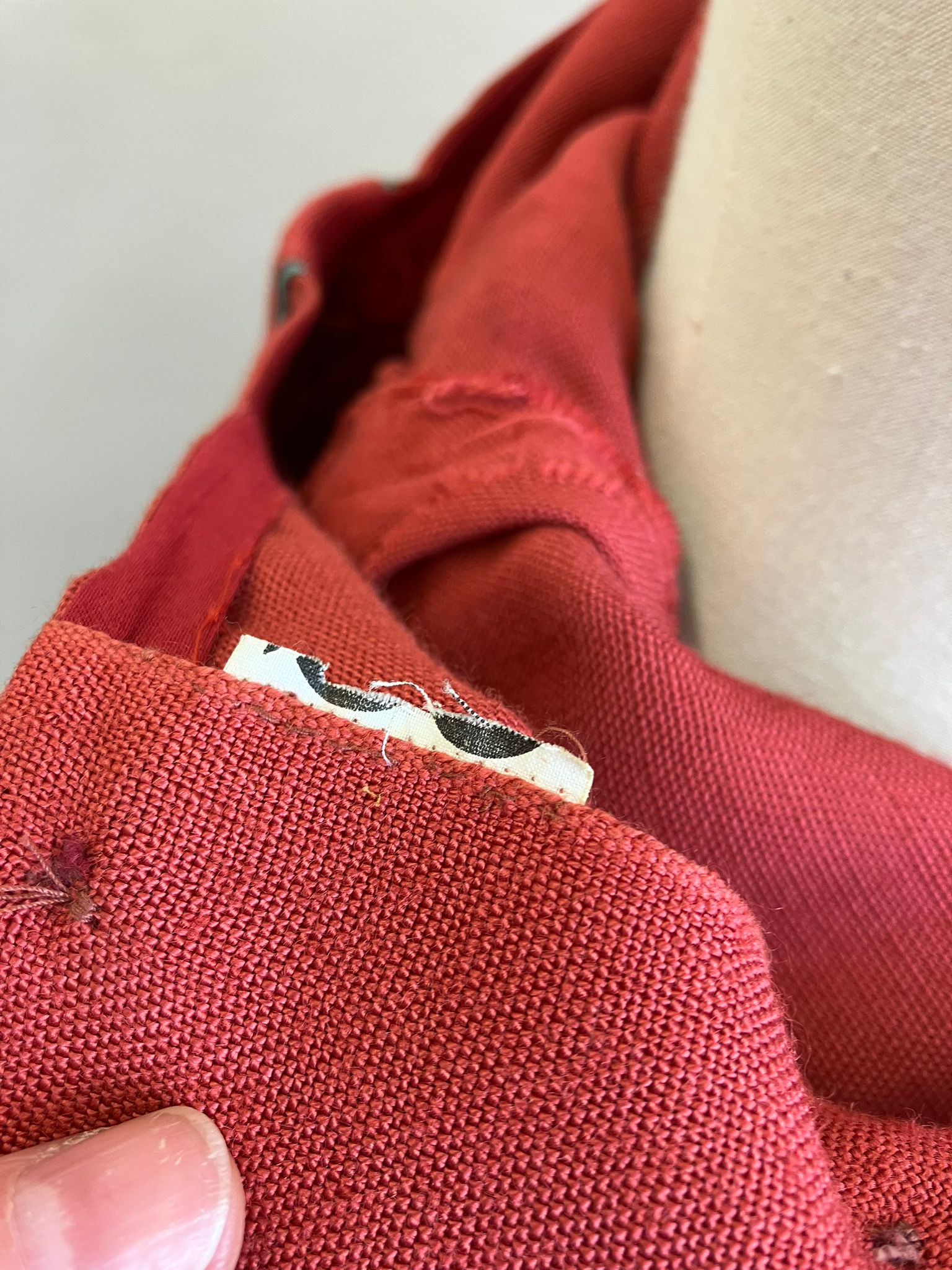 An amazing Moygashel in Rust ( red tone) with a lovely green contrast edged scalloped front faux button opening detail. Similar contrast detail to the shoulders and beautifully placed pockets lined with the same accent colour Moygashel linen. A dropped waist accentuated with the original belt falling down to the panelled skirt. Back button opening to waist and side popper opening too.