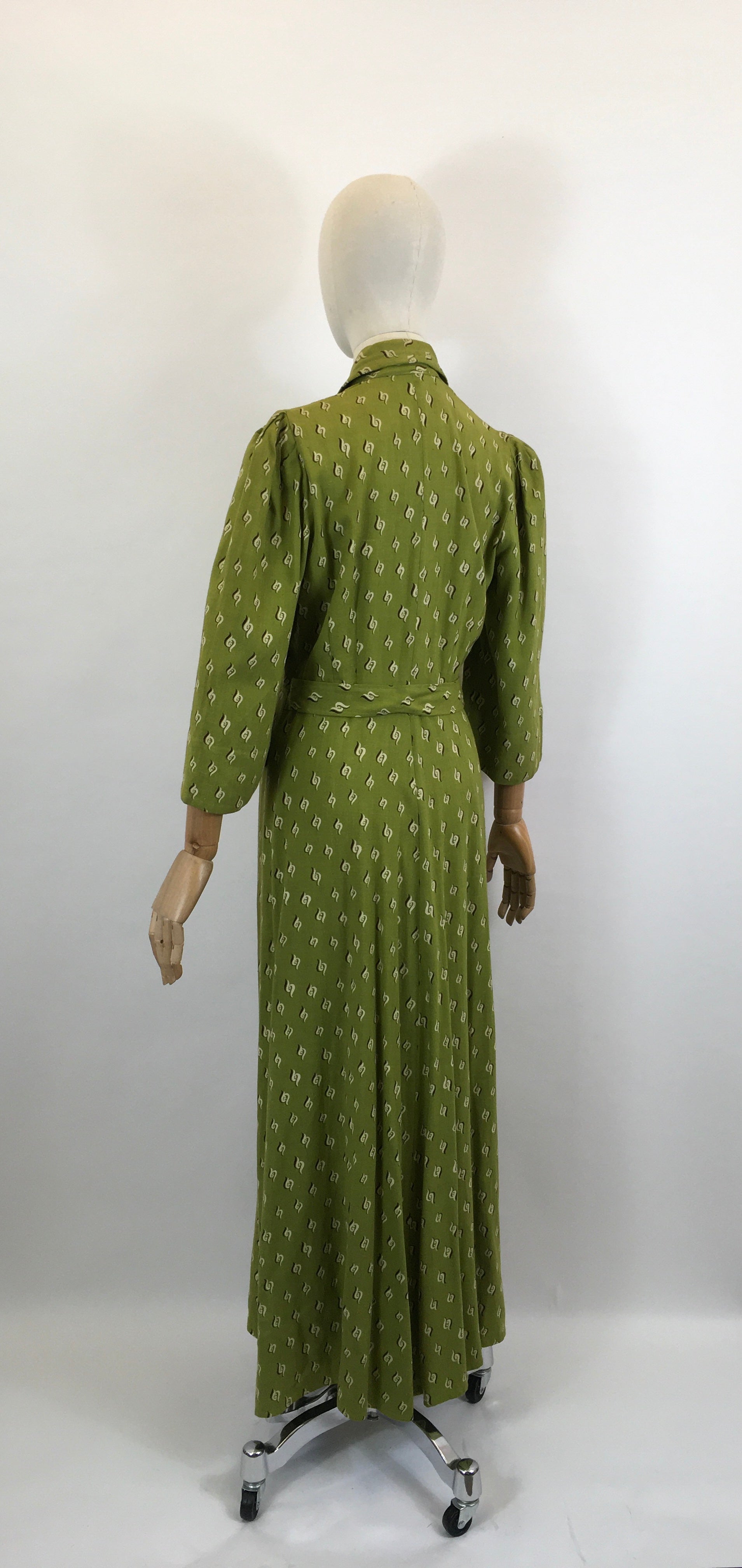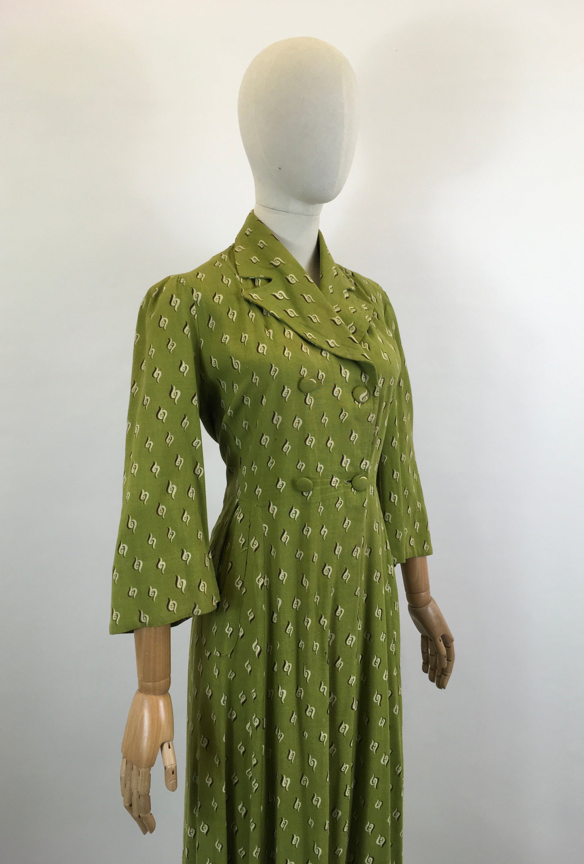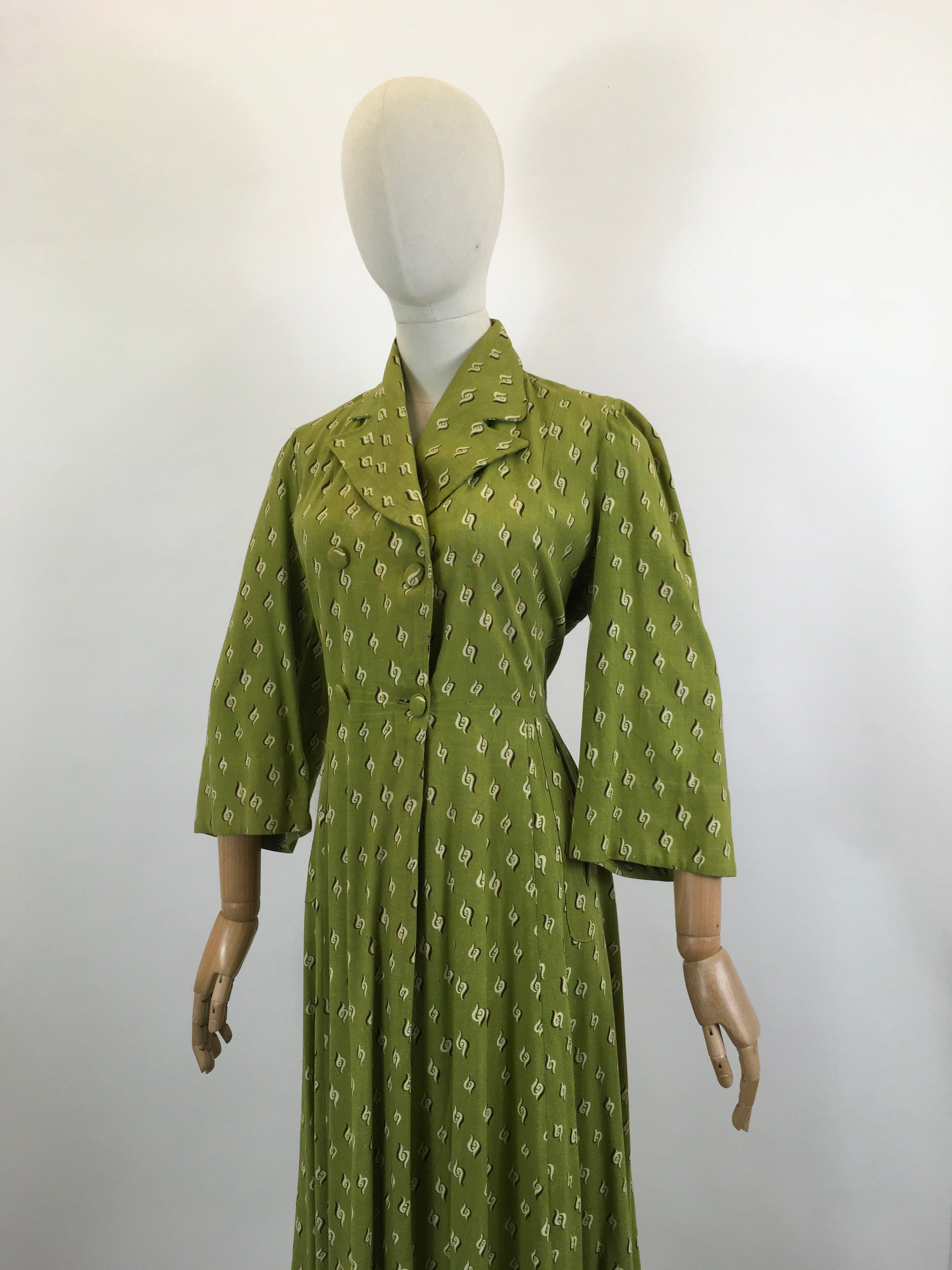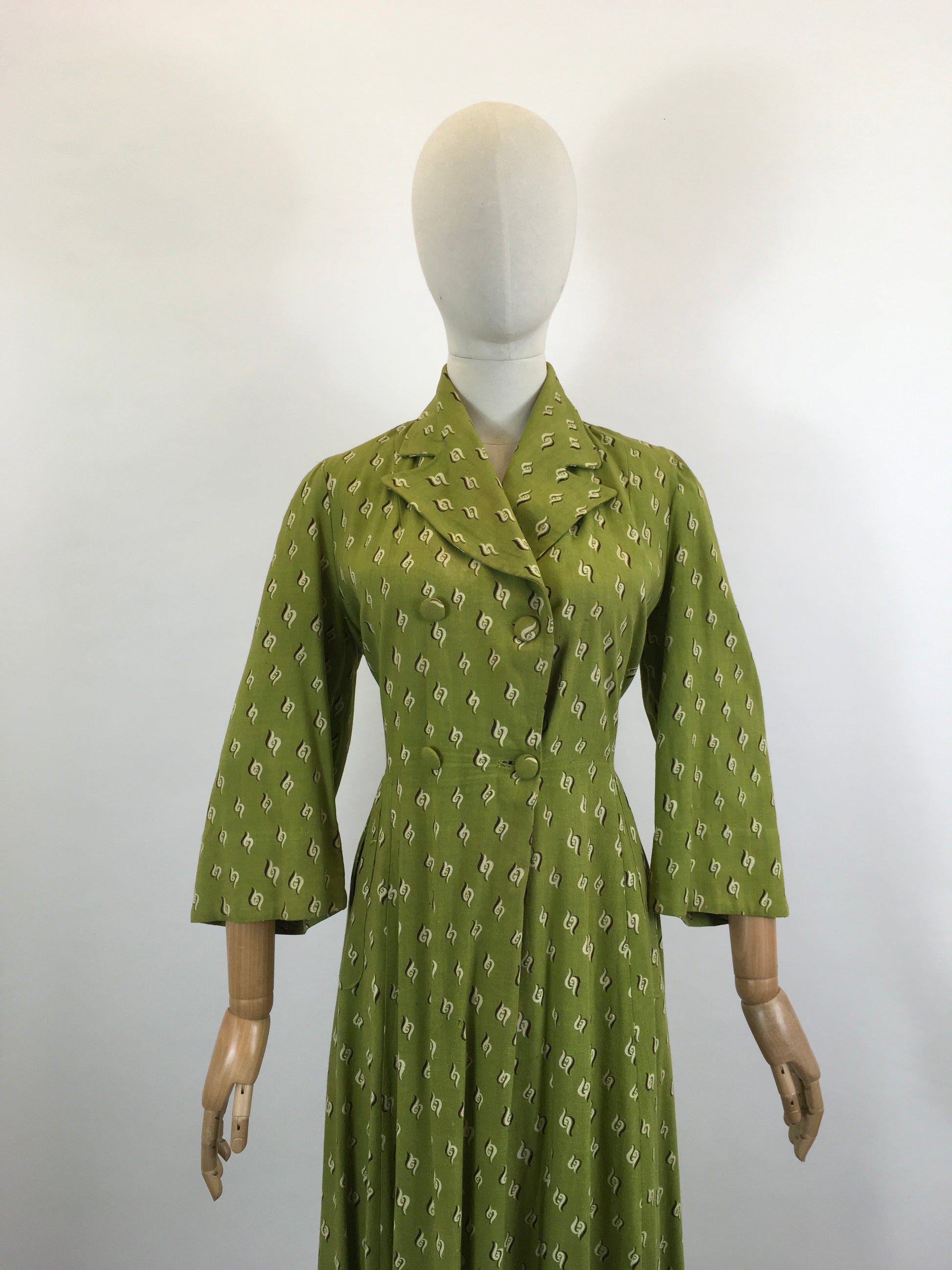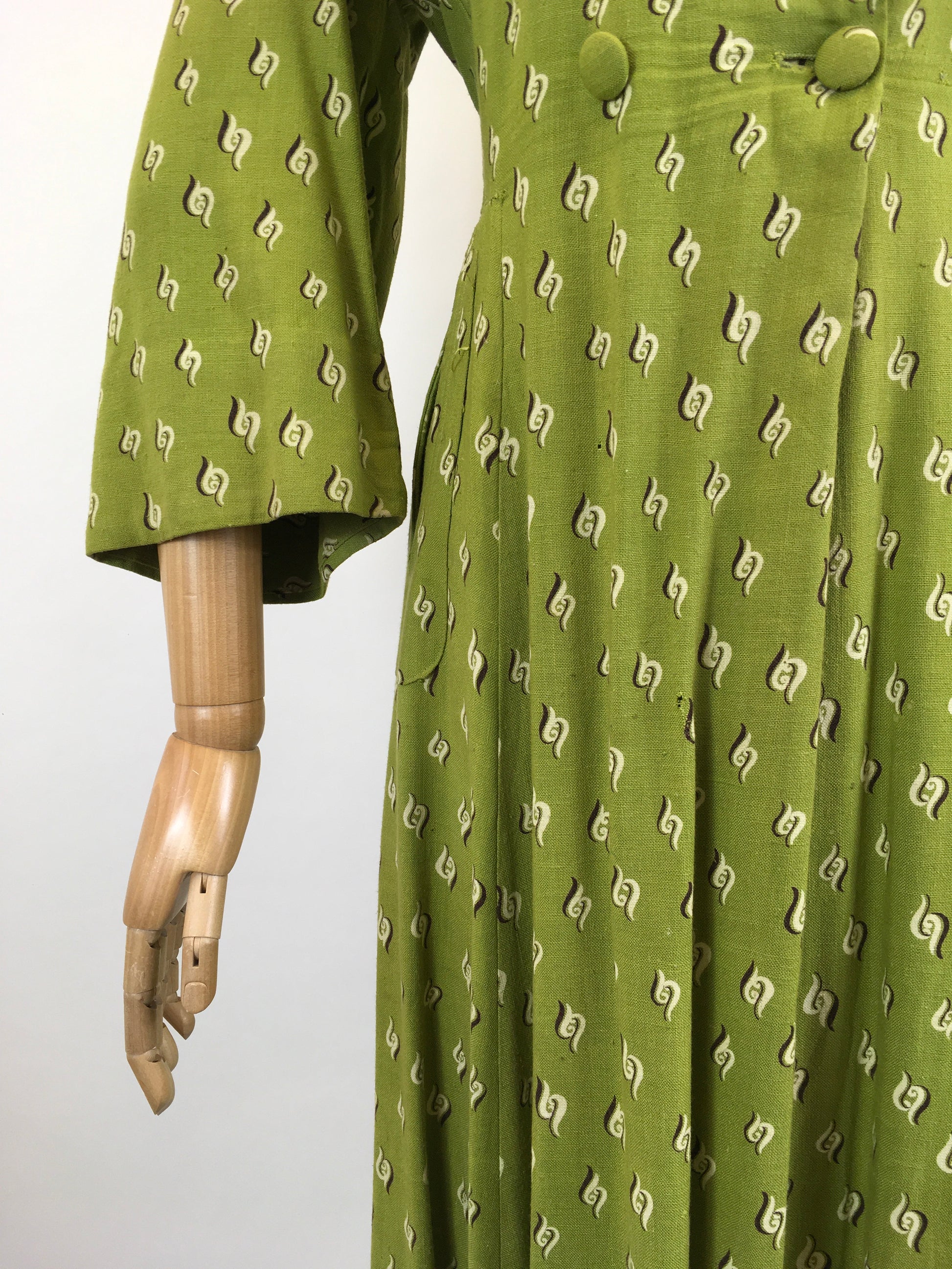 Original 1940’s Fabulous Moygashel Linen Dress/ housecoat - soft green , brown and cream