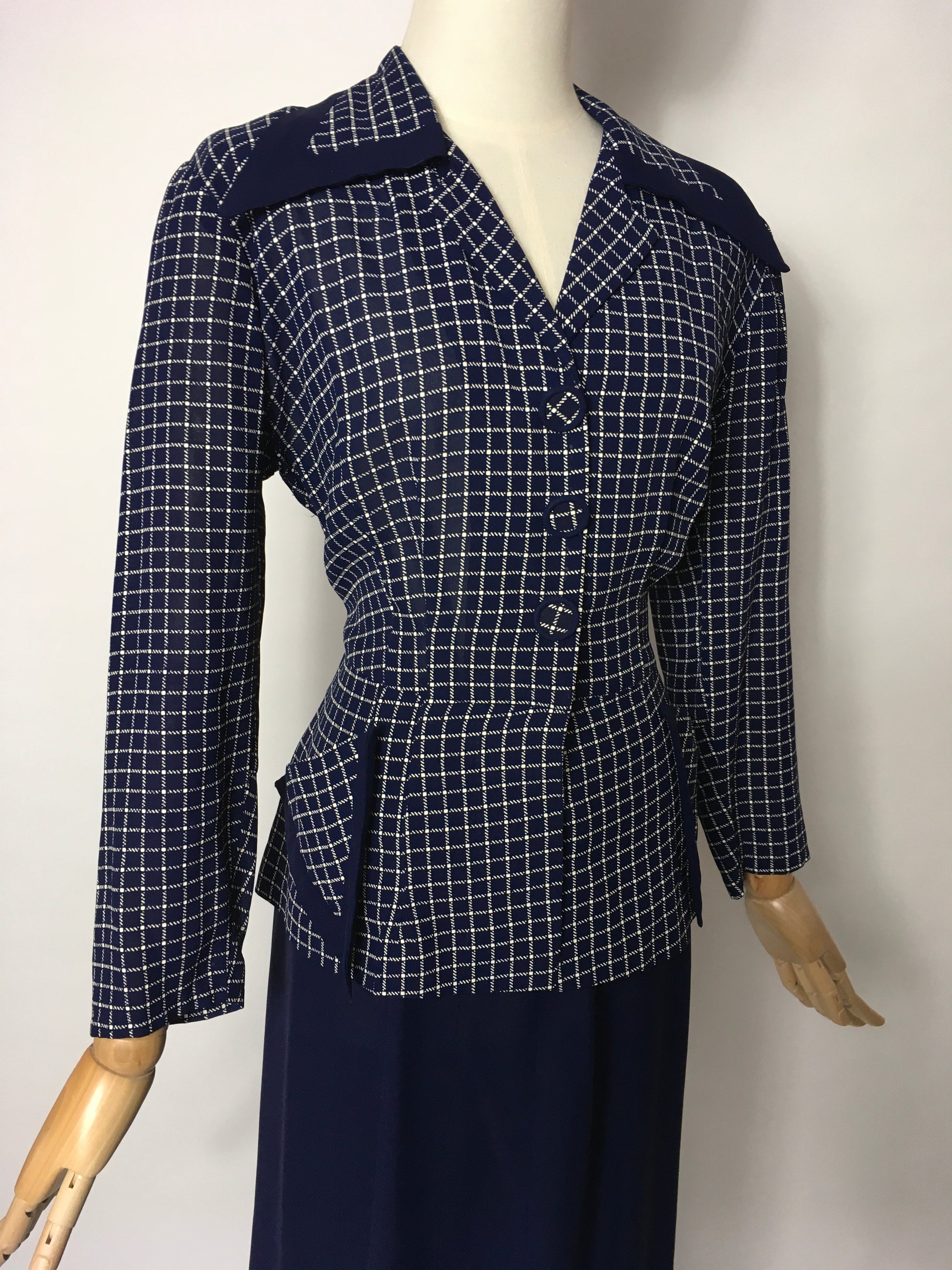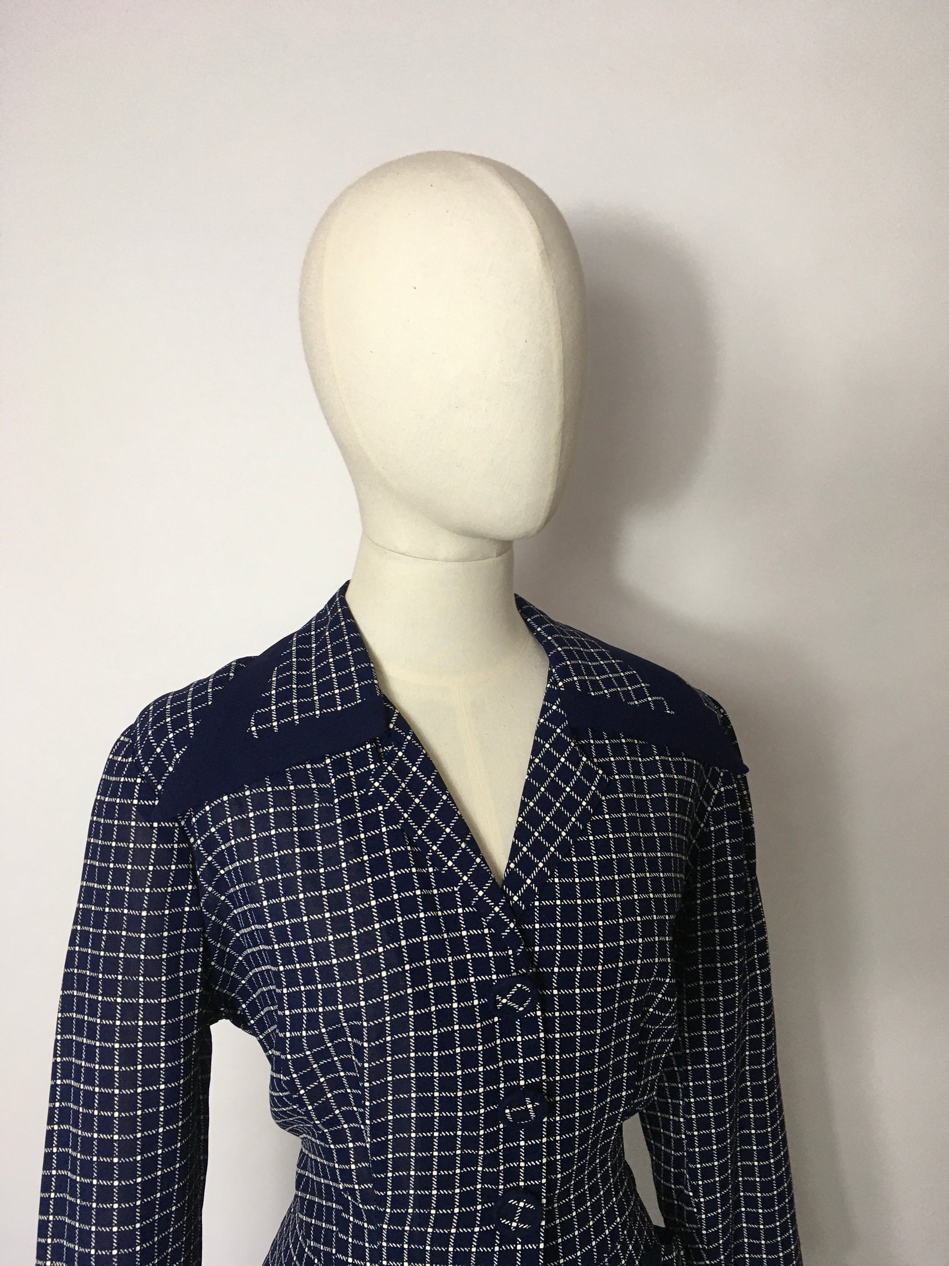 Vintage 1940’s illusion dress, which makes it look like a 2pc suit. In the most fabulous contrast Navy and White check and plain Navy rayon. Featuring sharp pointed collar, faux press stud buttons, peplum details with pockets and shoulder pads. The dress fastens with a metal zip to the front and press studs to the bodice.