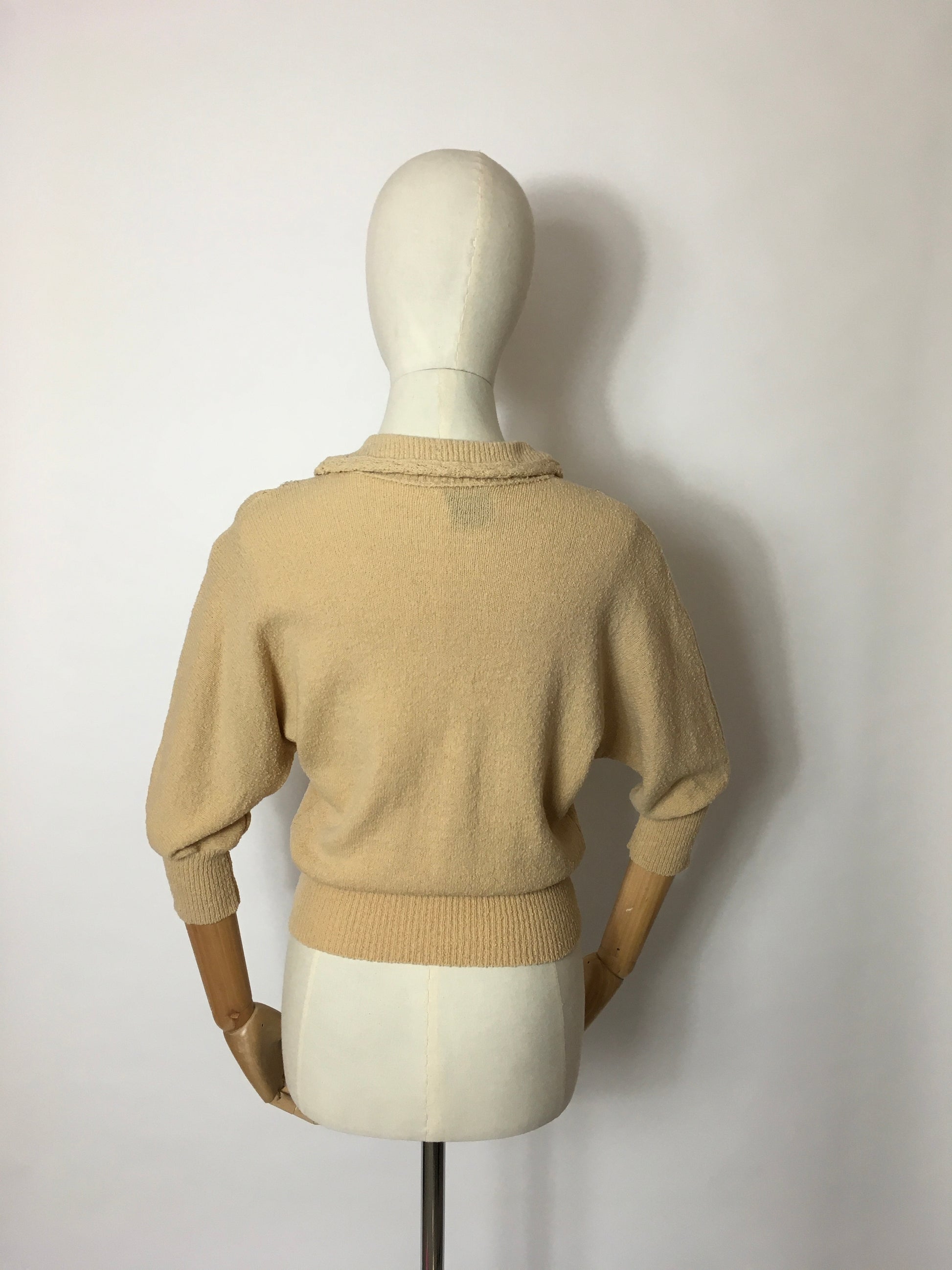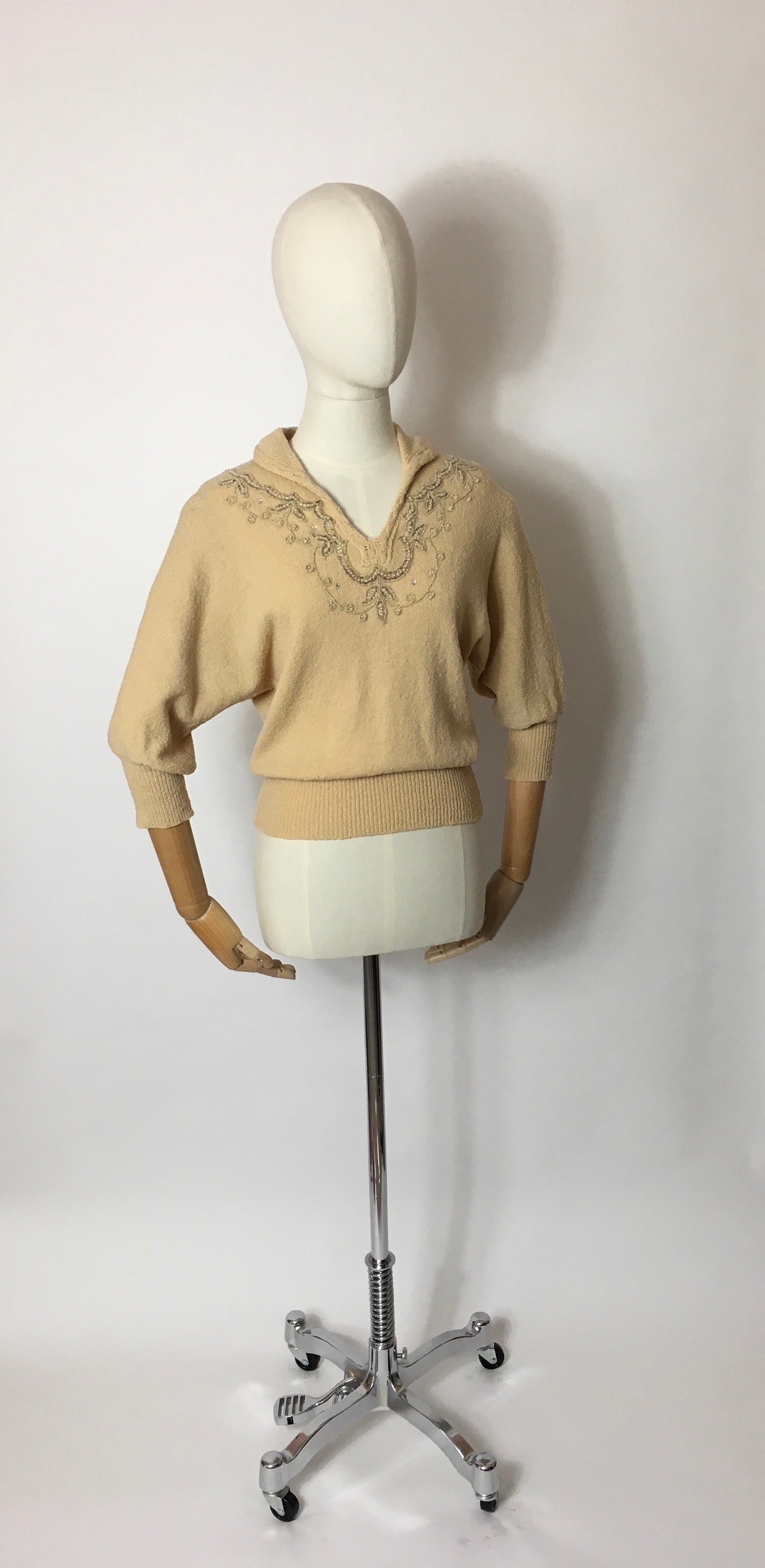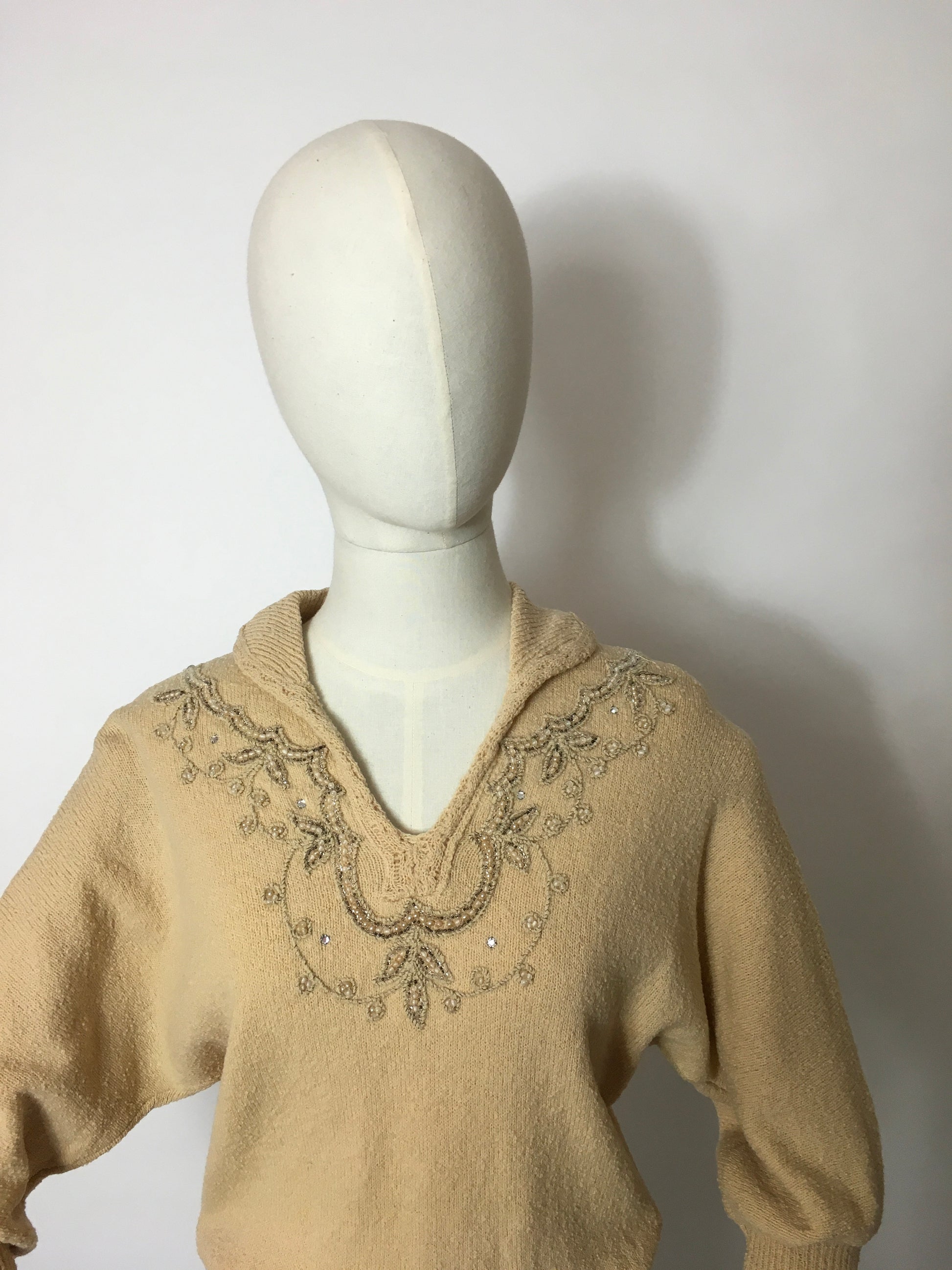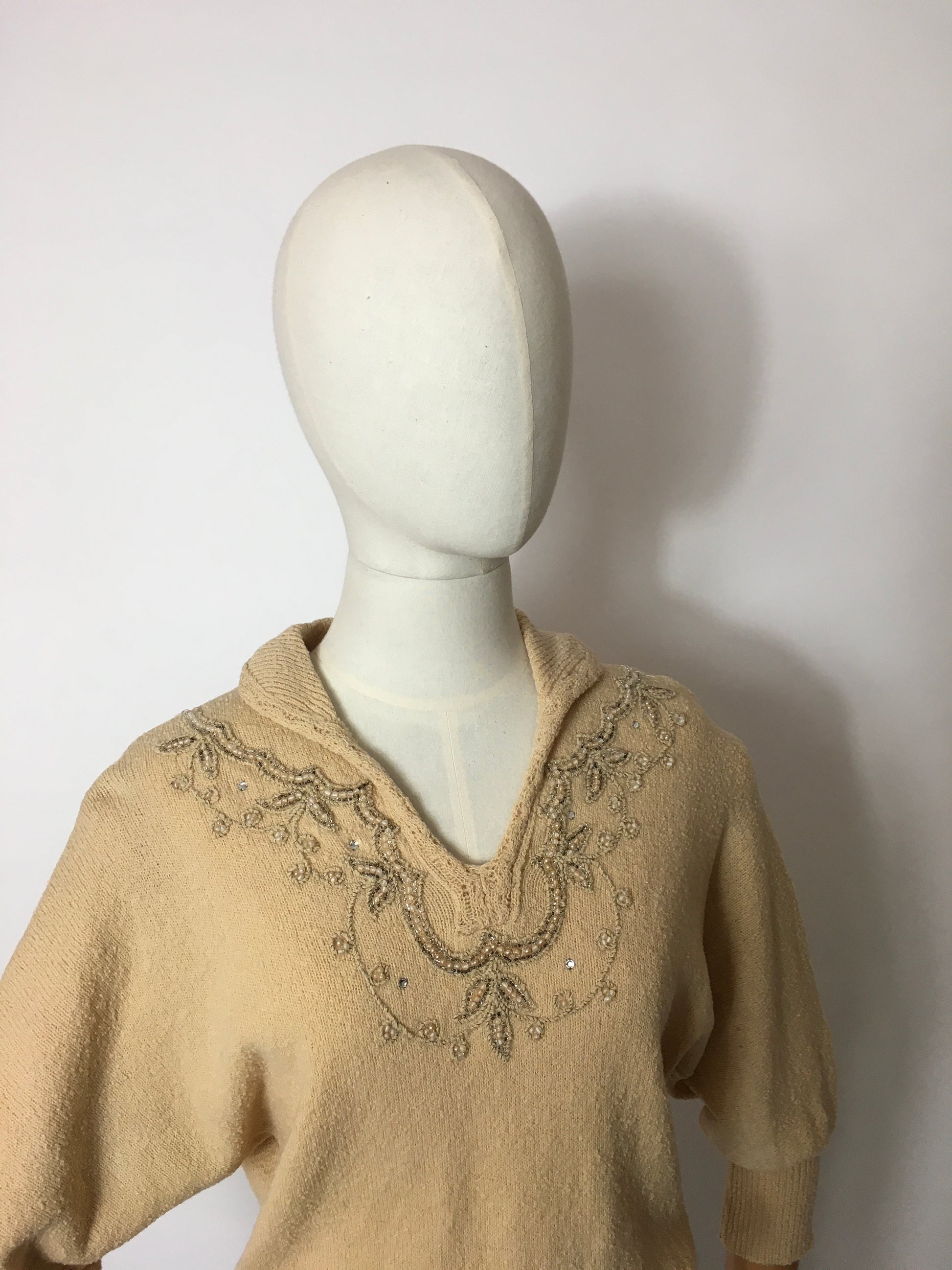 Vintage 1940’s American Knitted Jumper featuring shaped collar, dolman sleeve and fitted waist. Adorned with beautiful beadwork, layered on top of the most buttery cream wool base. A great casual piece with extra sparkle.
