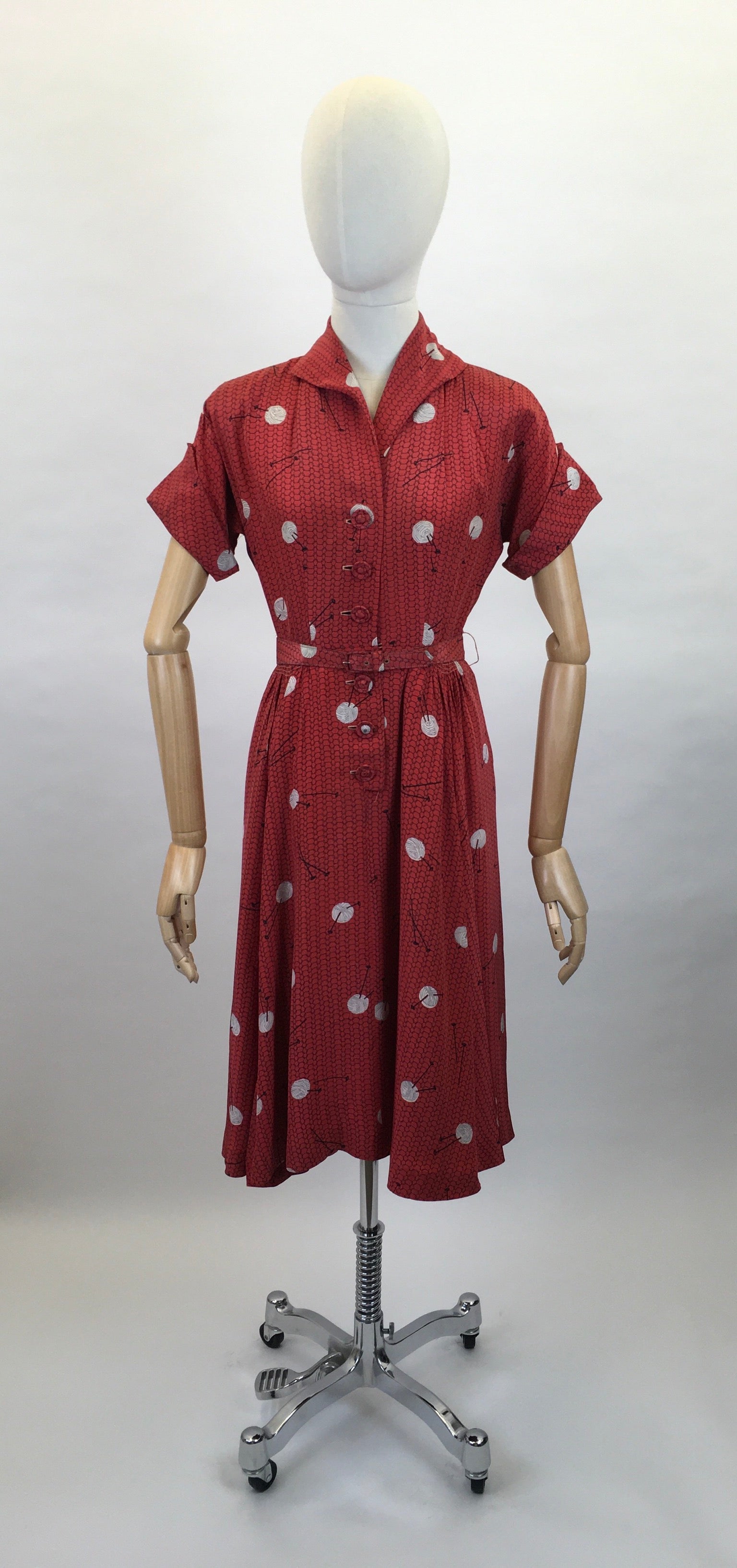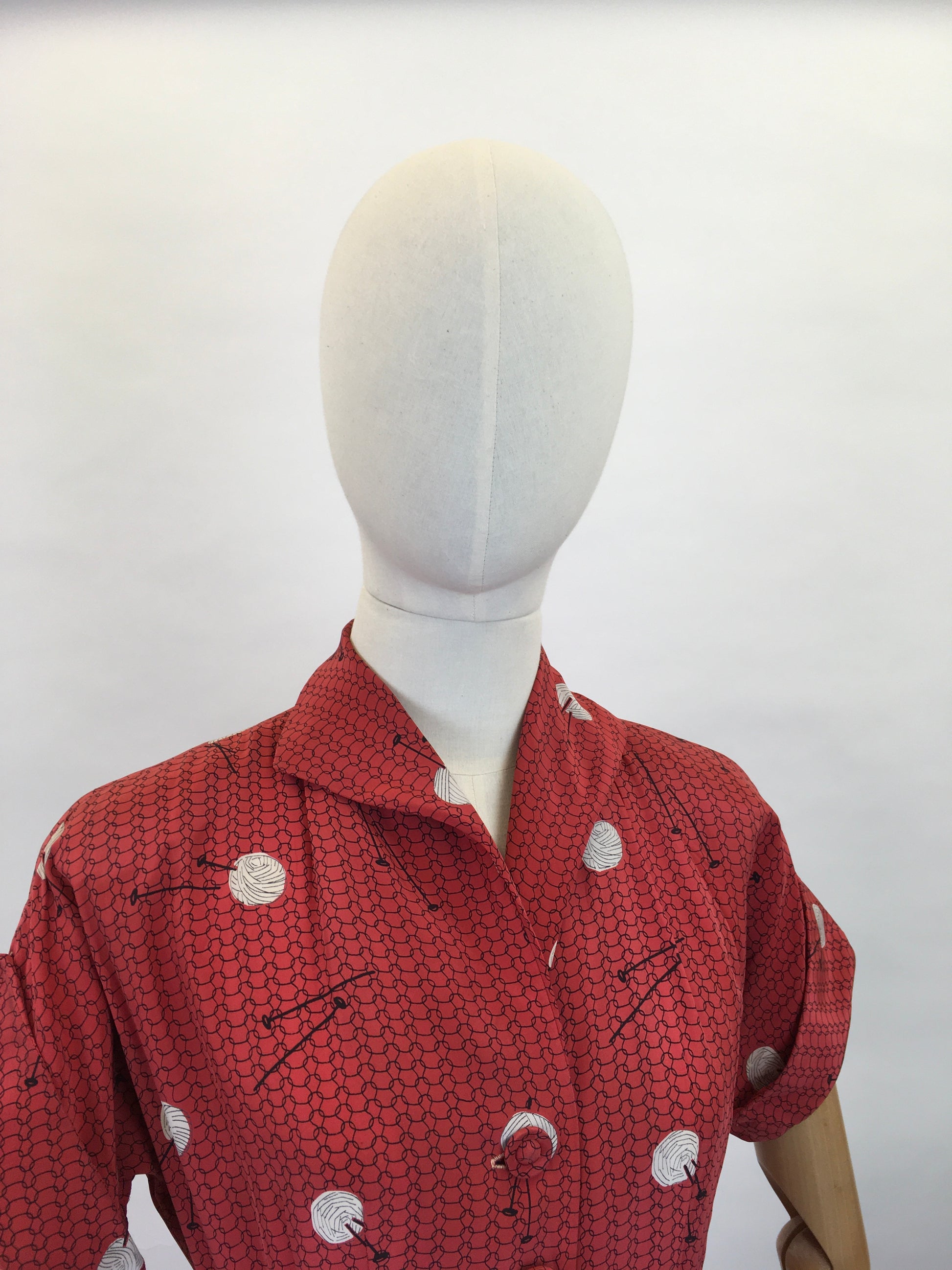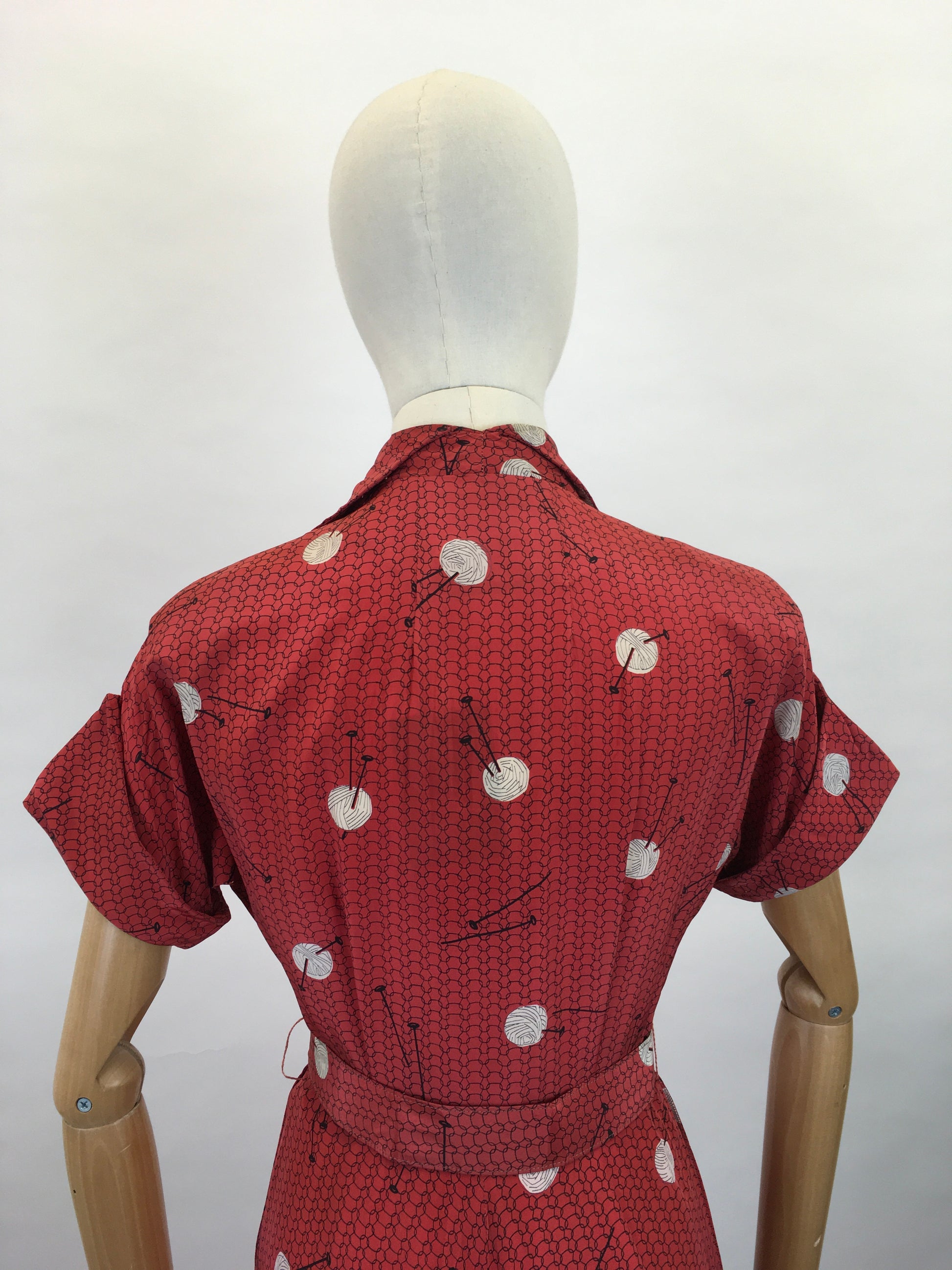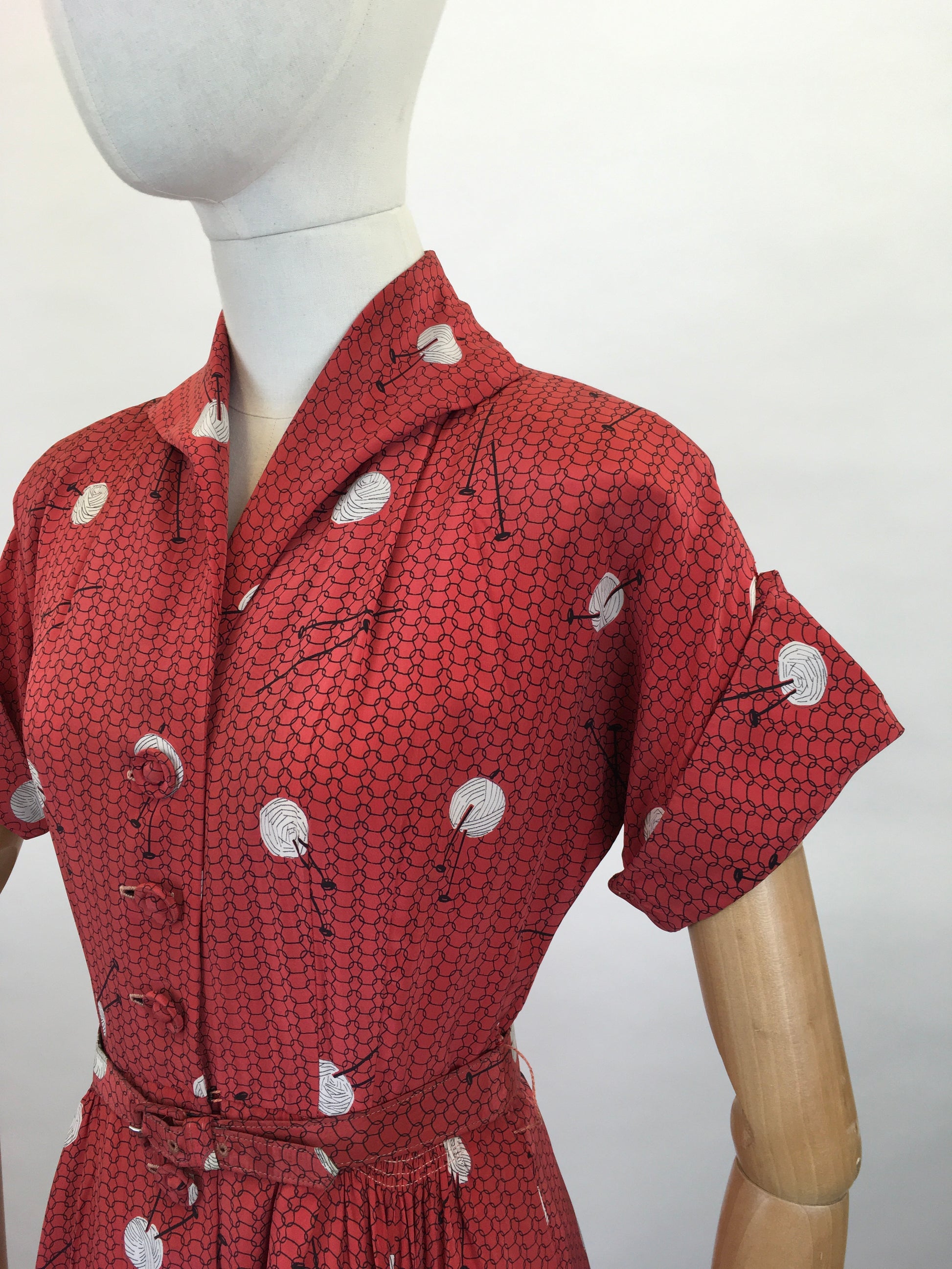 Vintage 1940s Stunning ‘ Leslie Fay’ rayon novelty print featuring knitting needles and balls of yarn. In a fabulously bright lipstick red with white and black motifs. A classic 1940’s silhouette this dress has a lovely shaped collar, short sleeve with turn back cuff, button front with pleated skirt. The dress also has its original belt. The dress only opens with the buttons to the front so be mindful with measurements ( see below ). The piece has shoulder pads to accentuate that classic silhouette.