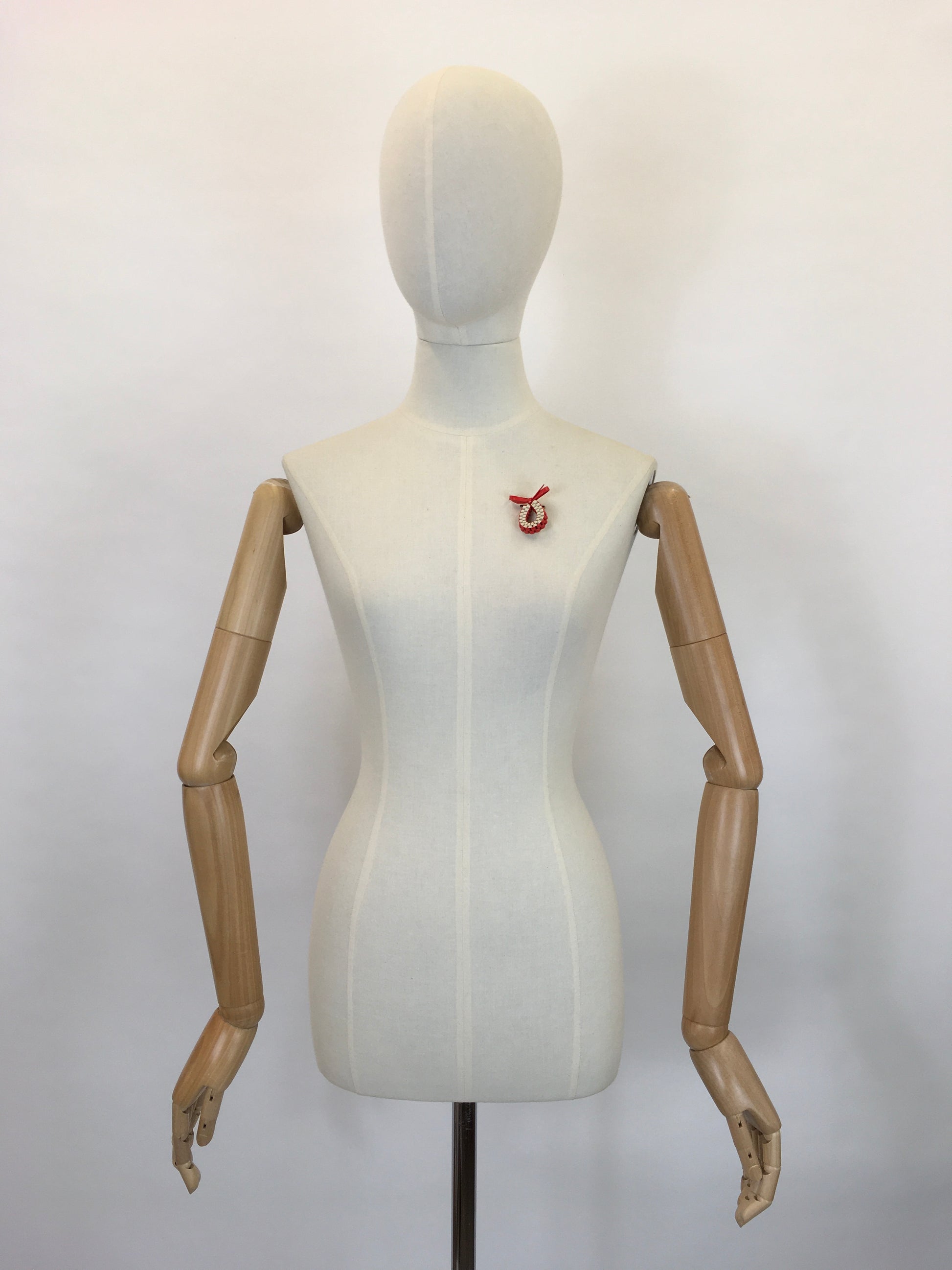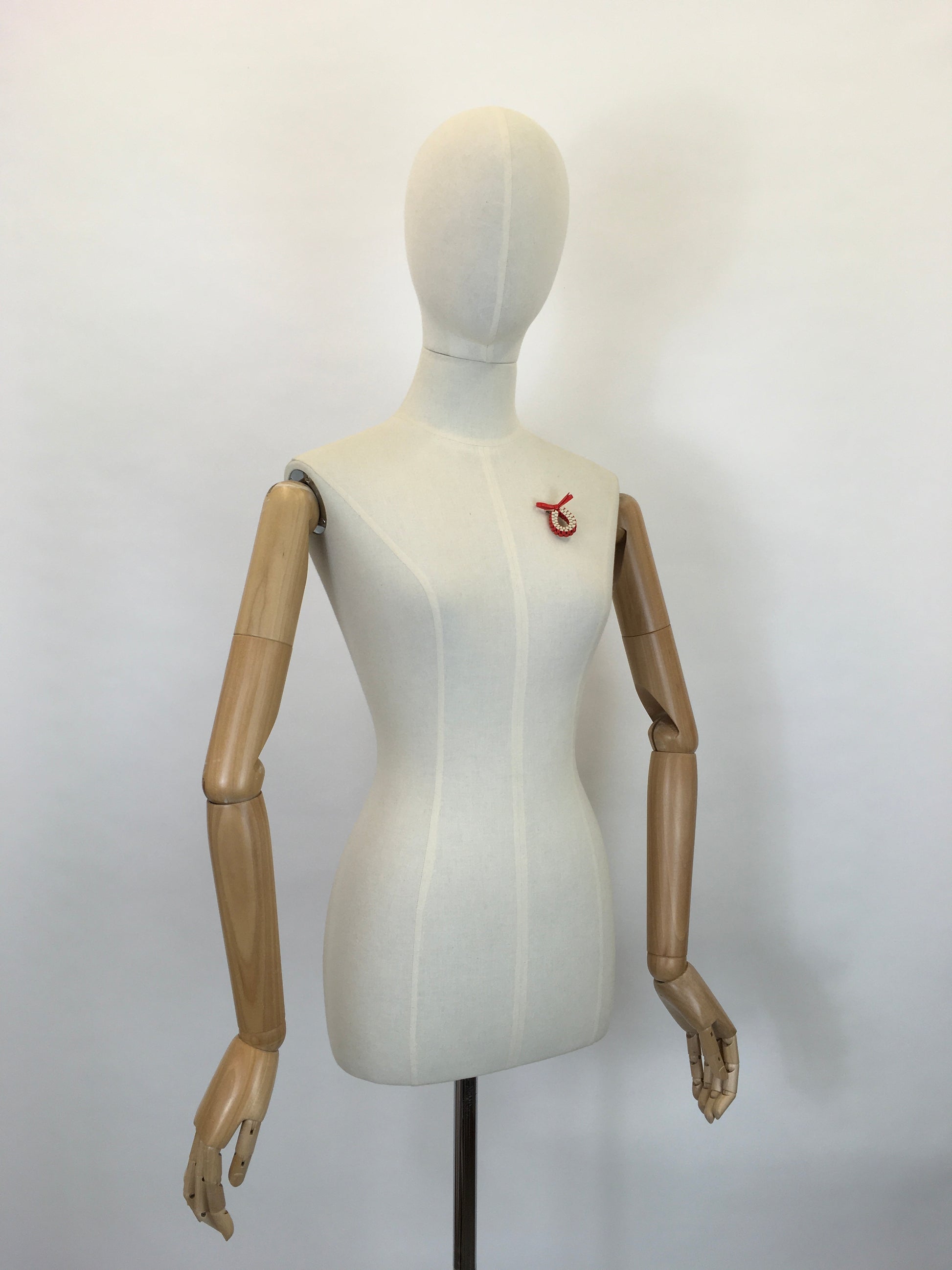 Vintage 1940’s Beautiful make do and mend era telephone cord brooch. It’s in a fabulous horseshoe shape with a bow to the top in red and white. A lovely statement piece to add to a cardigan, coat or lapel of a jacket. It has a safety pin fastening clasp which could be changed for a brooch bar if preferred. A lovely gift to yourself, a friend or someone special.
