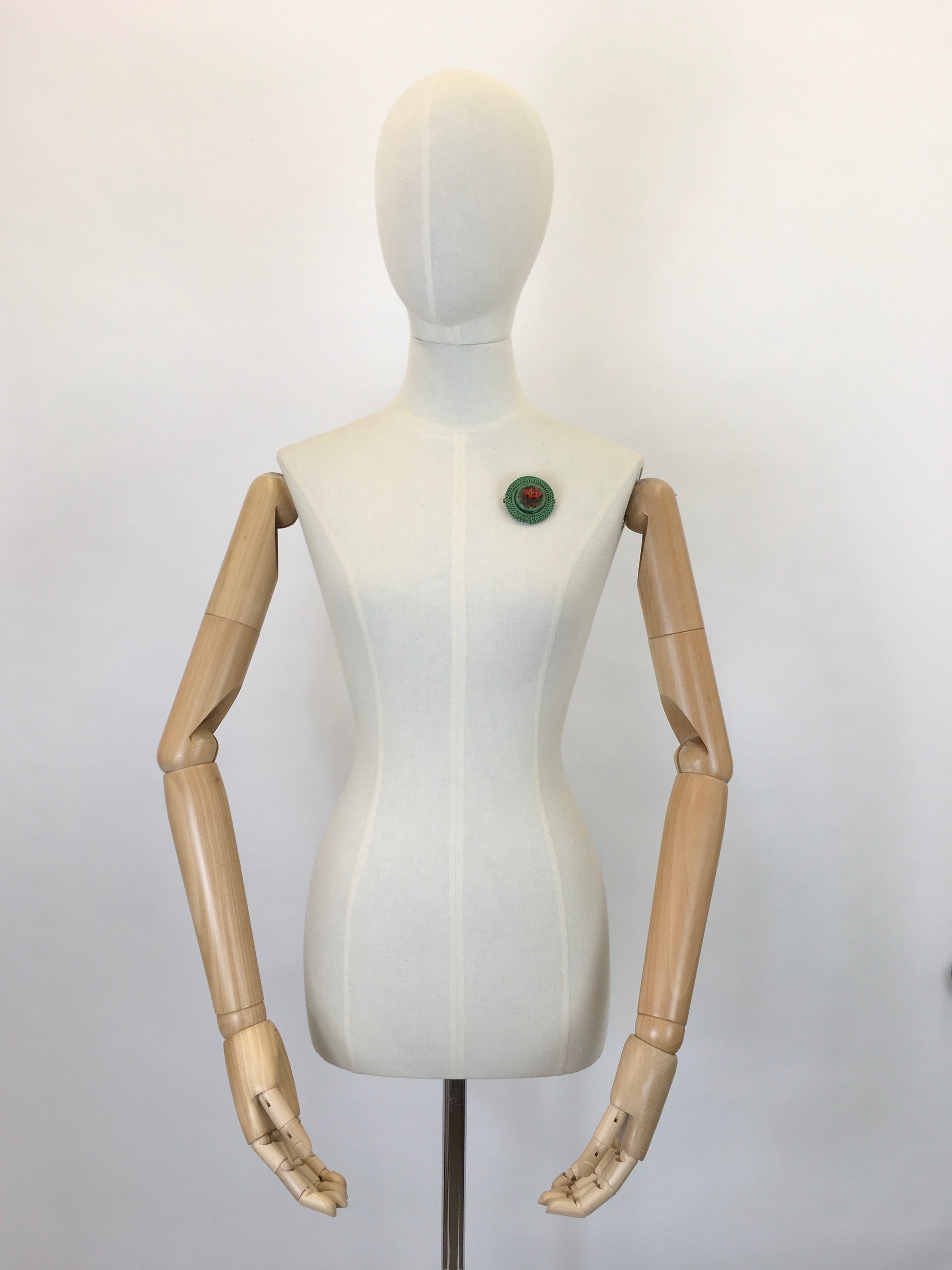 Vintage 1940’s make do and mend telephone wire and early plastic brooch in a beautiful festive colour pallet of red and green. Featuring a floral motif to the inside of the traditional wire surround. Fastens with a metal brooch backing. A lovely piece of 1940’s history to add to your collection. Great for wearing on a cardigan, lapel of a coat or jacket or even on a dress.
