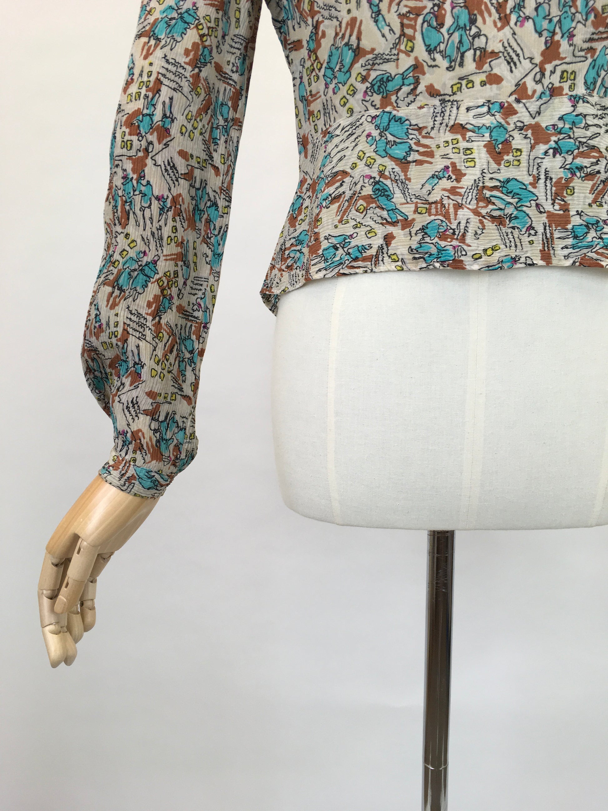 Original 1940’s ‘ Maxton’ Novelty Print Crepe Blouse - Featuring People, Buildings and Scribbles