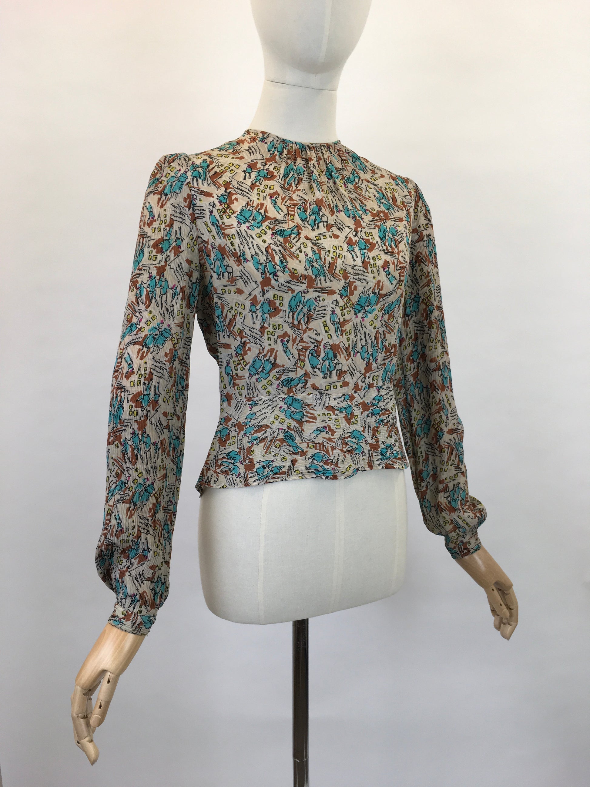 Vintage 1940s Stunning Novelty Print Blouse made my ‘ Maxton’. A label featured in lots of British war time fashions. Made from a beautiful crepe featuring lots of colours including soft fawns, Teal, purples, stencilled black and Ivory. The novelty print is amazing featuring people, buildings and scribbles. Created from a simple silhouette with high neck with pleating, puff shouldered long sleeves and a shaped hemline.