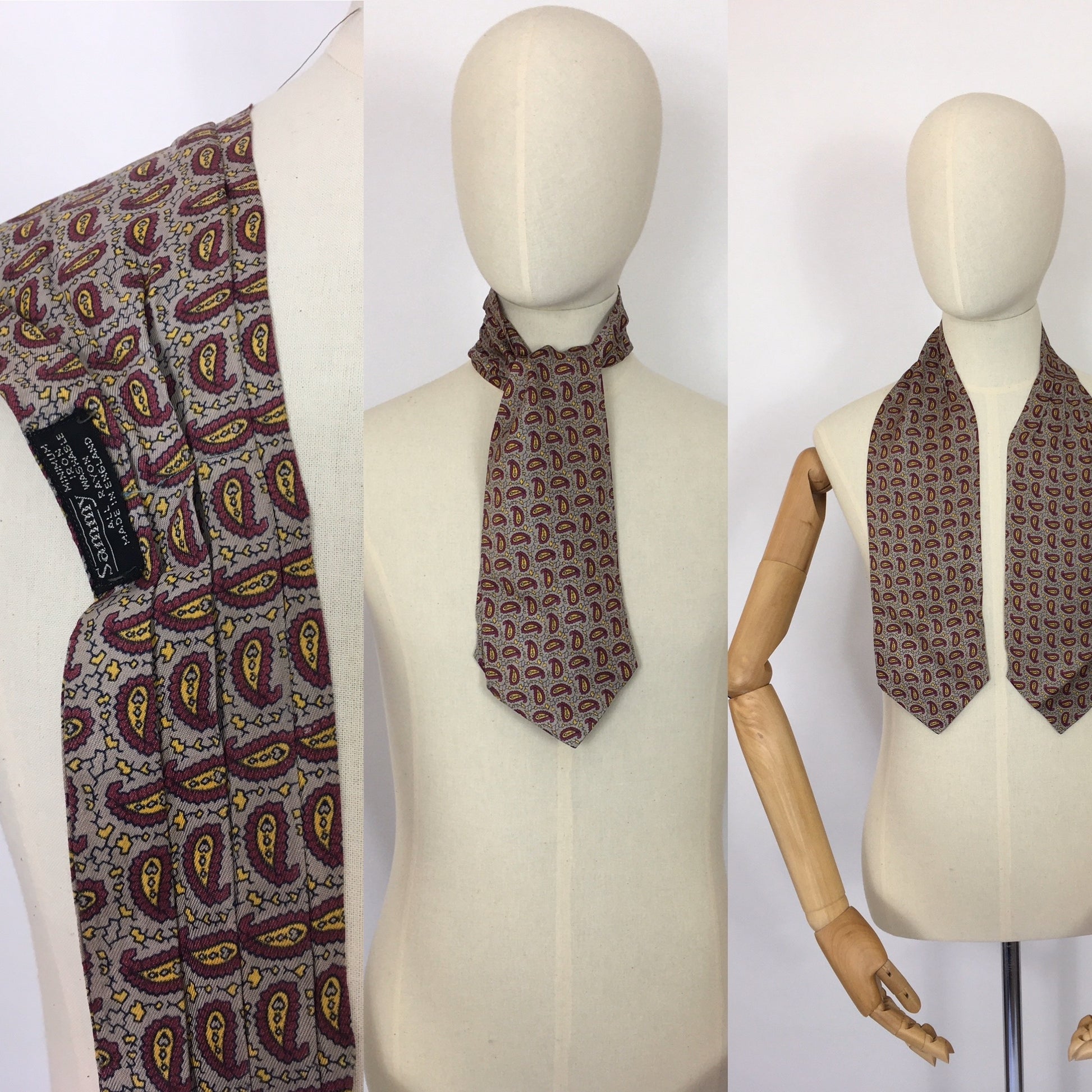 Vintage 1940’s ‘ Sammy ‘Rayon cravat in a lovely bright yellow and burgundy paisley print. Not without its flaws please see condition report but very wearable and a great addition for a vintage chap.