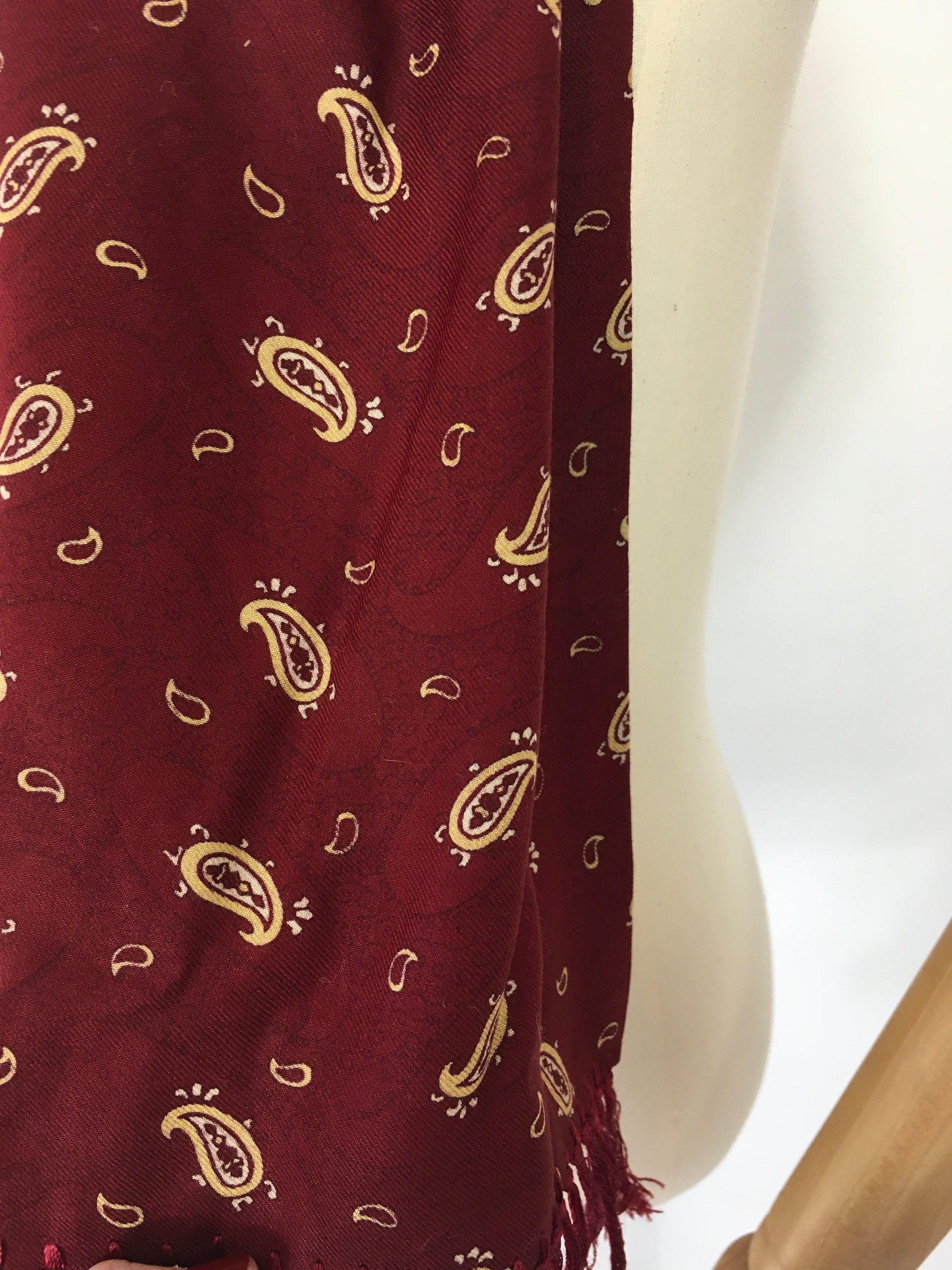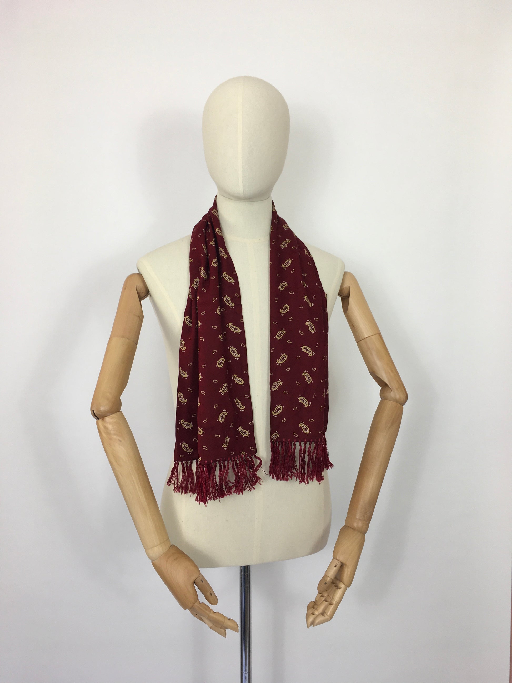 Vintage 1940’s Mens scarf in a lovely cotton silk mix in a burgundy, yellow and black paisley print. Trimmed with a tasseled edge.