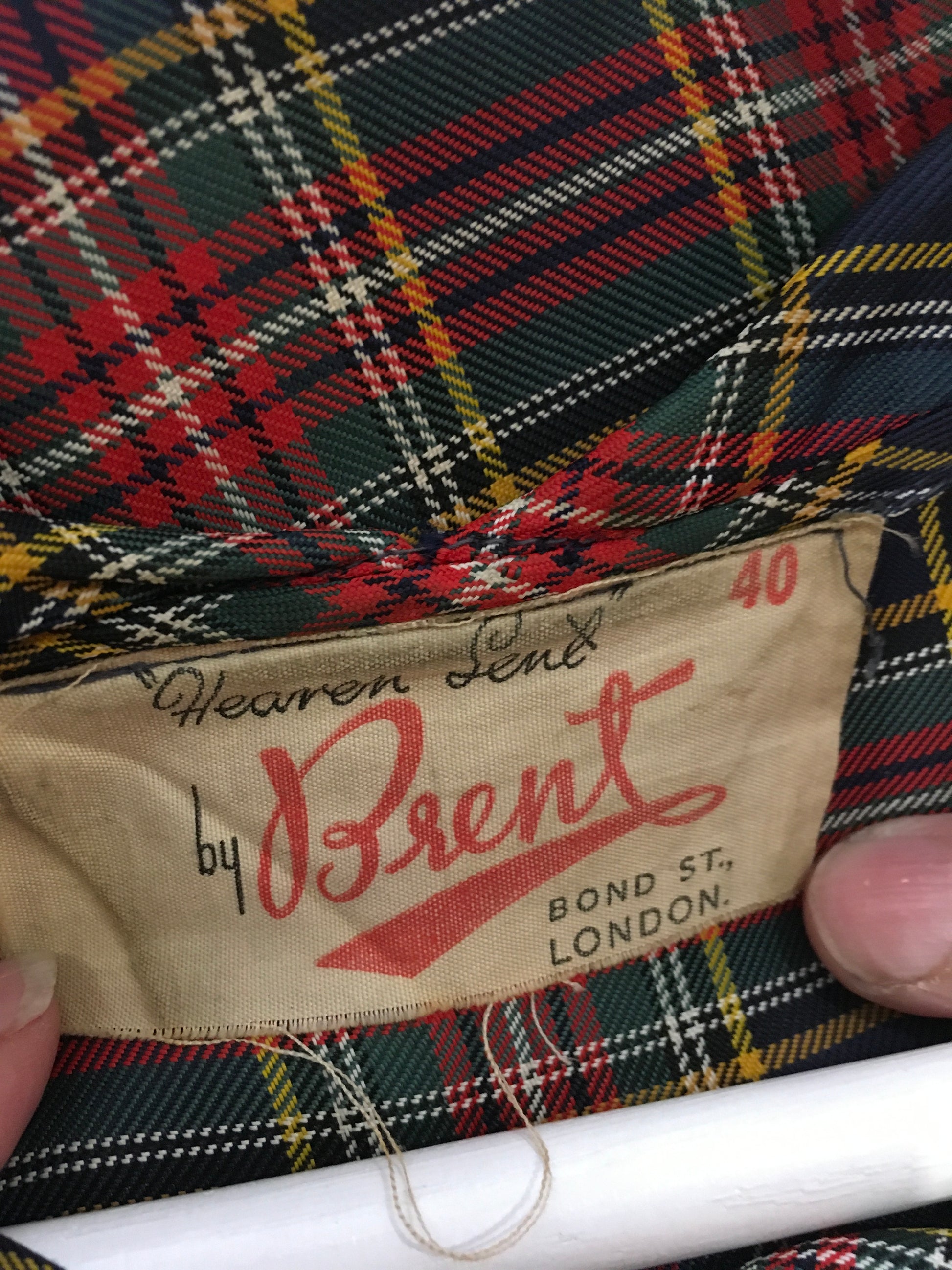 Vintage 1940’s Beautiful plaid dress made by ‘ Heaven Sent By Brent, London ‘. The dress has a lovely silhouette with dolman sleeve, button front and pleats to the skirt. The dress fastens with a metal side zip. Has belt loops but missing original belt but could be worn with a contrasting colour to pick out a colour in the plaid with matching accessories. The dress features rich blues, rich golds, burgundy’s and green. A beautiful piece to add to a collection.