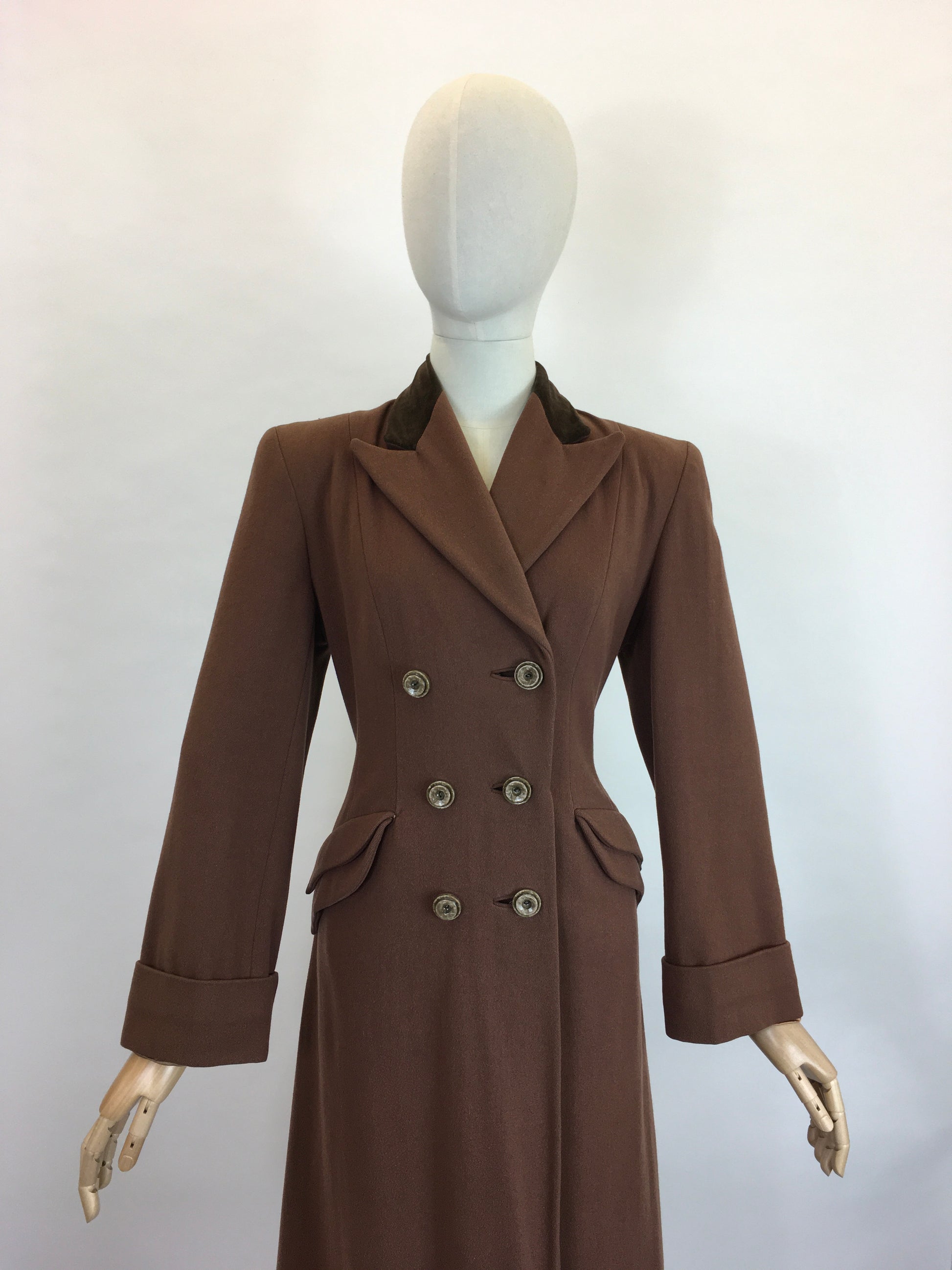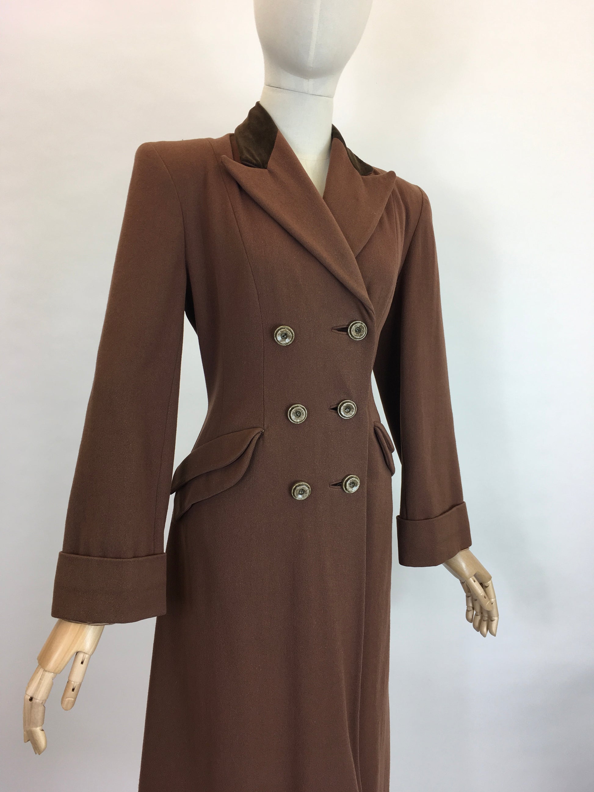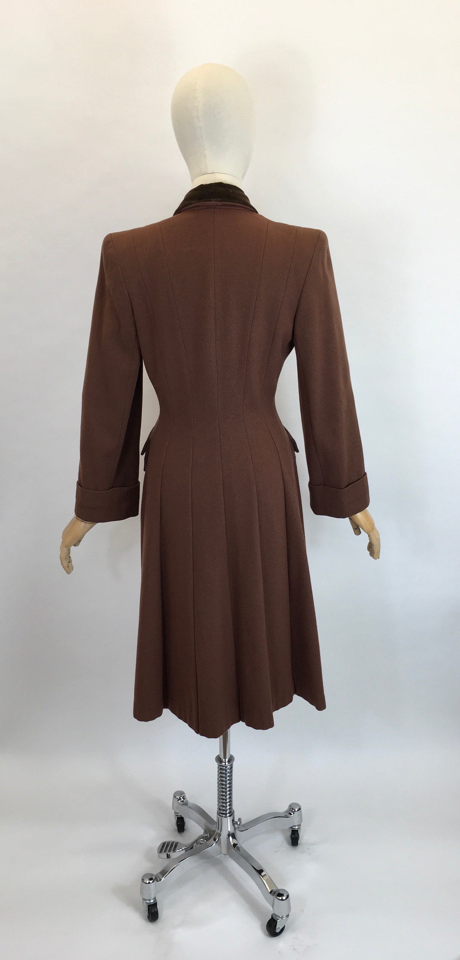 Vintage 1940’s SENSATIONAL brown coat. Made from a beautiful soft brown wool with a rich brown velvet trim to the collar. This piece is a stunning example of a classic utilitarian 40’s silhouette featuring strong shoulder line, collar, double breasted front with buttons, shaped pockets, full length sleeve with turn back cuff. A stunning example of its time and very versatile to layer with dresses and suits or even separates.